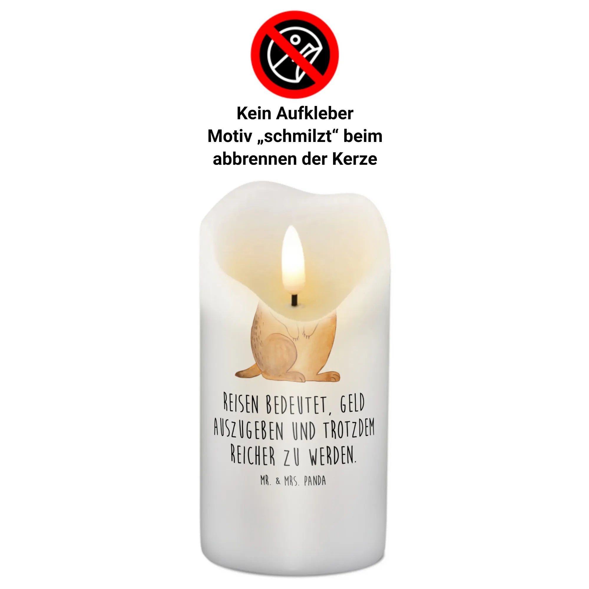 Das Design zeigt ein süßes, neugieriges Erdmännchen — das Symbol für Abenteuerlust und Neugierde. Verdeutlicht durch den Spruch: „Reisen bedeutet, Geld auszugeben und trotzdem reicher zu werden.“ Zudem schmilzt das Motiv beim Abbrennen der Kerze, was für einen einzigartigen Effekt sorgt und jeden Moment noch besonderer macht.