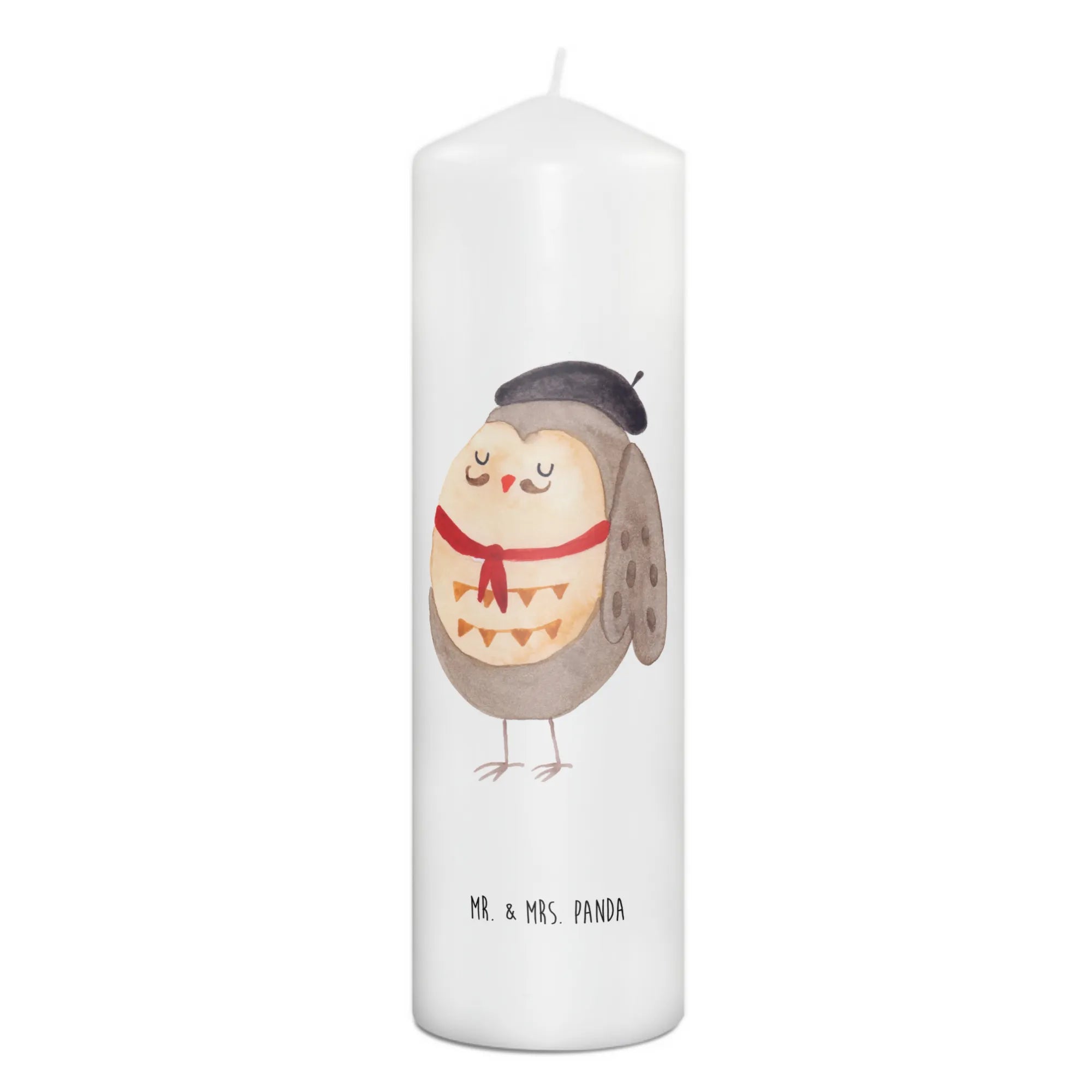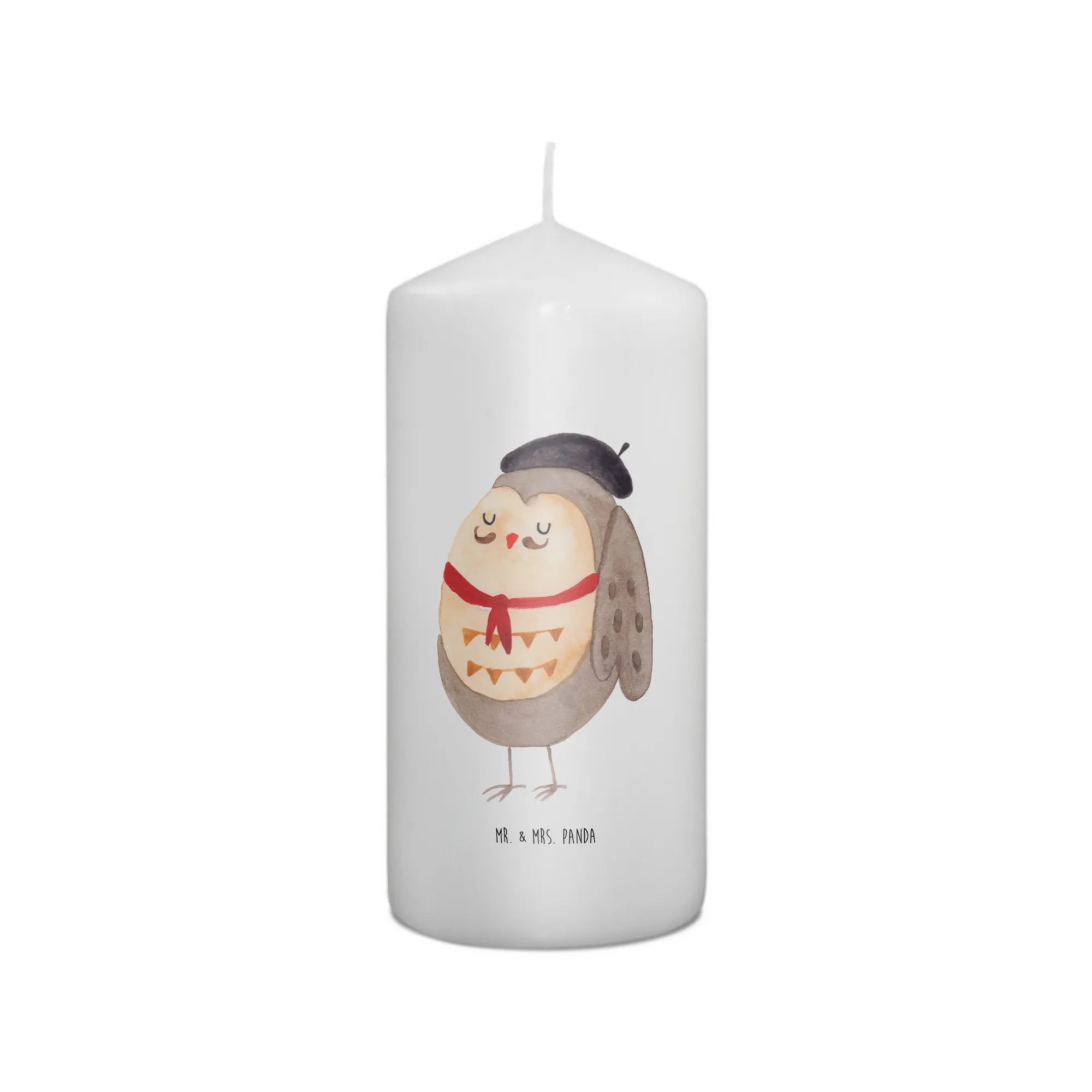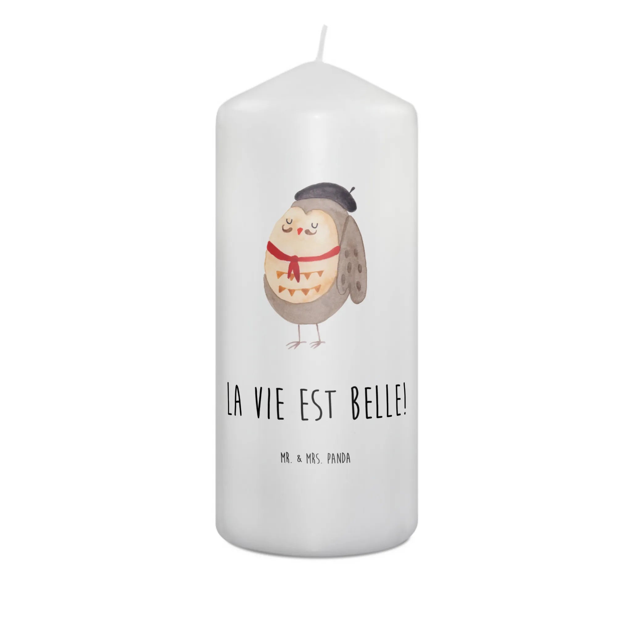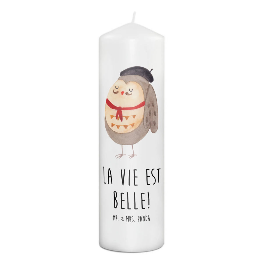 \nHergestellt aus hochwertigem Paraffinwachs und mit einer ultralangen Brenndauer ausgestattet, sorgt diese Kerze für eine heimelige Atmosphäre. Das wundervolle Eulen-Motiv, das ganz liebevoll von Mrs. Panda handgezeichnet wurde, sorgt dafür, dass diese Kerze nicht nur ein Genuss für die Sinne ist, sondern auch zum Staunen einlädt. Die Eule präsentiert sich in einem charmanten französischen Look mit Hut und Fliege und lässt dich träumen.