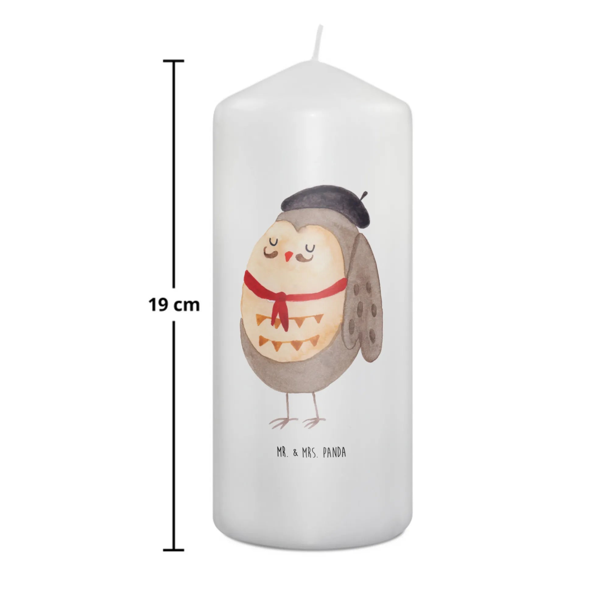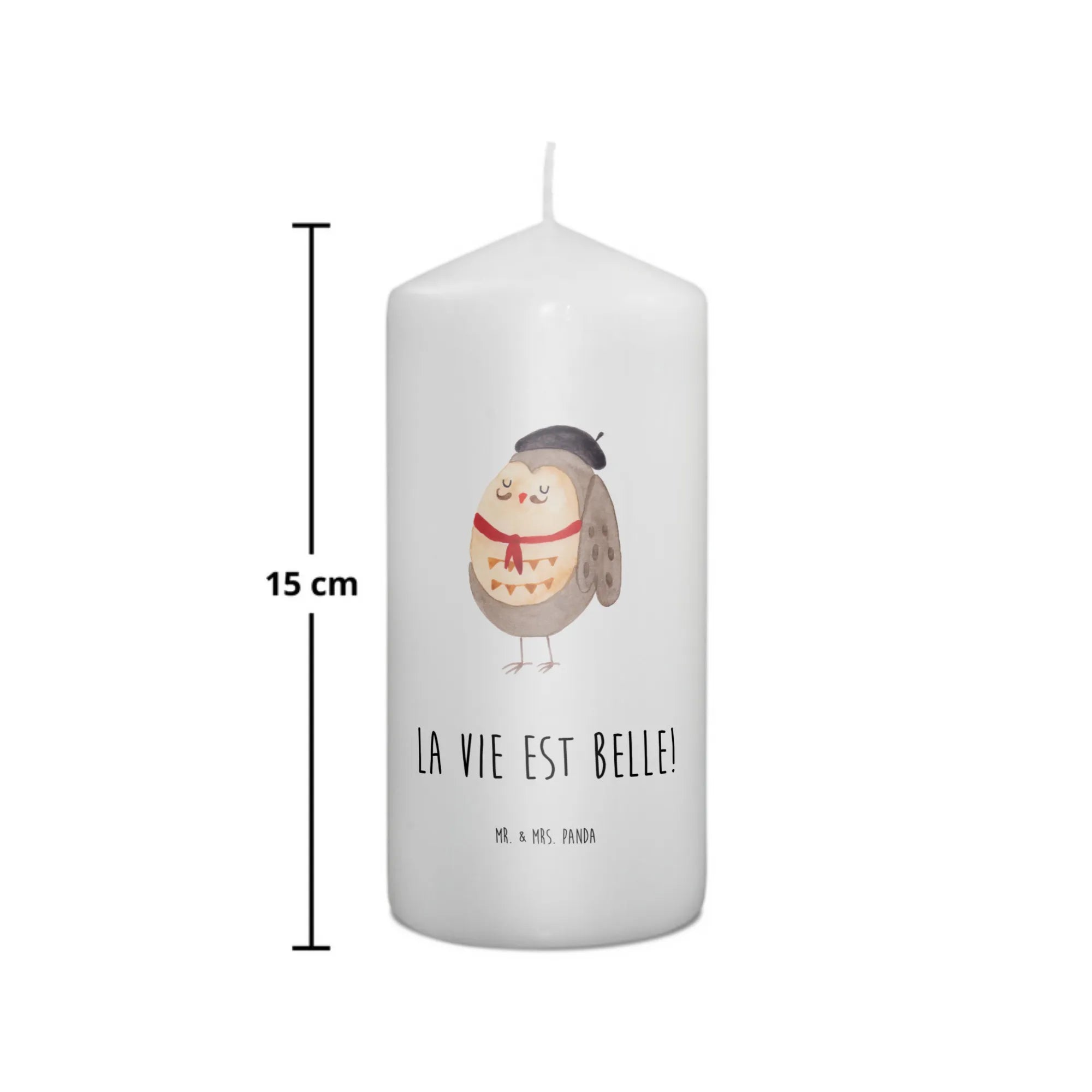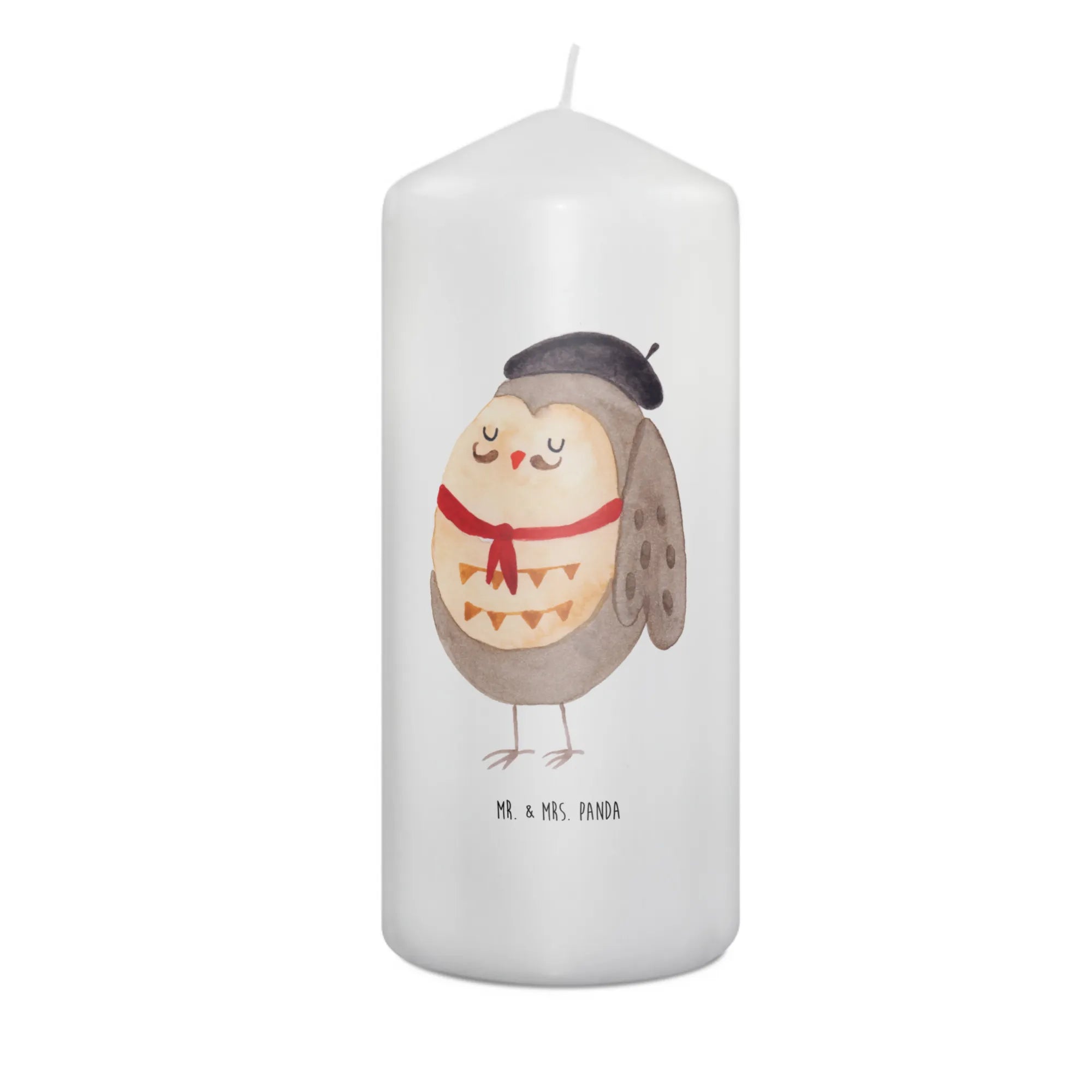 \nHergestellt aus hochwertigem Paraffinwachs und mit einer ultralangen Brenndauer ausgestattet, sorgt diese Kerze für eine heimelige Atmosphäre. Das wundervolle Eulen-Motiv, das ganz liebevoll von Mrs. Panda handgezeichnet wurde, sorgt dafür, dass diese Kerze nicht nur ein Genuss für die Sinne ist, sondern auch zum Staunen einlädt. Die Eule präsentiert sich in einem charmanten französischen Look mit Hut und Fliege und lässt dich träumen.