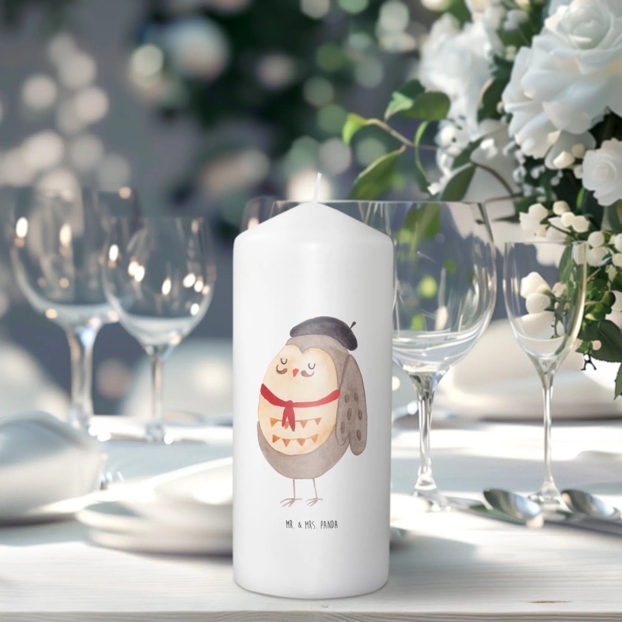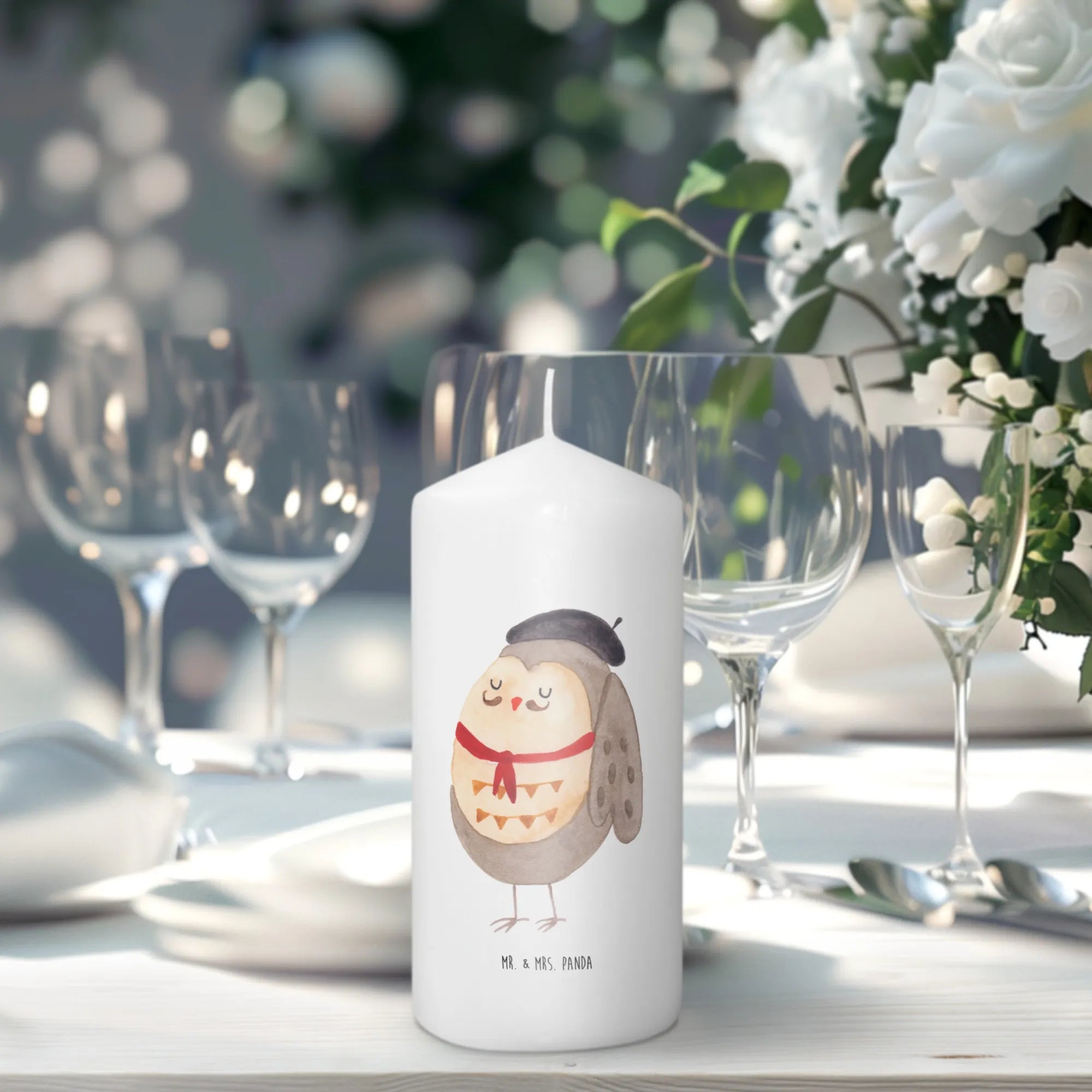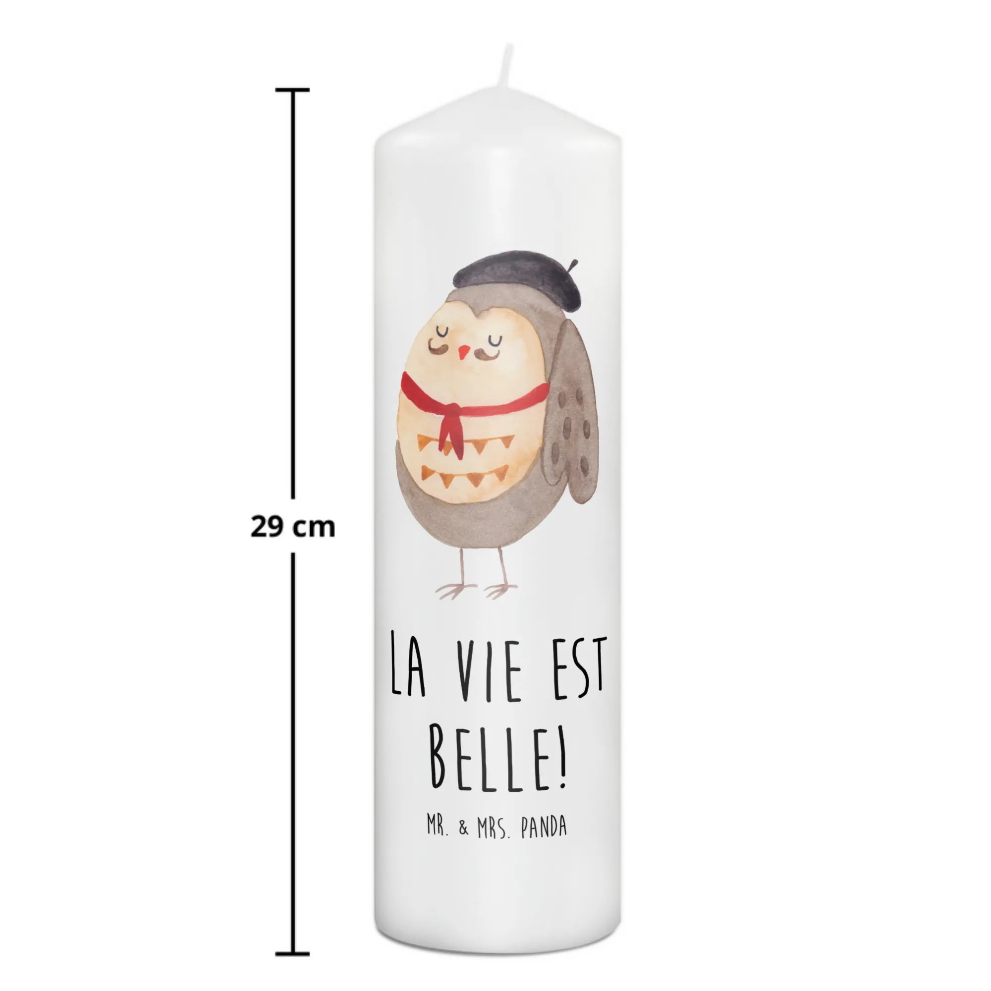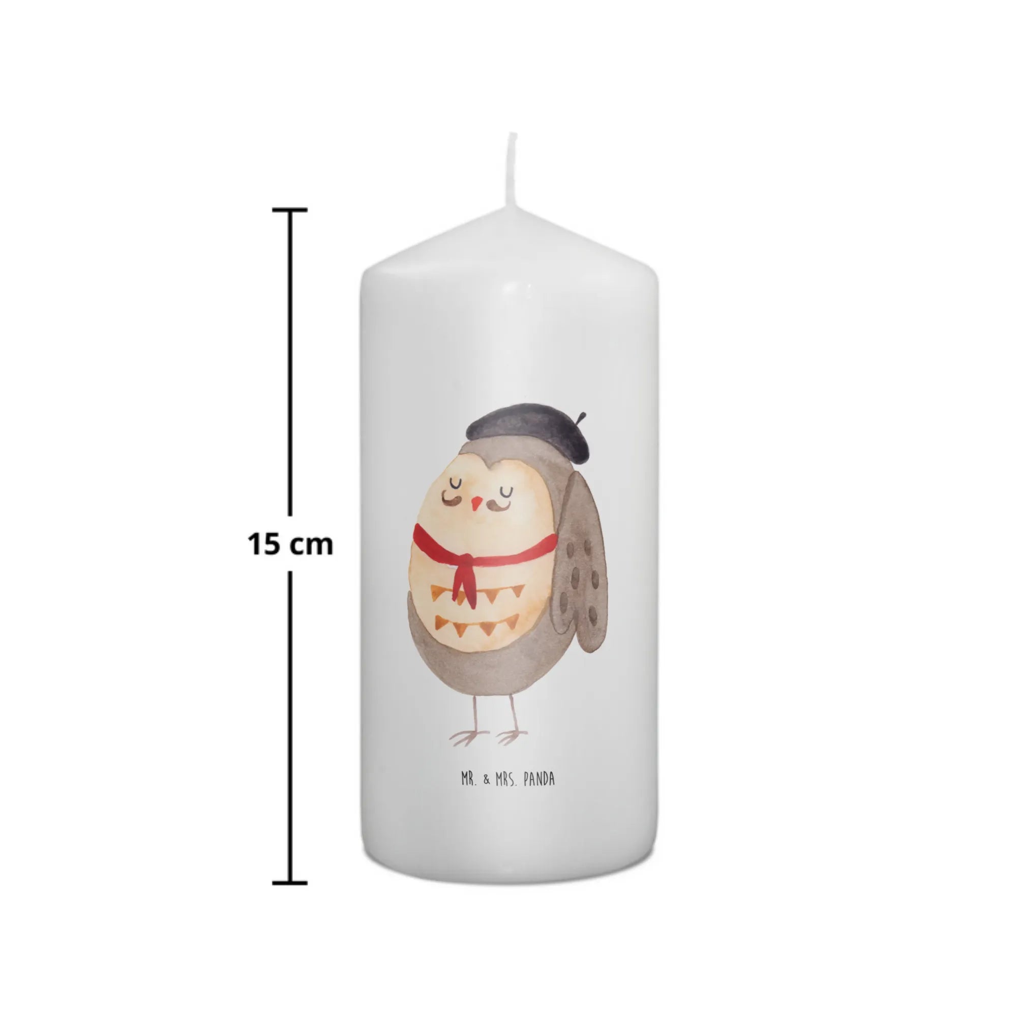 \nHergestellt aus hochwertigem Paraffinwachs und mit einer ultralangen Brenndauer ausgestattet, sorgt diese Kerze für eine heimelige Atmosphäre. Das wundervolle Eulen-Motiv, das ganz liebevoll von Mrs. Panda handgezeichnet wurde, sorgt dafür, dass diese Kerze nicht nur ein Genuss für die Sinne ist, sondern auch zum Staunen einlädt. Die Eule präsentiert sich in einem charmanten französischen Look mit Hut und Fliege und lässt dich träumen.