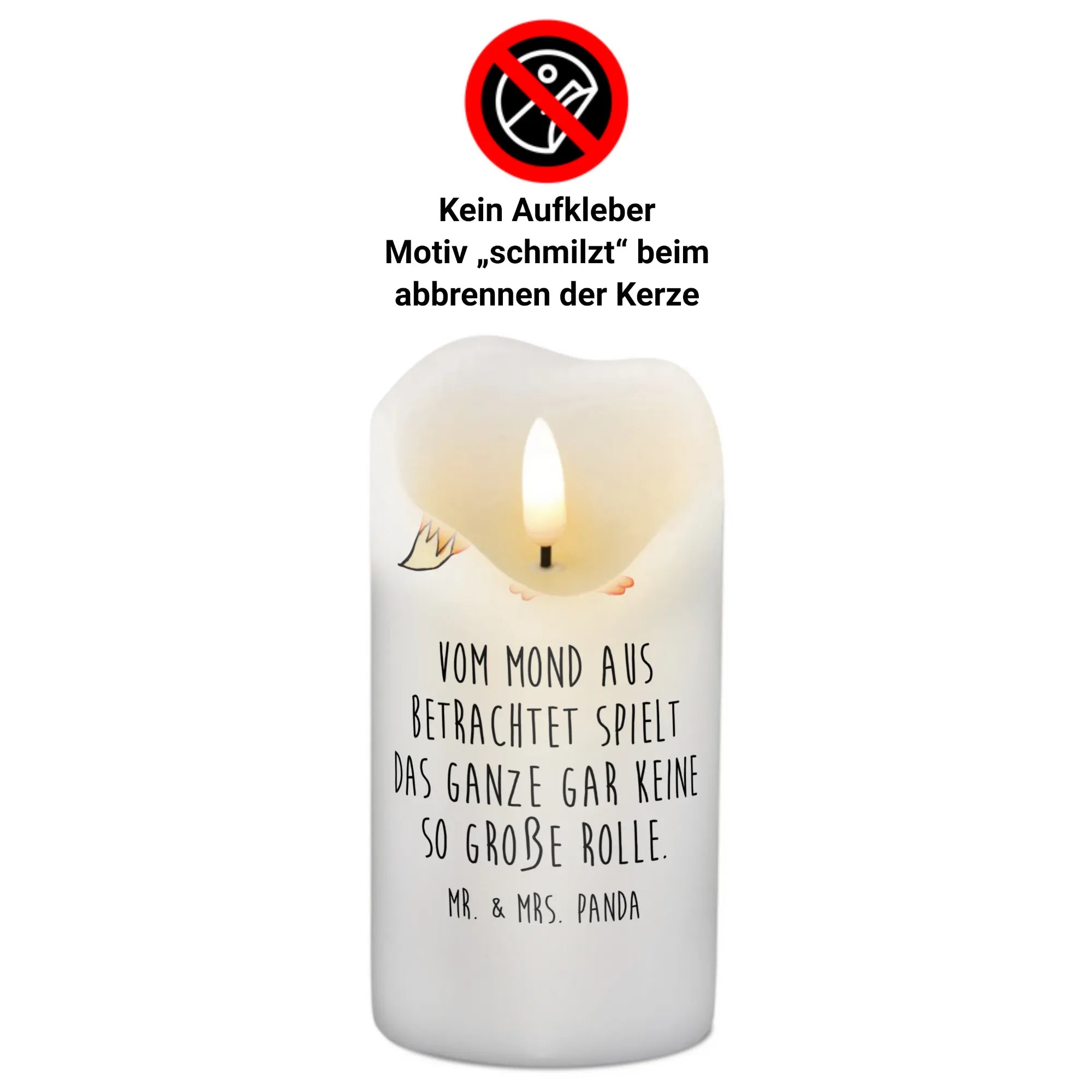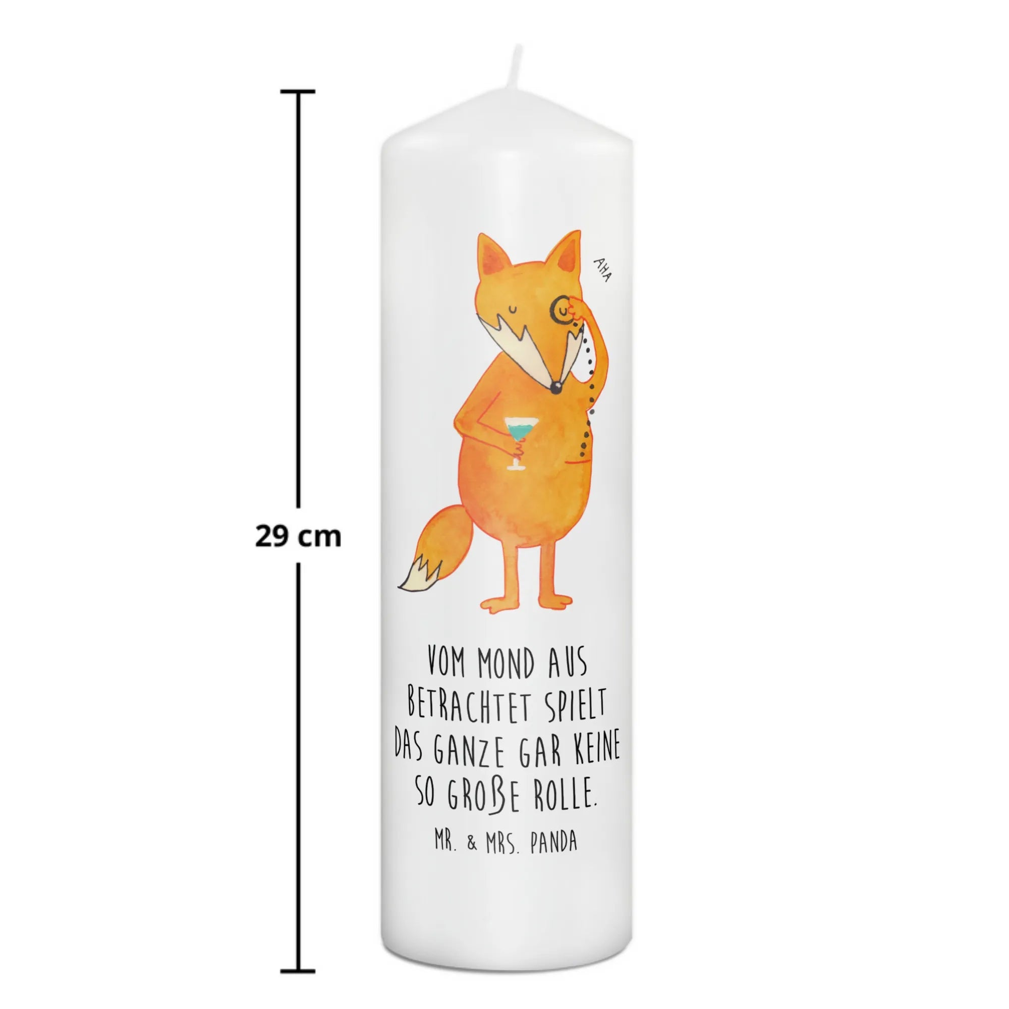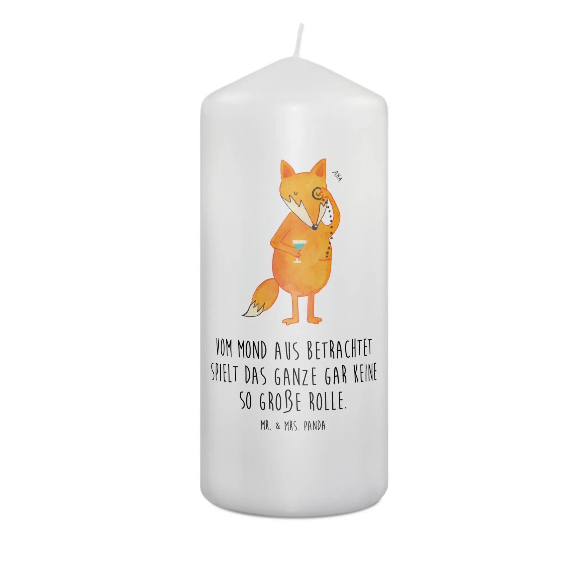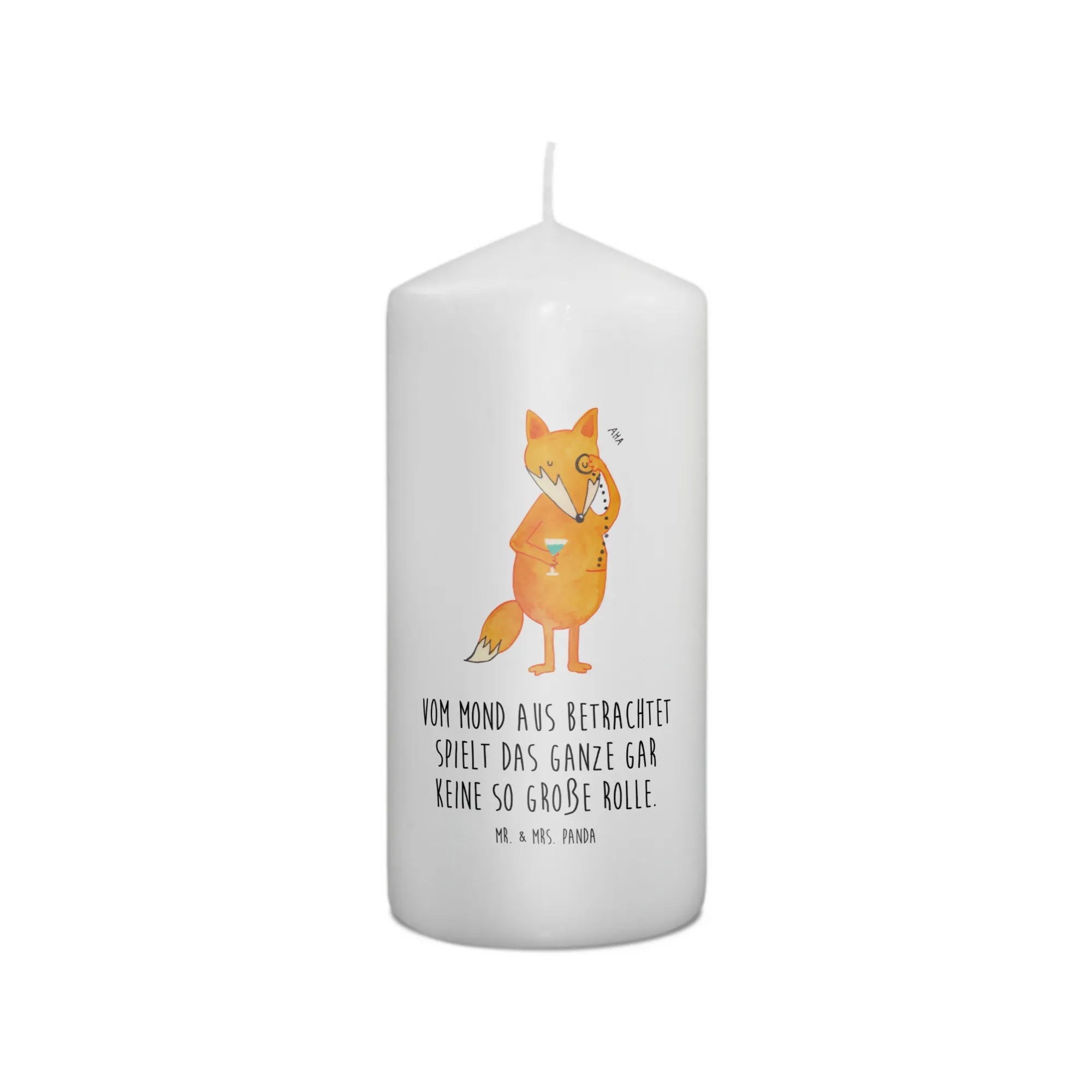 Der Fuchs auf dieser Kerze, mit einem charmanten Monokel, bringt nicht nur Freude, sondern auch tröstende Worte. Ihr persönlicher Spruch "Vom Mond aus betrachtet spielt das Ganze gar keine so große Rolle." regt zum Nachdenken und Träumen an.
