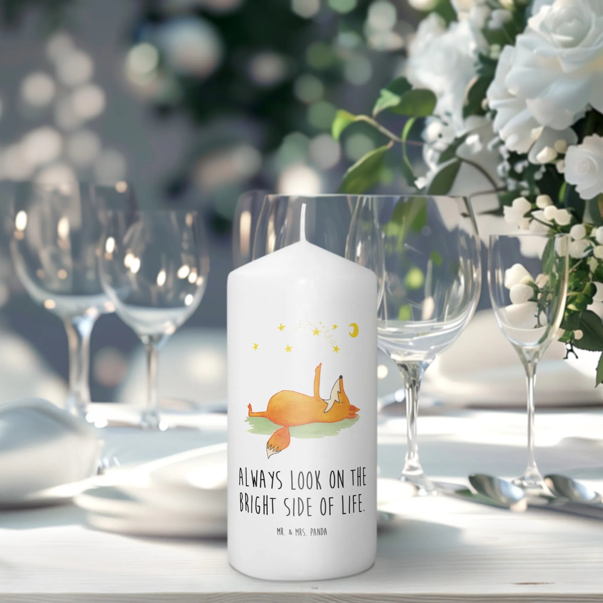 Das Motiv "Fuchs Sterne" ist nicht nur dekorativ, sondern auch ein kleiner Hoffnungsträger mit dem Spruch „Always look on the bright side of life“, der ein positives Gefühl vermittelt und zum Träumen einlädt. Ob auf dem Tisch, als Teil einer festlichen Dekoration oder als wunderbares Taufgeschenk – die Kerze setzt besondere Akzente!