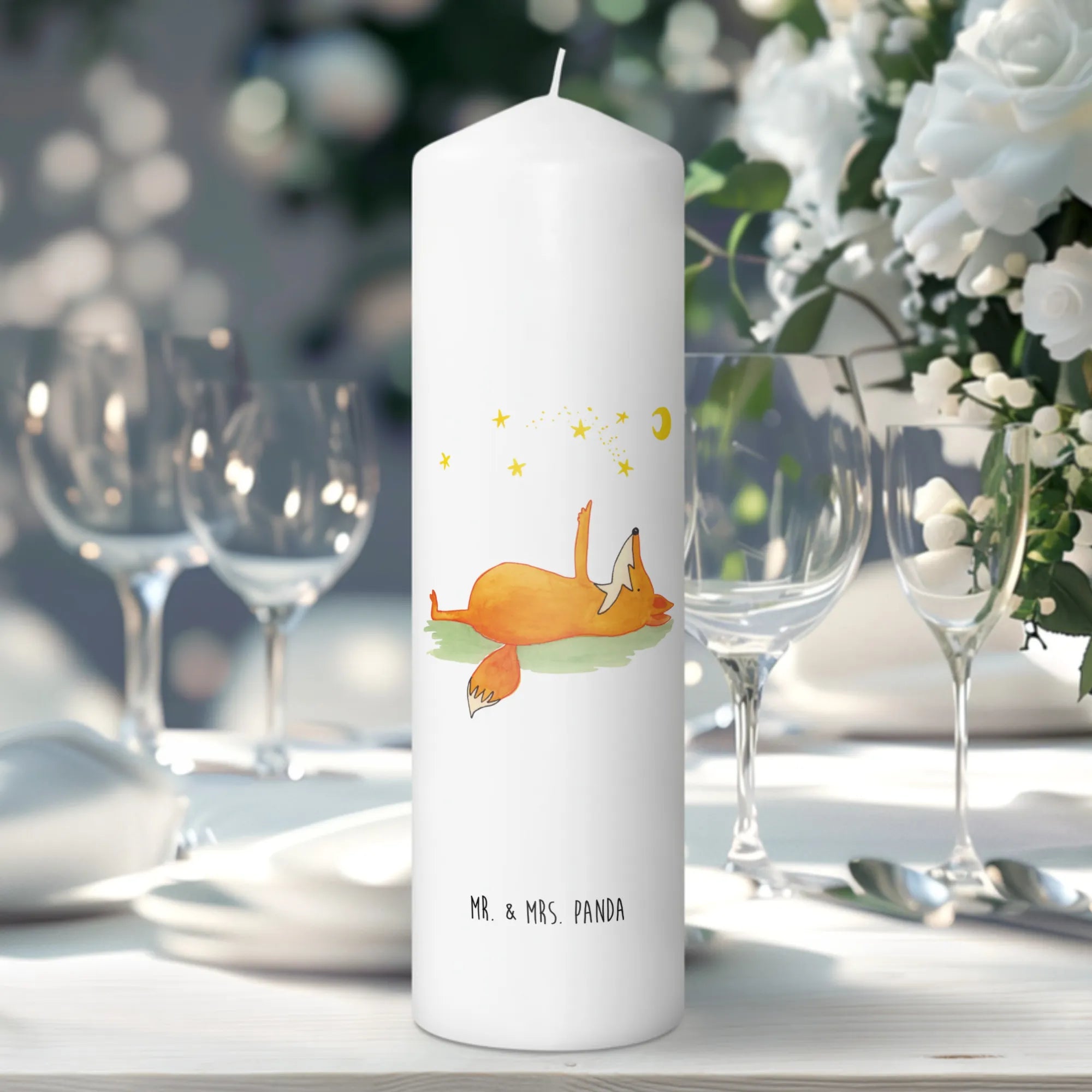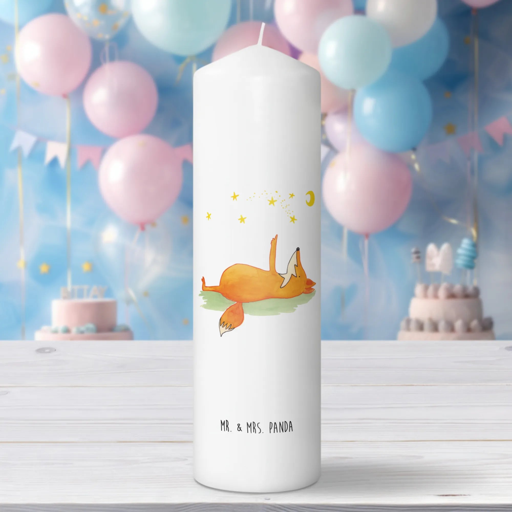 Die Kerze mit dem bezaubernden Motiv "Fuchs Sterne" aus der Fuchs Kollektion von Mr. & Mrs. Panda ist nicht nur ein wunderschönes Accessoire, sondern auch das perfekte Geschenk für zahlreiche Anlässe. Wenn du nach einem besonderen Geschenk suchst, ist diese Taufkerze oder Kommunionskerze eine wunderbare Wahl. Sie strahlt Wärme und Liebe aus und sorgt für eine angenehme Stimmung, egal ob beim Geburtstagsfest oder bei feierlichen Anlässen wie Taufen und Kommunionen.