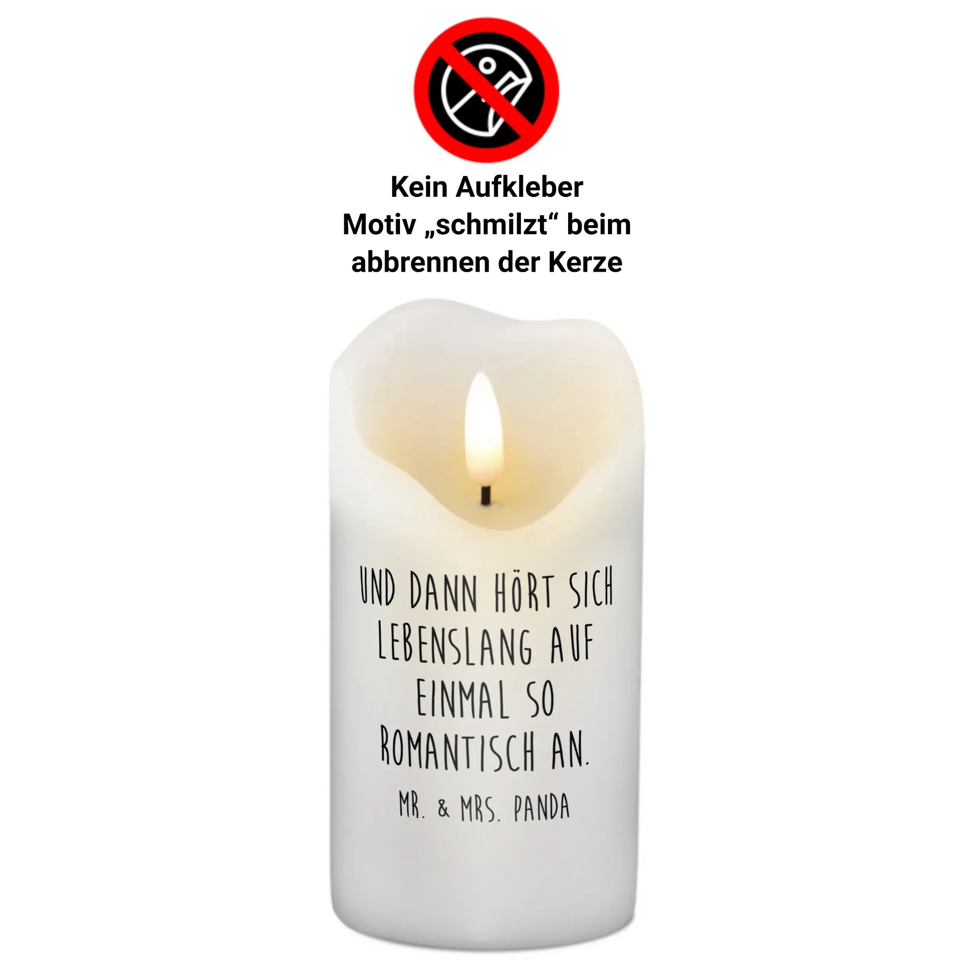Diese wunderschöne Kerze wird nicht nur das Herz des Beschenkten erwärmen, sondern auch jeden Raum mit ihrem sanften Licht zaubern. Die zwei niedlichen Füchse, die Händchen haltend sitzen, strahlen eine unendliche Geborgenheit und Liebe aus. Der Spruch "Und dann hört sich lebenslang auf einmal so romantisch an." rundet das Design perfekt ab und macht diese Kerze zu einem besonders liebevollen Geschenk für Paare, Verlobte oder Ehepartner.