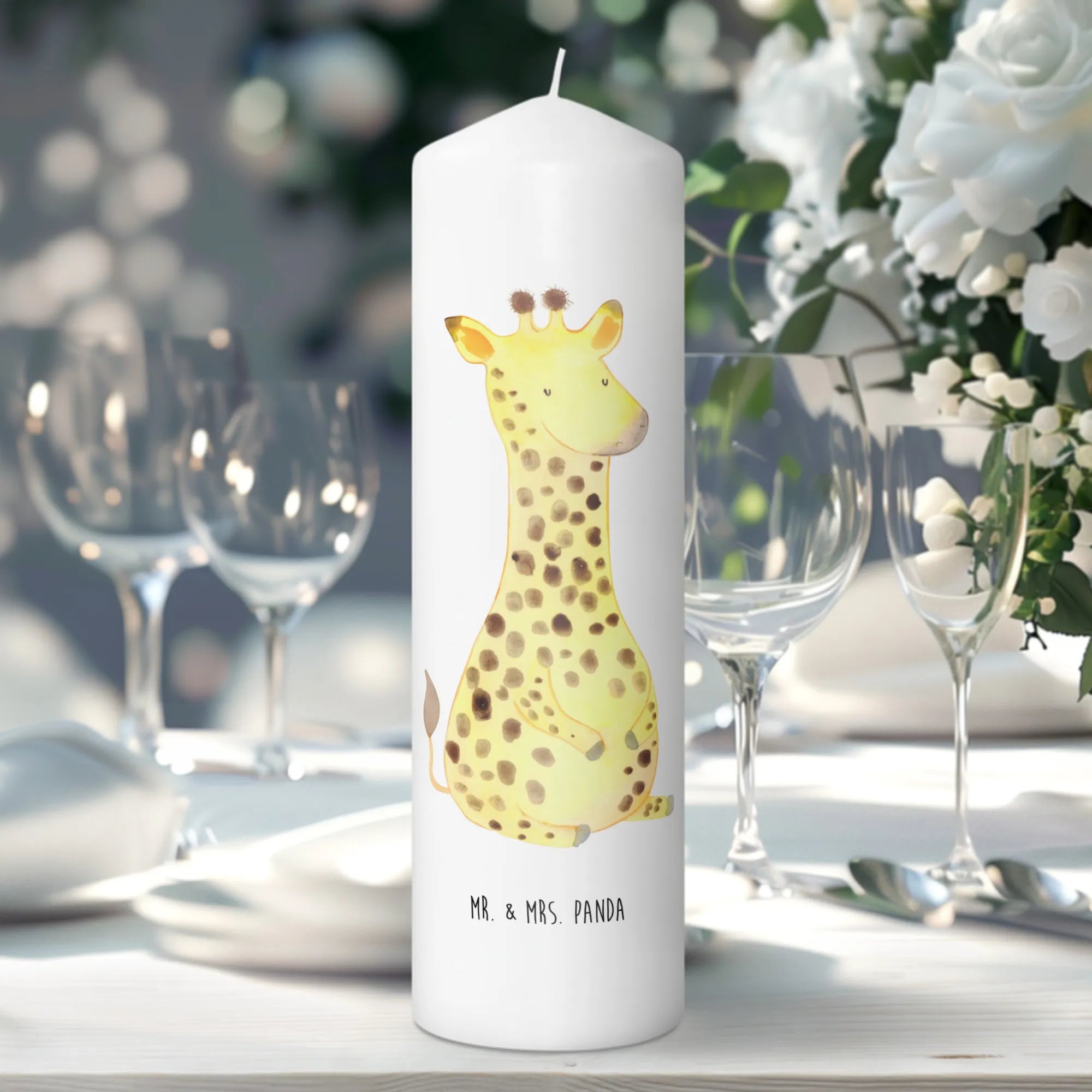 Das zauberhafte Motiv zeigt eine niedliche, zufriedene Giraffe, die jeder Veranstaltung einen Hauch von Abenteuer und Fernweh verleiht. Egal ob du sie selbst verwenden möchtest oder einem lieben Menschen schenkst, diese Kerze ist ein ganz besonderes Stück, das auf jedem Tisch ein schöner Blickfang ist.
