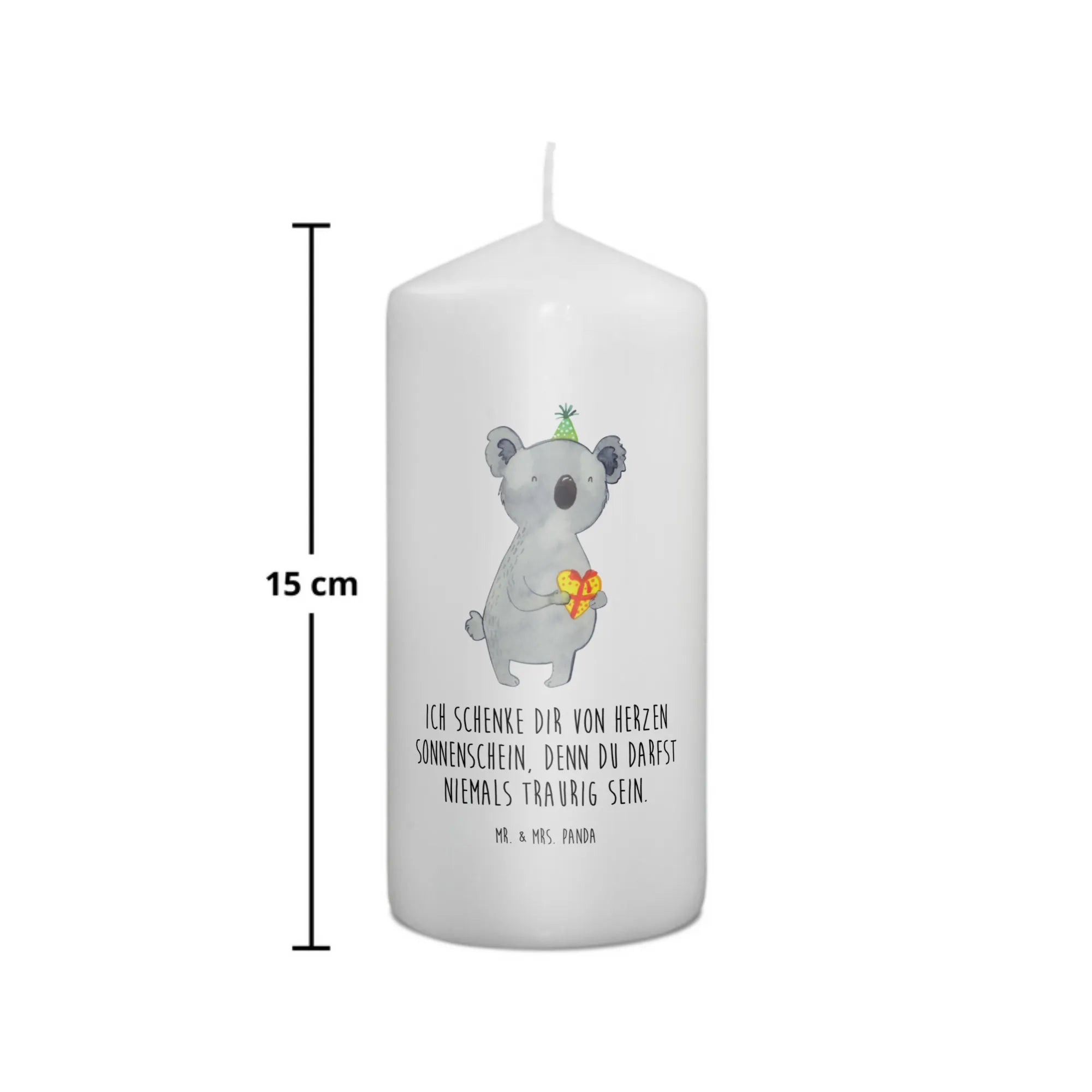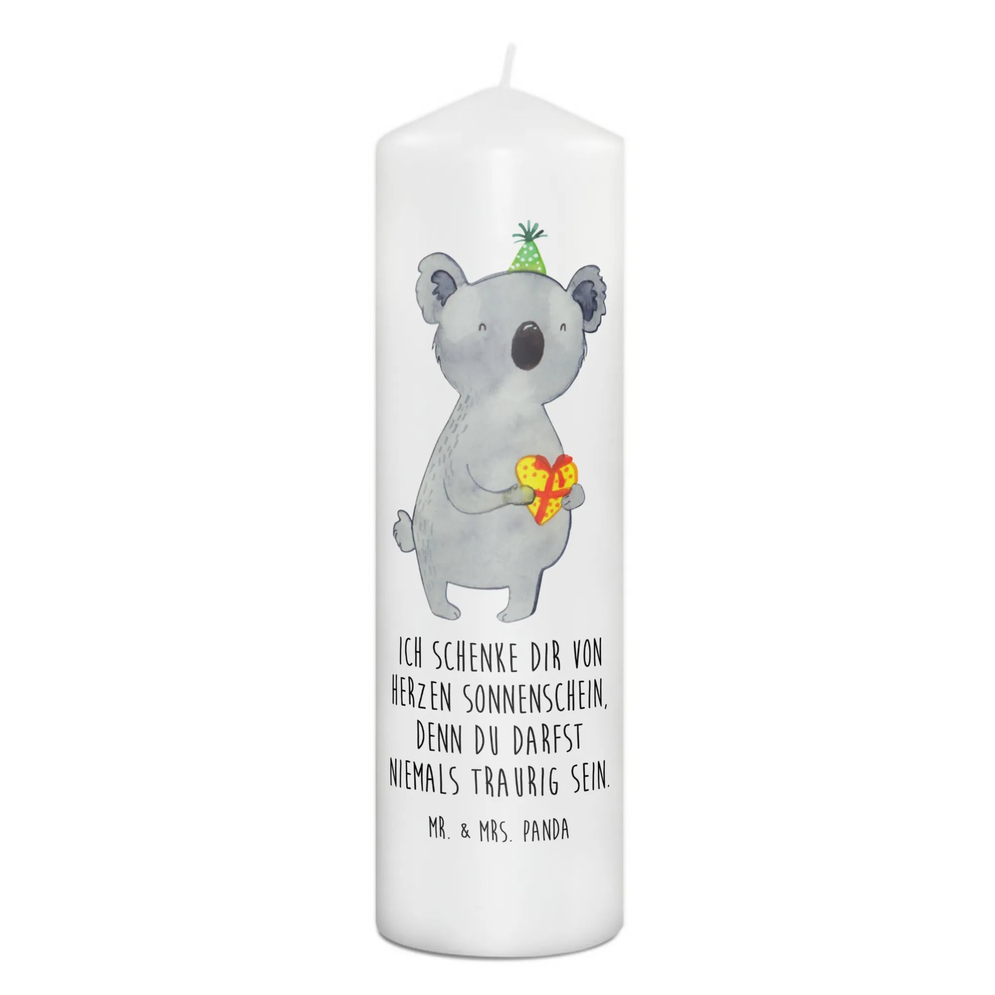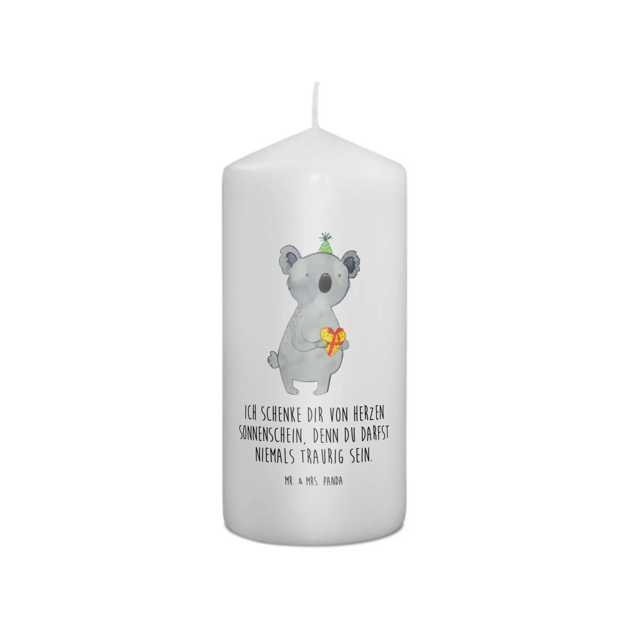 Die wunderschöne Koala Kerze von Mr. & Mrs. Panda ist das ideale Geschenk für jede besondere Occasion. Egal ob zur Taufe, Kommunion oder zum Geburtstag, diese Kerze bringt Freude und Wärme in jeden Raum. Mit einem herzlichen Design, das einen niedlichen Koala mit Partyhut zeigt, hält sie ein Geschenk in Herzform in seinen Pfoten. Der passende Slogan "Ich schenke dir von Herzen Sonnenschein, denn du darfst niemals traurig sein." umarmt den Moment und verleiht der Kerze eine persönliche Note.