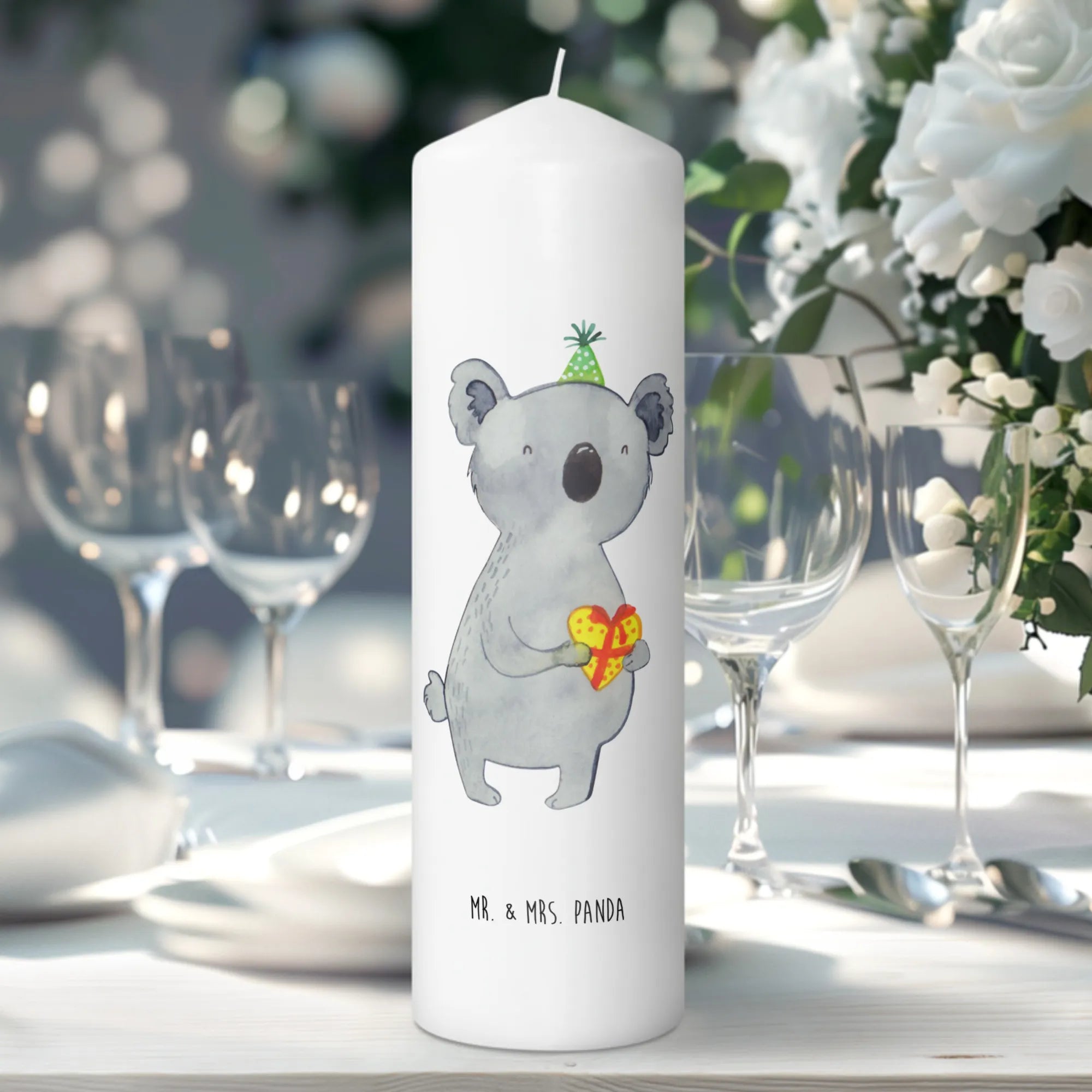 Die Kerze "Koala Geschenk" von Mr. & Mrs. Panda ist das perfekte Geschenk für besondere Anlässe wie Taufen, Kommunionen oder Geburtstage. Mit einem niedlichen Koala, der einen Partyhut trägt und ein Herzgeschenk in seinen Pfoten hält, zaubert diese Kerze jedem ein Lächeln ins Gesicht.