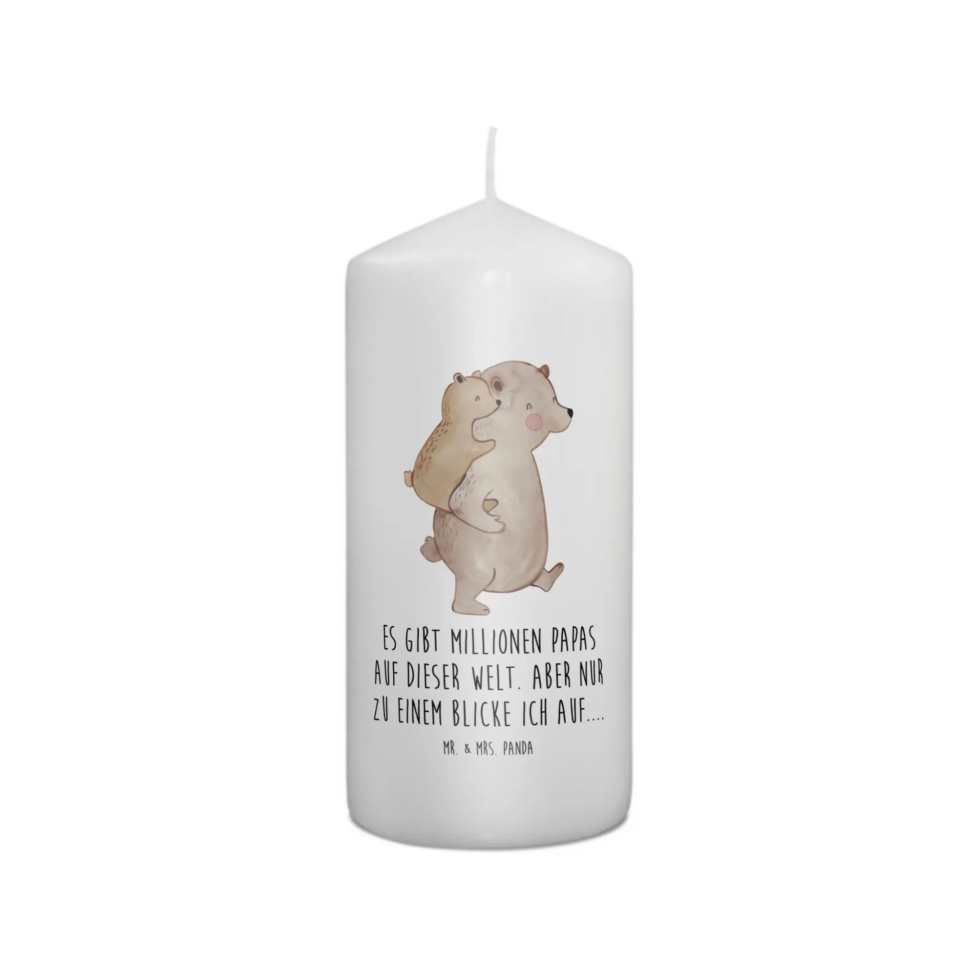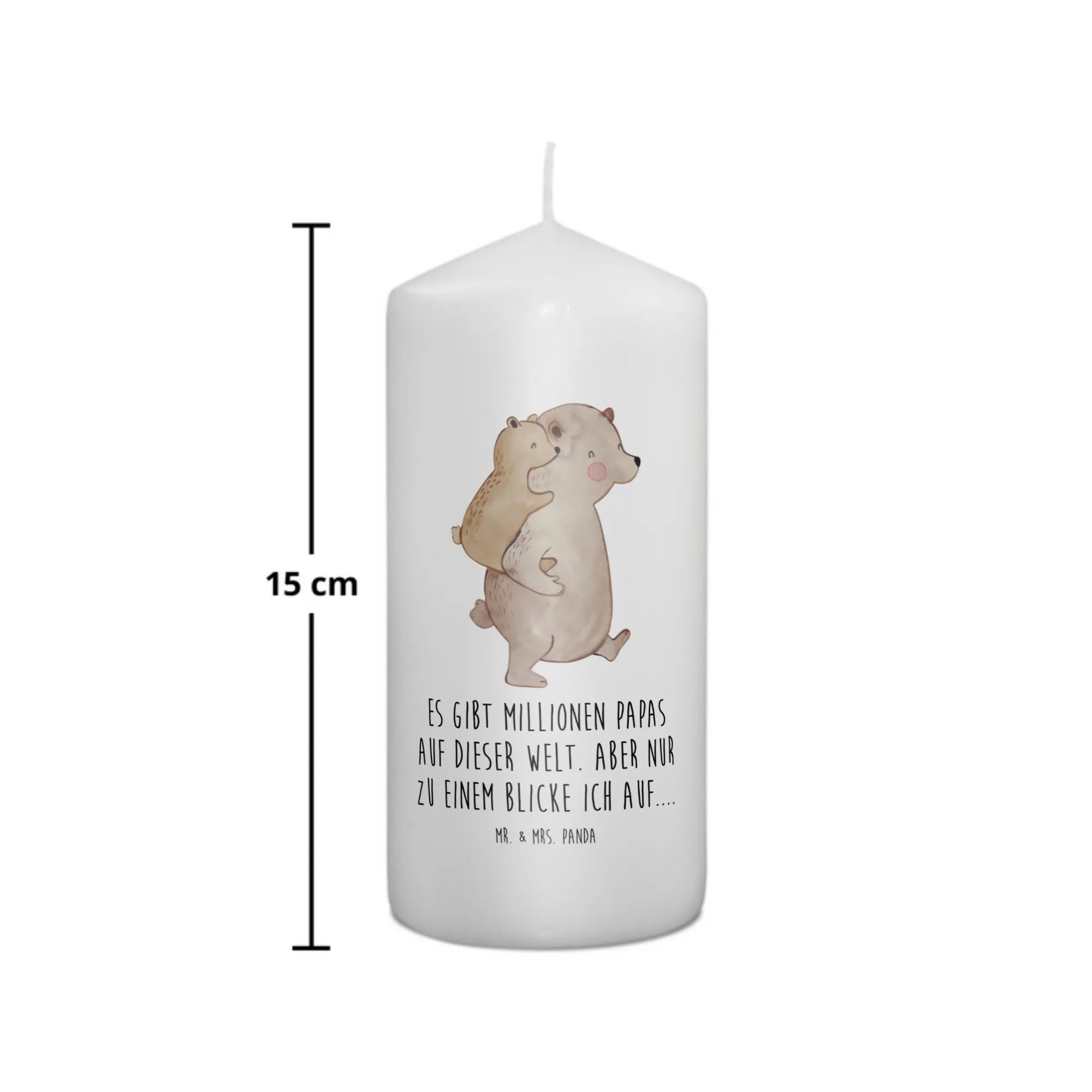 Die Kerze hat eine edle Größe von 190 mm x 80 mm und besteht aus hochwertigem Parafinwachs, was eine ultralange Brenndauer garantiert. Das entzückende Motiv zeigt einen großen, liebevollen Bären, der einen kleinen Bären auf seinem Rücken trägt. Beide Bären strahlen Wärme und Geborgenheit aus, was ideal für die enge Beziehung zwischen Vater und Kind steht. Hierbei gilt: "Es gibt Millionen Papas auf dieser Welt. Aber nur zu einem blicke ich auf..." – ein schöner Slogan, der die besondere Verbindung noch einmal unterstreicht.