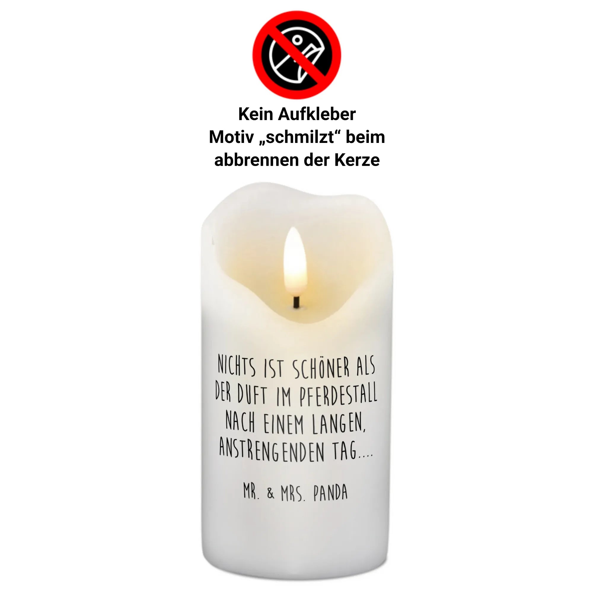 Die Kerze ist mit einem liebevollen Spruch bedruckt: 'Nichts ist schöner als der Duft im Pferdestall nach einem langen, anstrengenden Tag...' und bringt somit zusätzlich eine emotionale Note ins Spiel. Jedes Motiv wird mit viel Liebe von Mrs. Panda handgezeichnet und spiegelt die Freude und Lebendigkeit wider, die einen Bauernhof ausmacht.