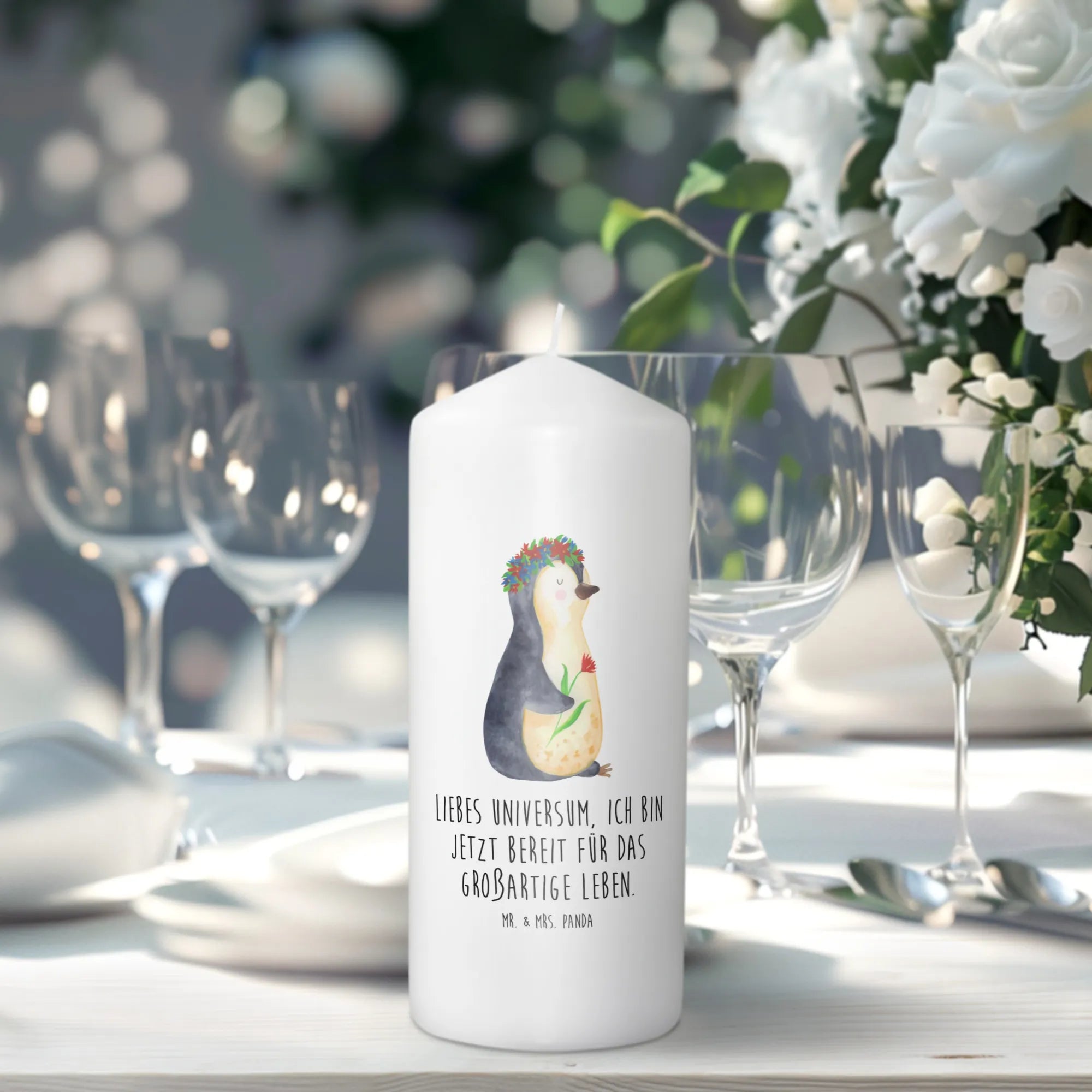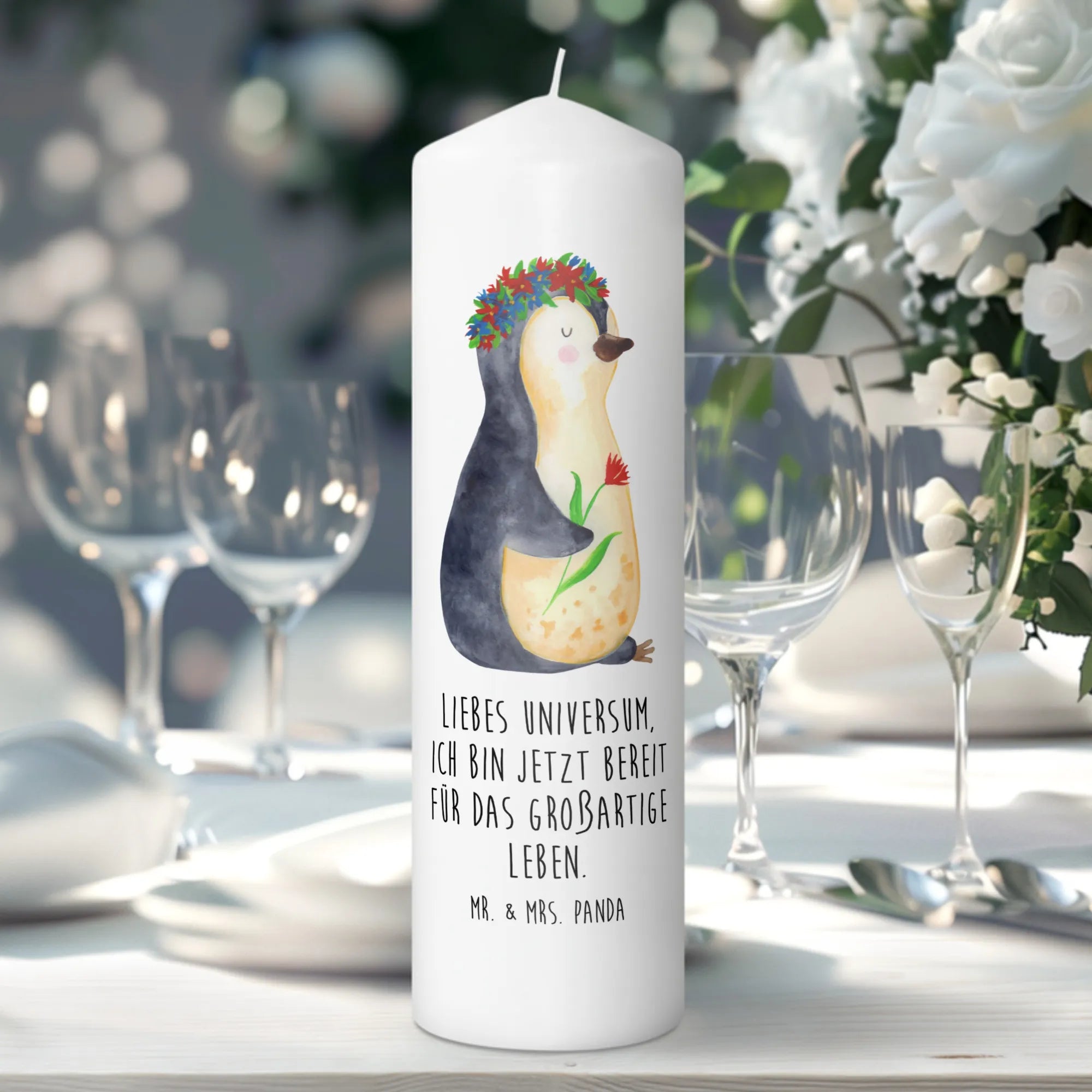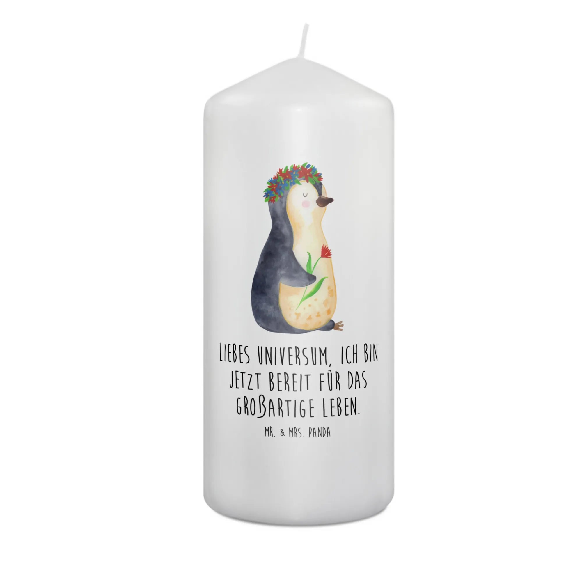 Kerze Pinguin Blumenkranz - 29 x 8 cm XL - mit Spruch