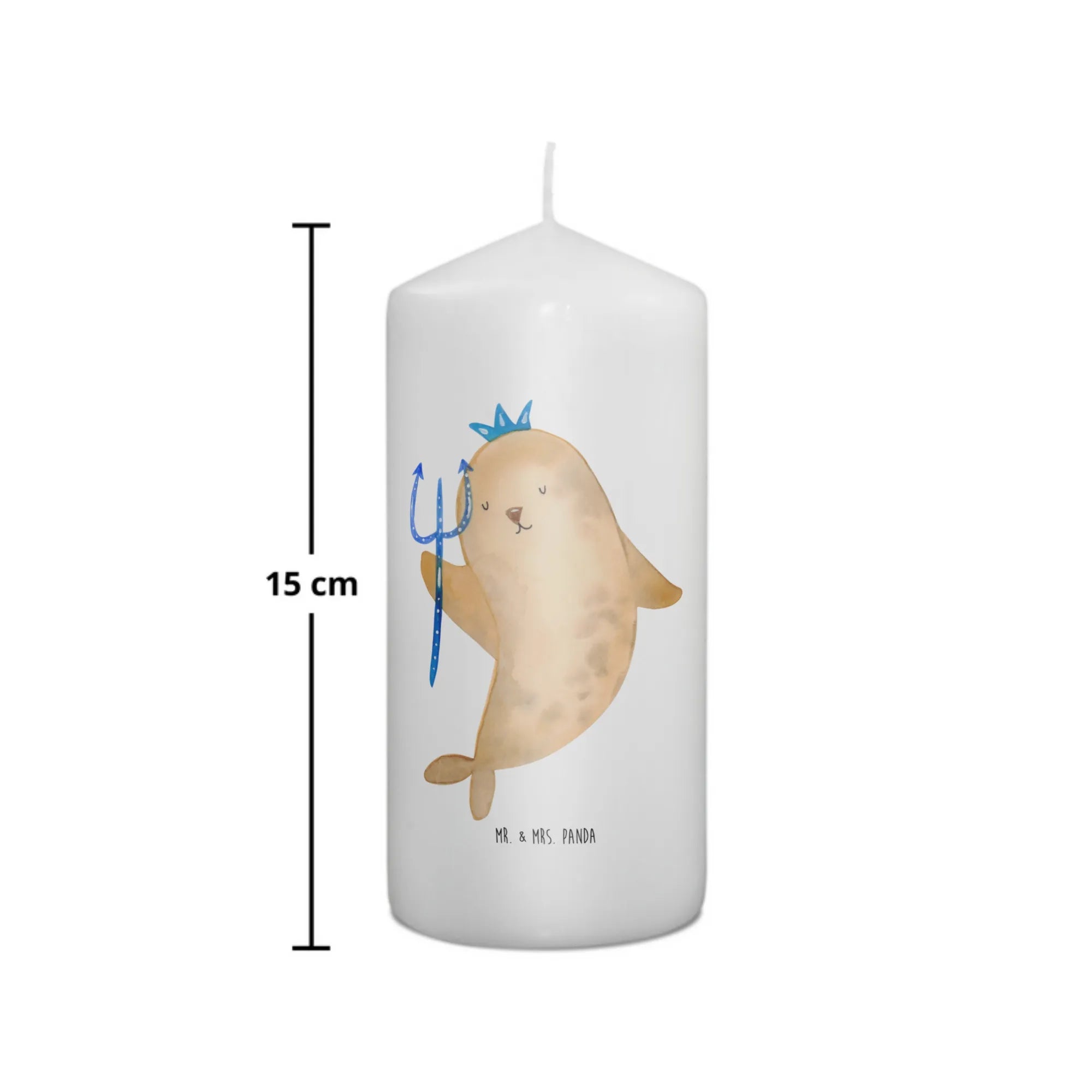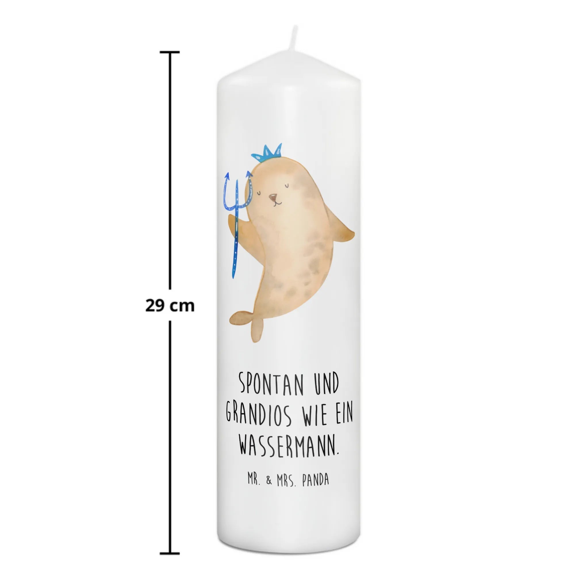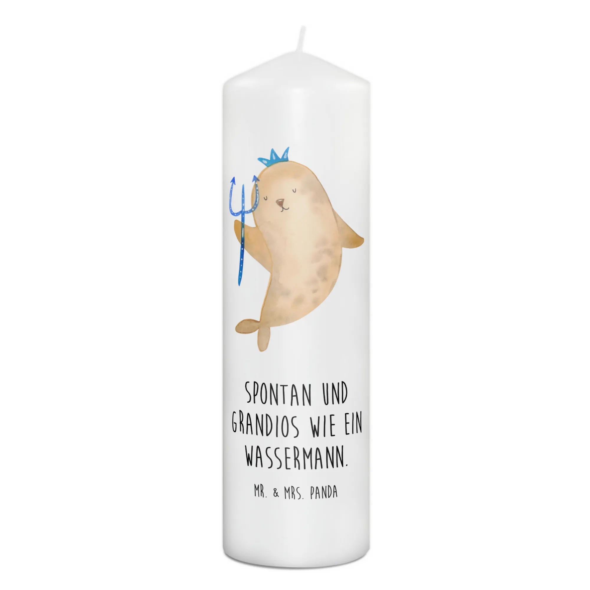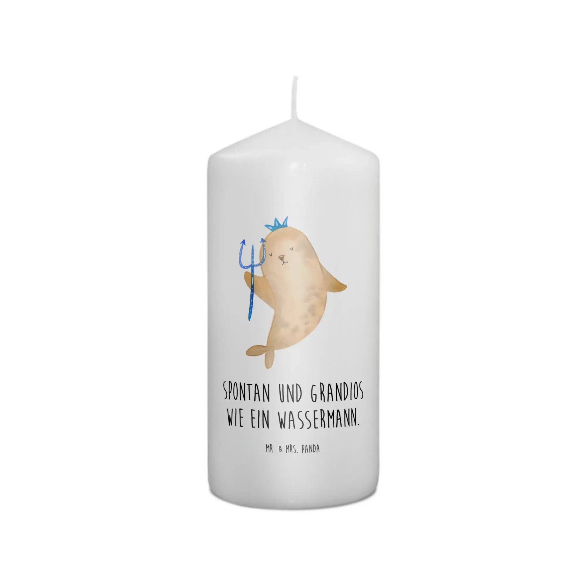 Zauberhaftes Sternzeichen-Geschenk: Die Mr. & Mrs. Panda Kerze Sternzeichen Wassermann ist ein liebevolles Mitbringsel für alle, die das Sternzeichen Wassermann mit seinem besonderen Charakter feiern. Das handgezeichnete Aquarellmotiv zeigt eine gekrönte Robbe mit Zepter – verspielt, charmant und perfekt passend zum Spruch "Spontan und grandios wie ein Wassermann."