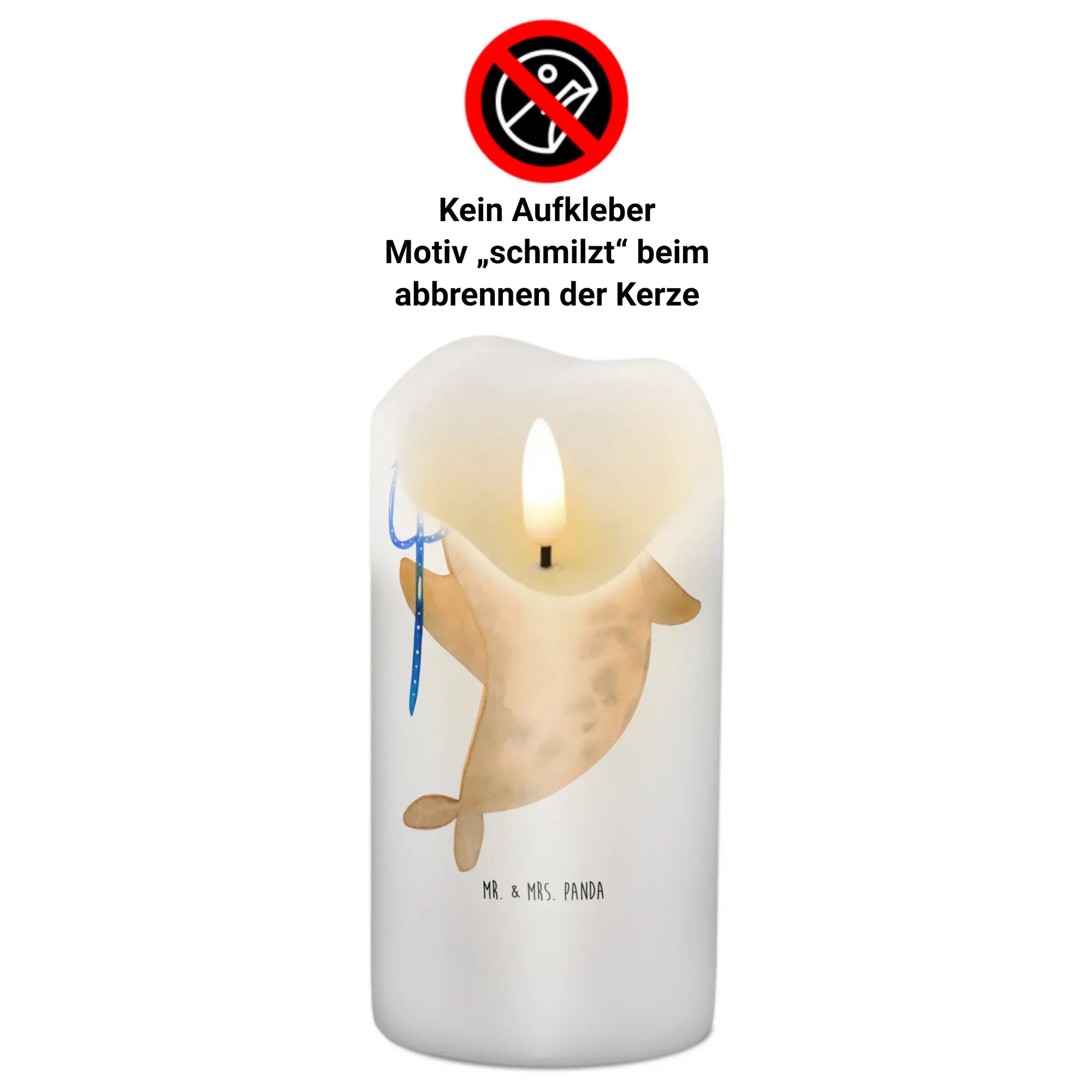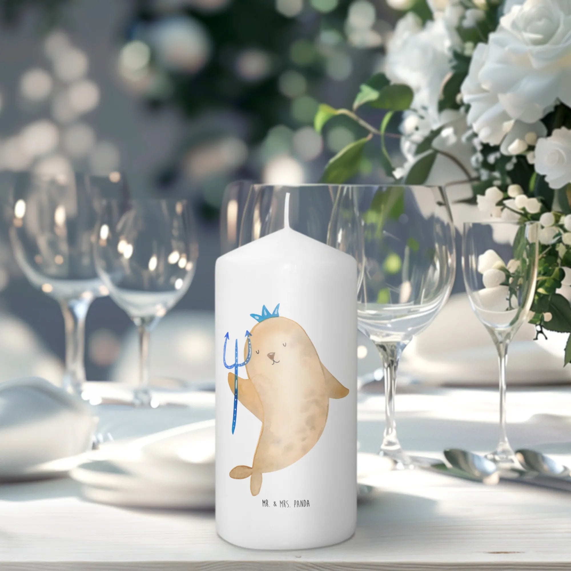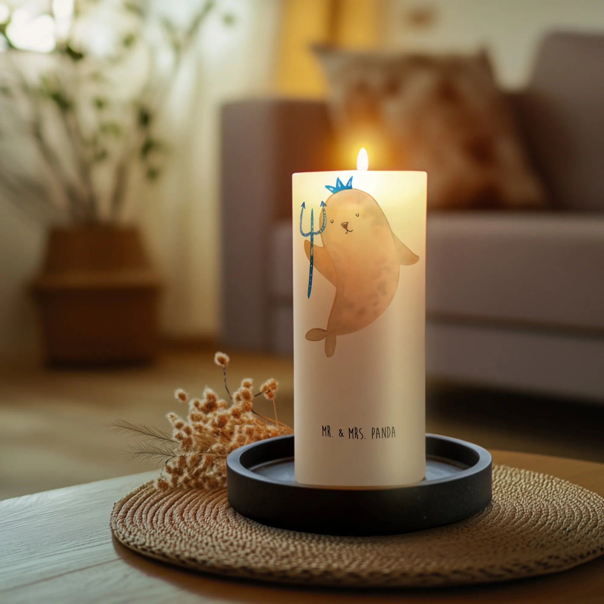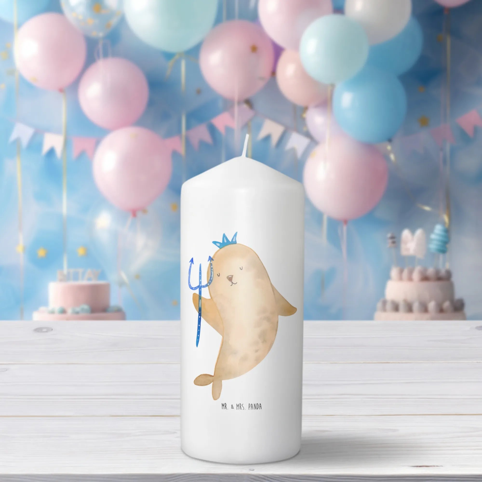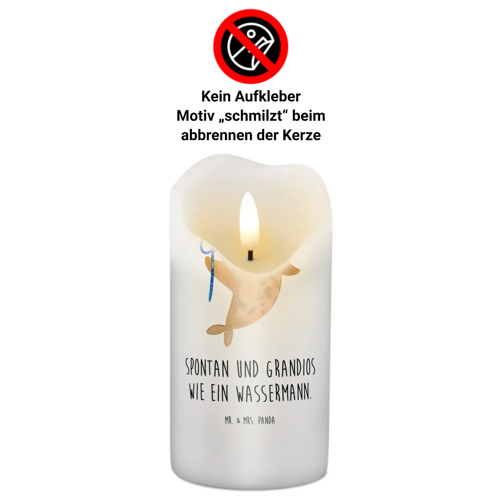 Zauberhaftes Sternzeichen-Geschenk: Die Mr. & Mrs. Panda Kerze Sternzeichen Wassermann ist ein liebevolles Mitbringsel für alle, die das Sternzeichen Wassermann mit seinem besonderen Charakter feiern. Das handgezeichnete Aquarellmotiv zeigt eine gekrönte Robbe mit Zepter – verspielt, charmant und perfekt passend zum Spruch "Spontan und grandios wie ein Wassermann."