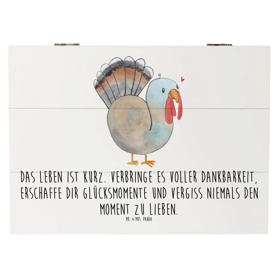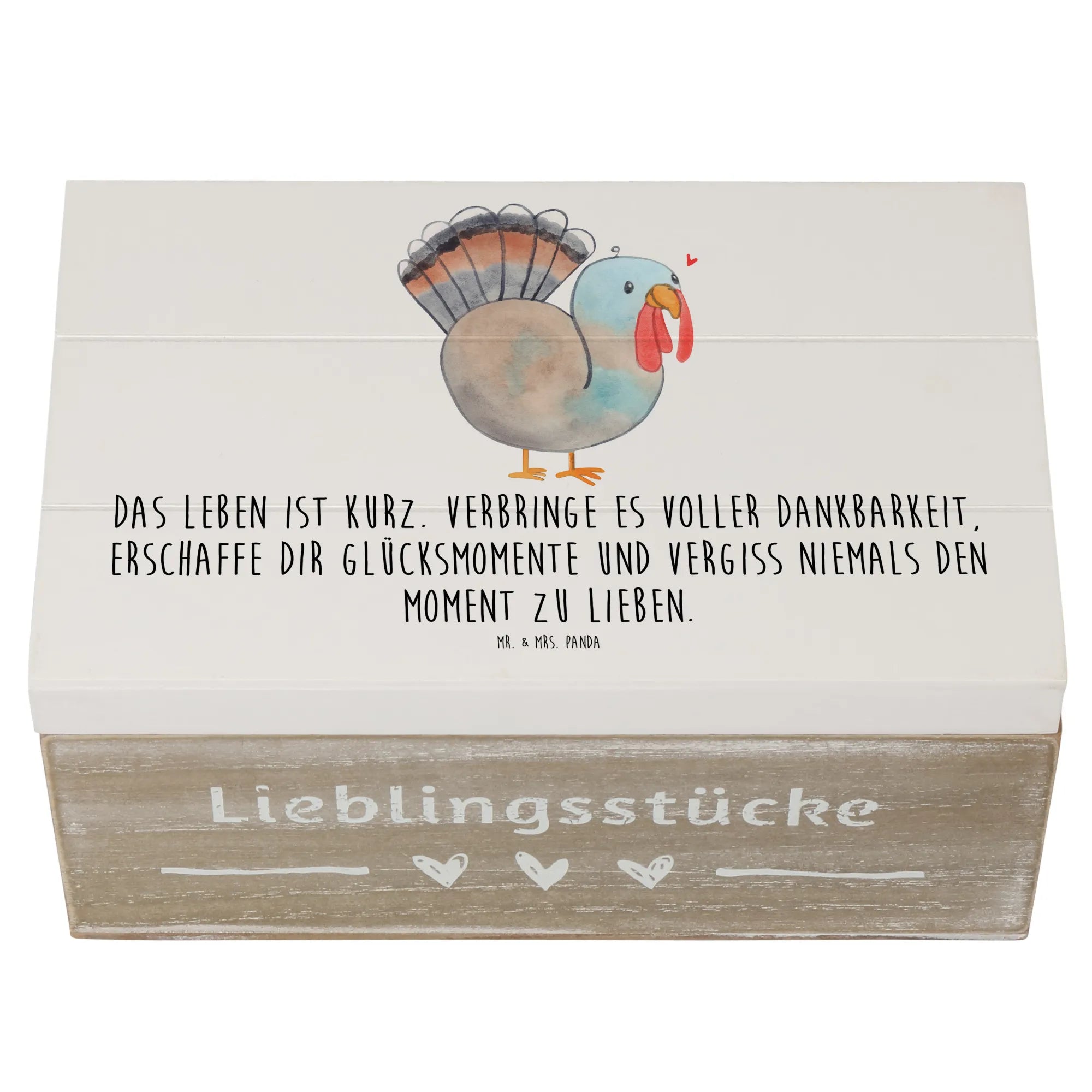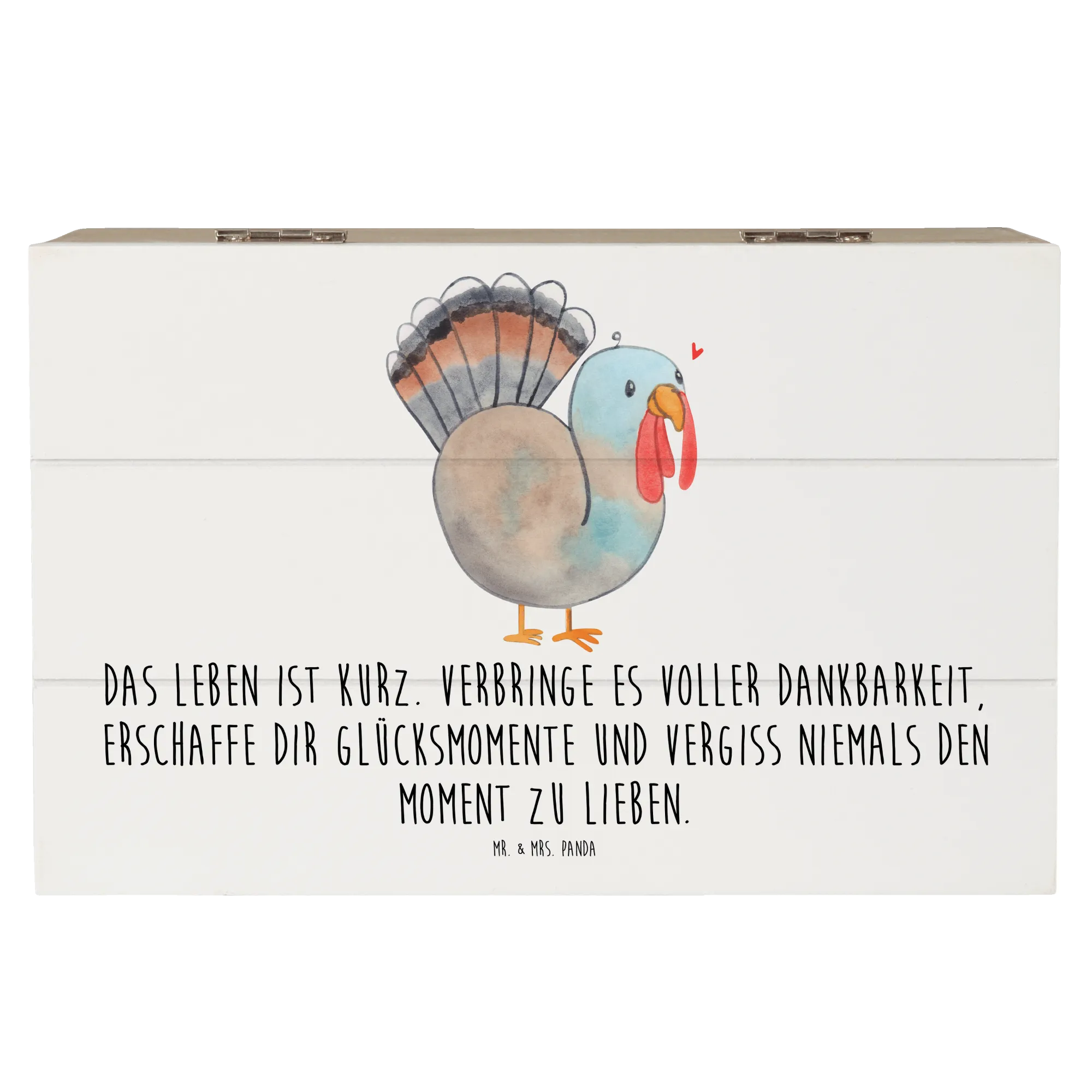 Ein Herz für Erinnerungen: Die Holzbox mit Deckel ist ideal als Erinnerungskiste für Fotos, Briefe oder kleine Schätze. Der niedliche Truthahn mit flauschiger Locke und einem schwebenden roten Herz wurde von Mrs. Panda mit Aquarelltechnik liebevoll gestaltet und macht jede Aufbewahrungsbox zu etwas Besonderem.