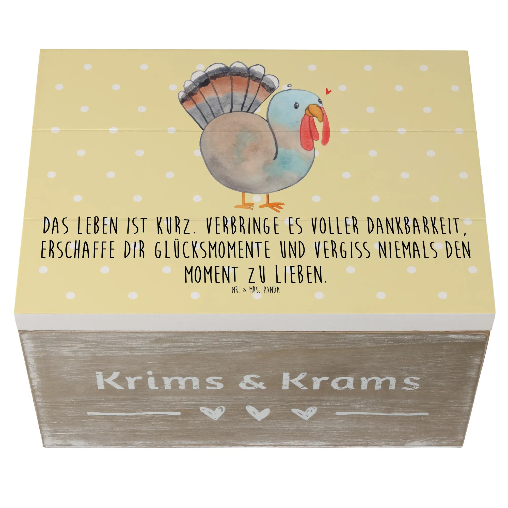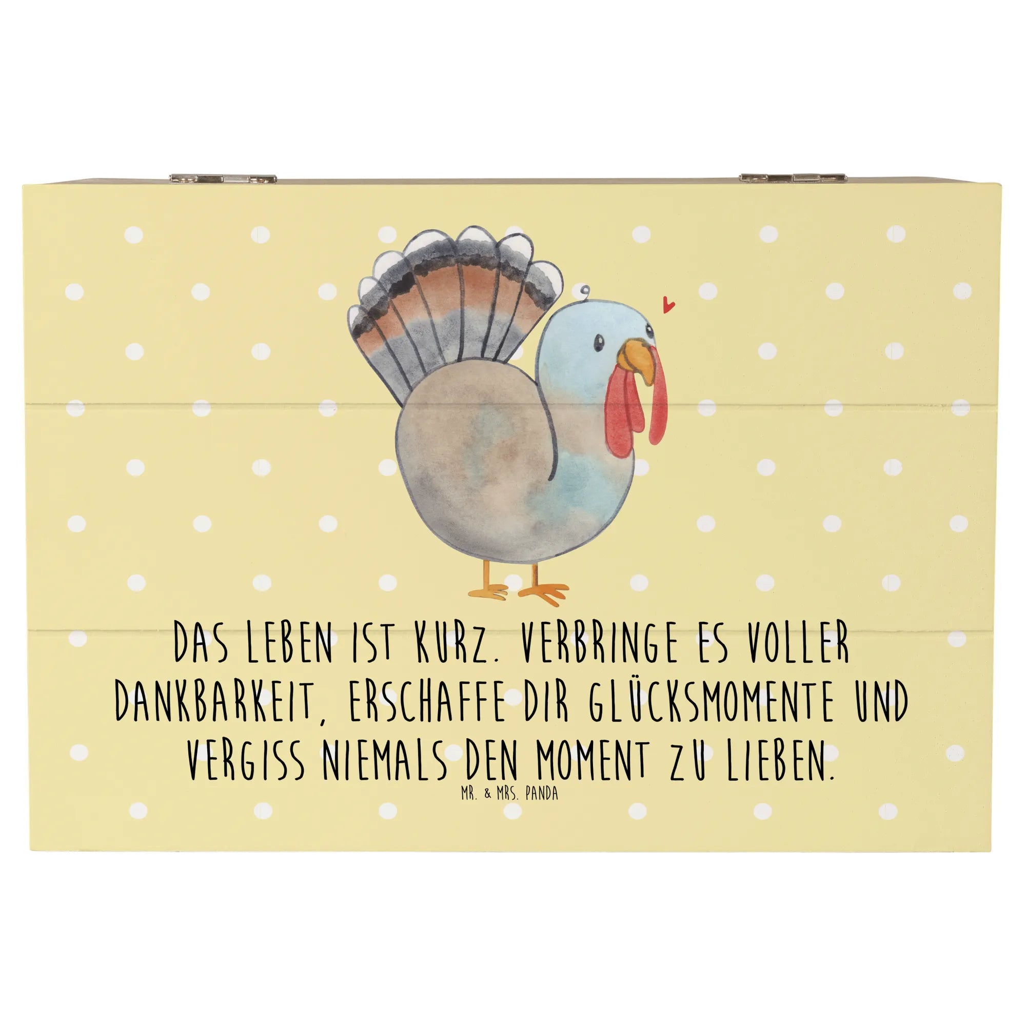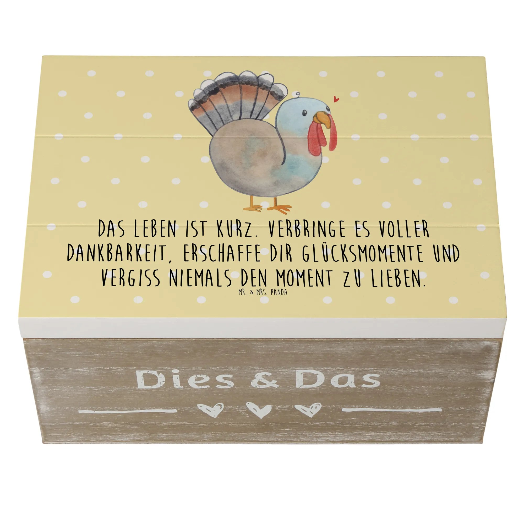 Ein Herz für Erinnerungen: Die Holzbox mit Deckel ist ideal als Erinnerungskiste für Fotos, Briefe oder kleine Schätze. Der niedliche Truthahn mit flauschiger Locke und einem schwebenden roten Herz wurde von Mrs. Panda mit Aquarelltechnik liebevoll gestaltet und macht jede Aufbewahrungsbox zu etwas Besonderem.