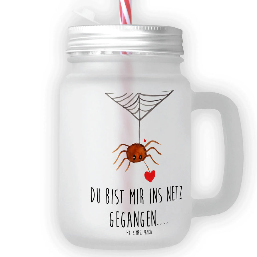 Das Trinkglas Mason Jar mit dem wunderschönen Motiv "Spinne Agathe Liebe" von Mr. & Mrs. Panda ist das perfekte Geschenk für alle Liebesbeweise und romantischen Anlässe. Ob für den nächsten Sommerabend mit Freunden, eine Grillparty oder einfach nur als hübsches Accessoire für Deine Küche – dieses hochwertige Henkelglas bringt mit seiner edlen, matten Oberfläche und dem liebevollen Design Fröhlichkeit in jeden Moment.