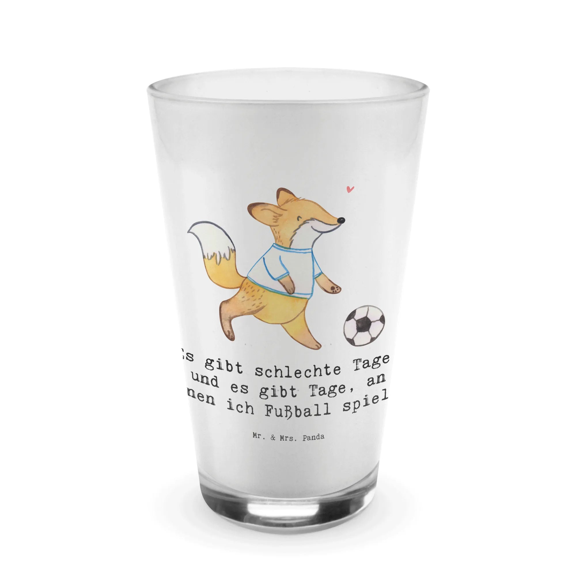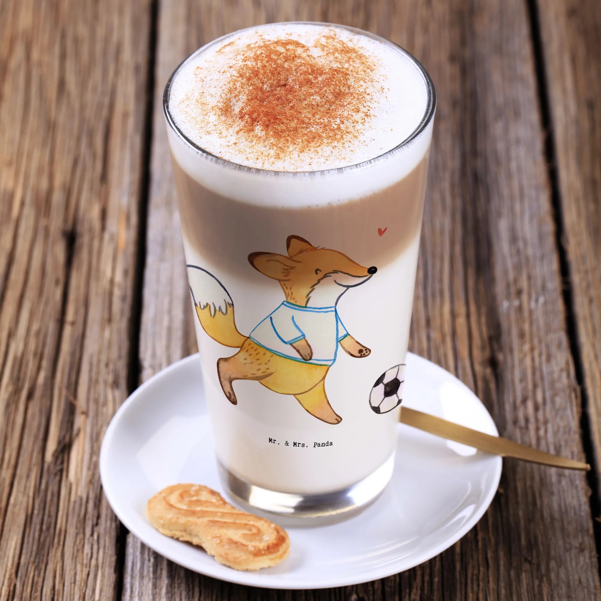 Das hochwertige Cappuccino Glas von Mr. & Mrs. Panda mit dem niedlichen Fuchs-Motiv "Fußball spielen Tage" ist das perfekte Geschenk für Sportbegeisterte und Hobby-Fans!