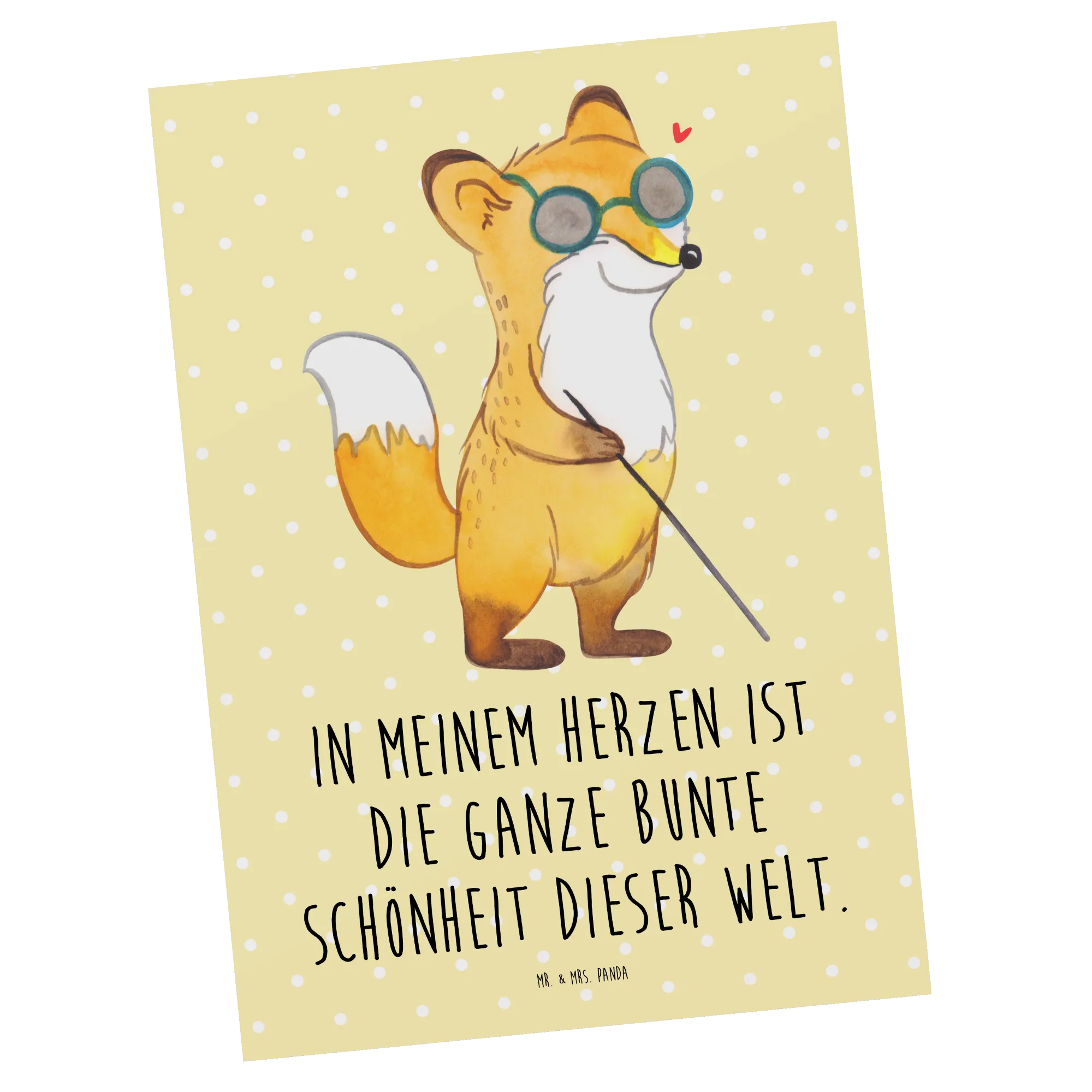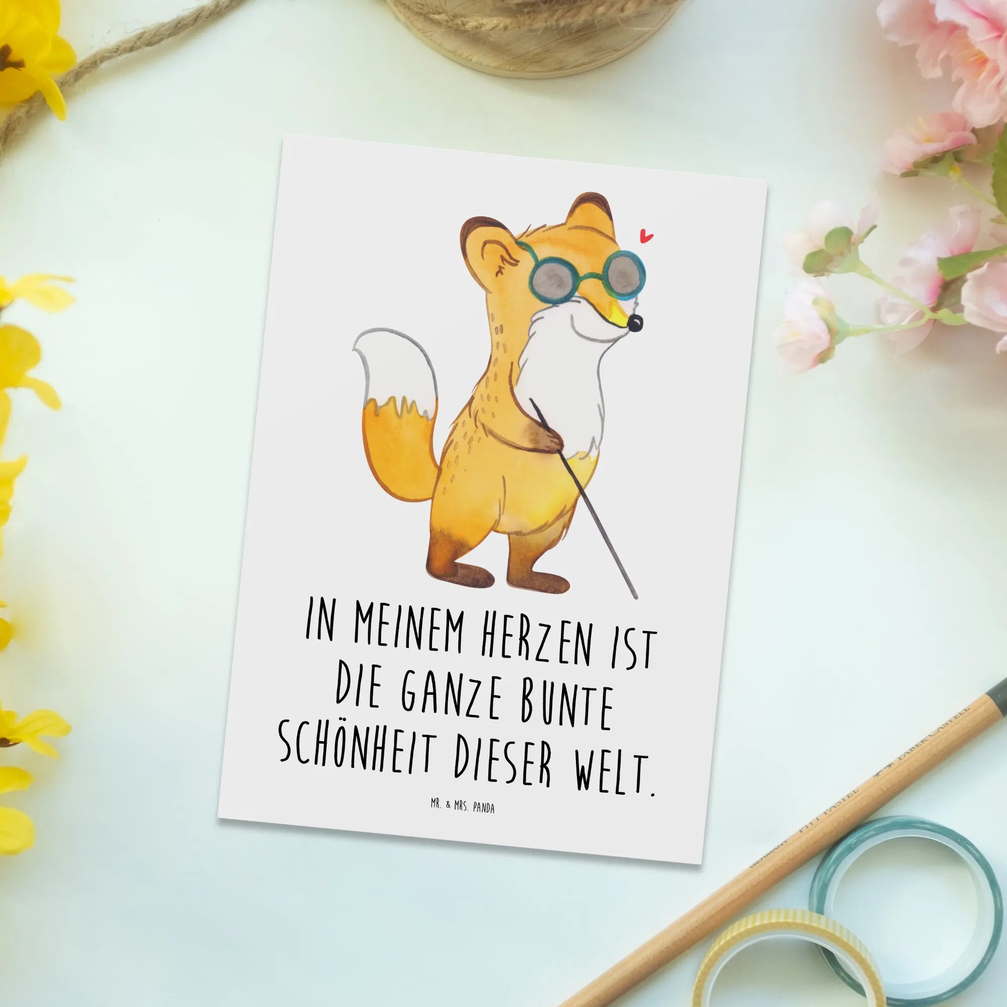 Die Postkarte mit dem Motiv "Fuchs Blindheit" aus der Kollektion "Tiere mit Superkräften" von Mr. & Mrs. Panda ist das perfekte Geschenk für alle, die besonderen Mut und Kraft im Alltag zeigen. Diese einzigartige Postkarte erinnert uns daran, die Welt mit anderen Augen zu sehen und die Schönheit des Lebens wahrzunehmen, auch wenn man mit einem Handicap lebt. Mit ihrem liebevollen Design und dem inspirierenden Slogan "In meinem Herzen ist die ganze bunte Schönheit dieser Welt" spricht sie Menschen an, die ihre eigenen Fähigkeiten trotz körperlicher oder psychischer Einschränkungen wertschätzen möchten.