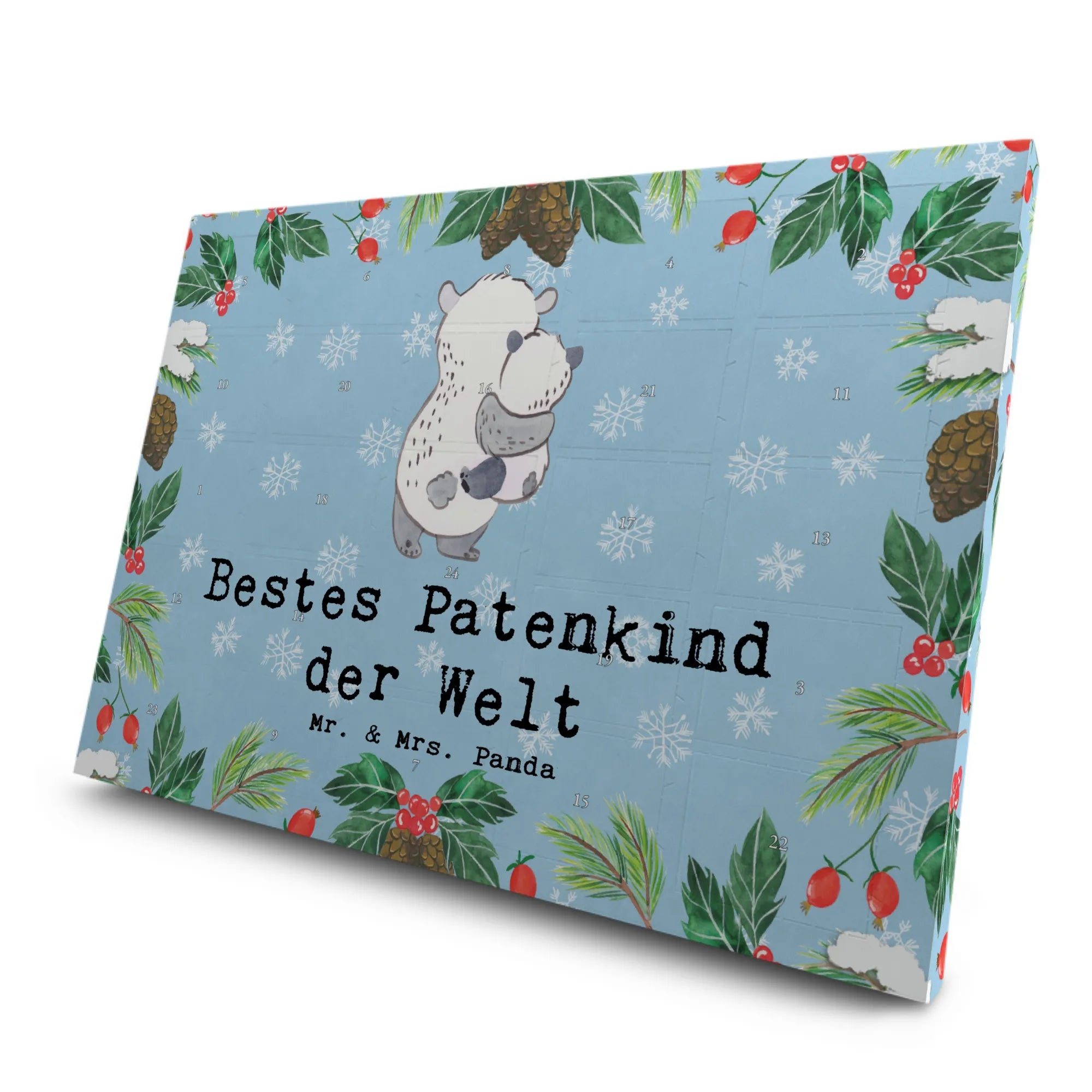 Die außergewöhnliche Kombination aus Früchtetee, Schwarztee und Kräutertee sorgt für Abwechslung und Gaumenfreude in der Vorweihnachtszeit. Auf dem Adventskalender ist ein süßes Panda-Motiv abgedruckt, das einen kleinen Panda in den Armen hält – eine liebevolle Botschaft, die perfekt für dein Patenkind geeignet ist.