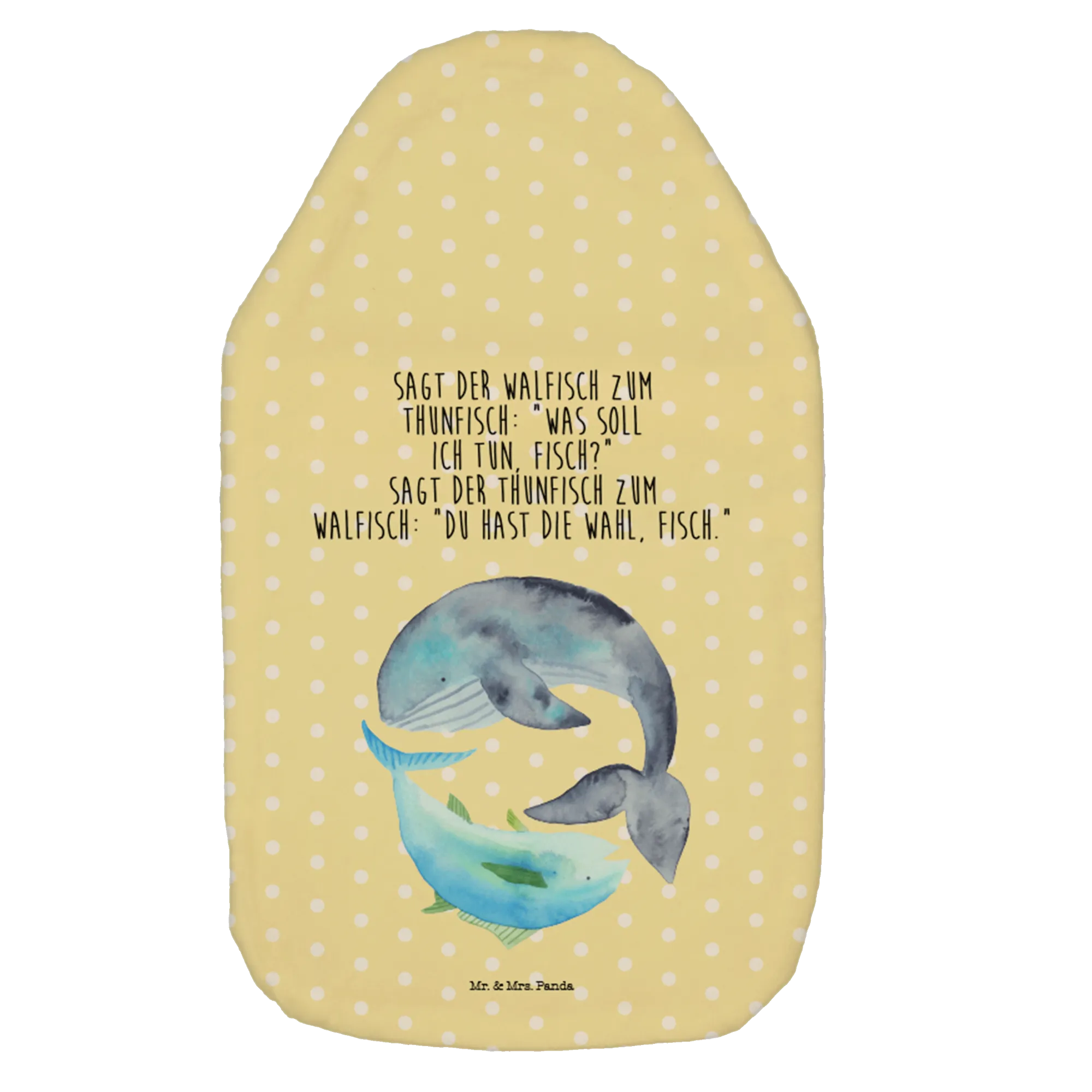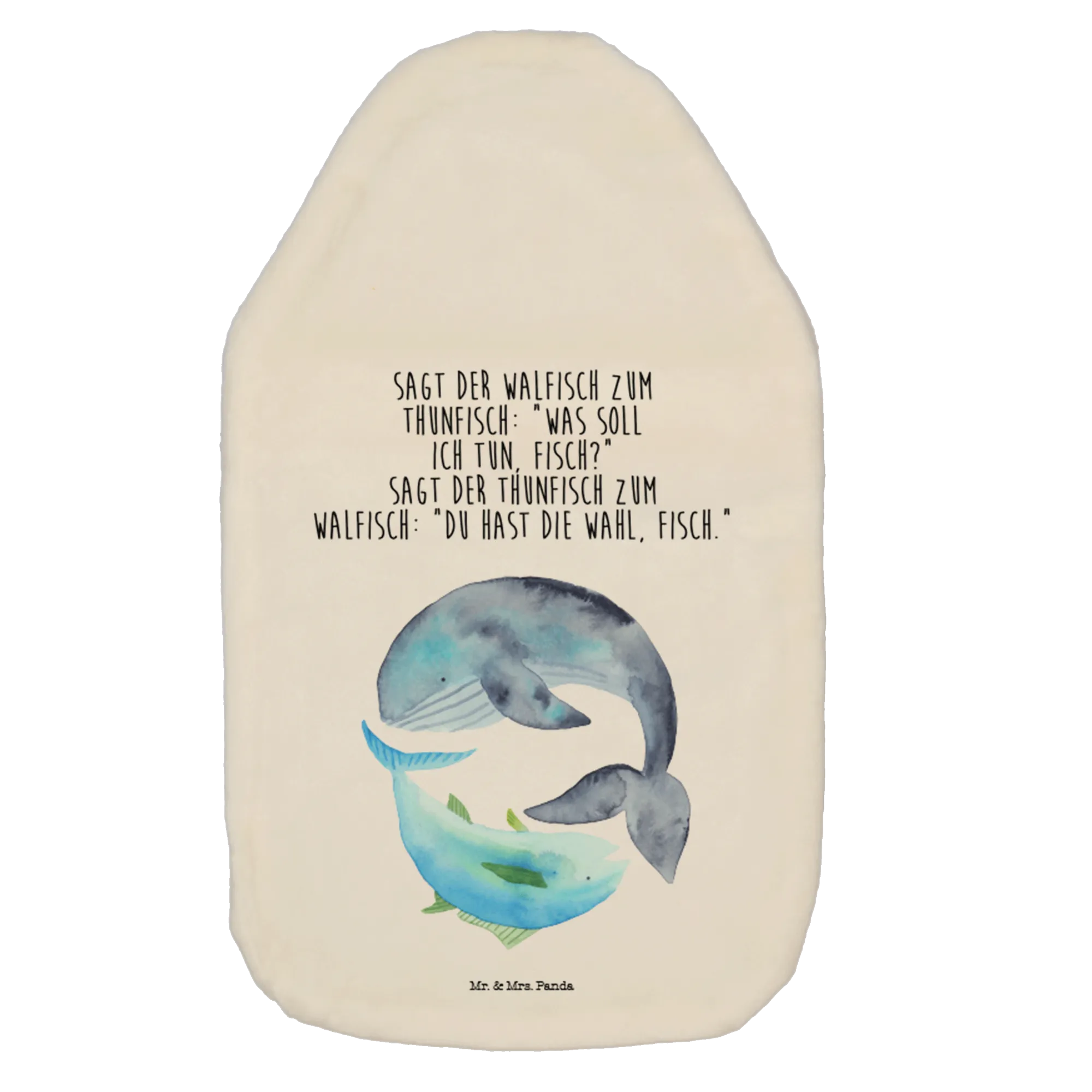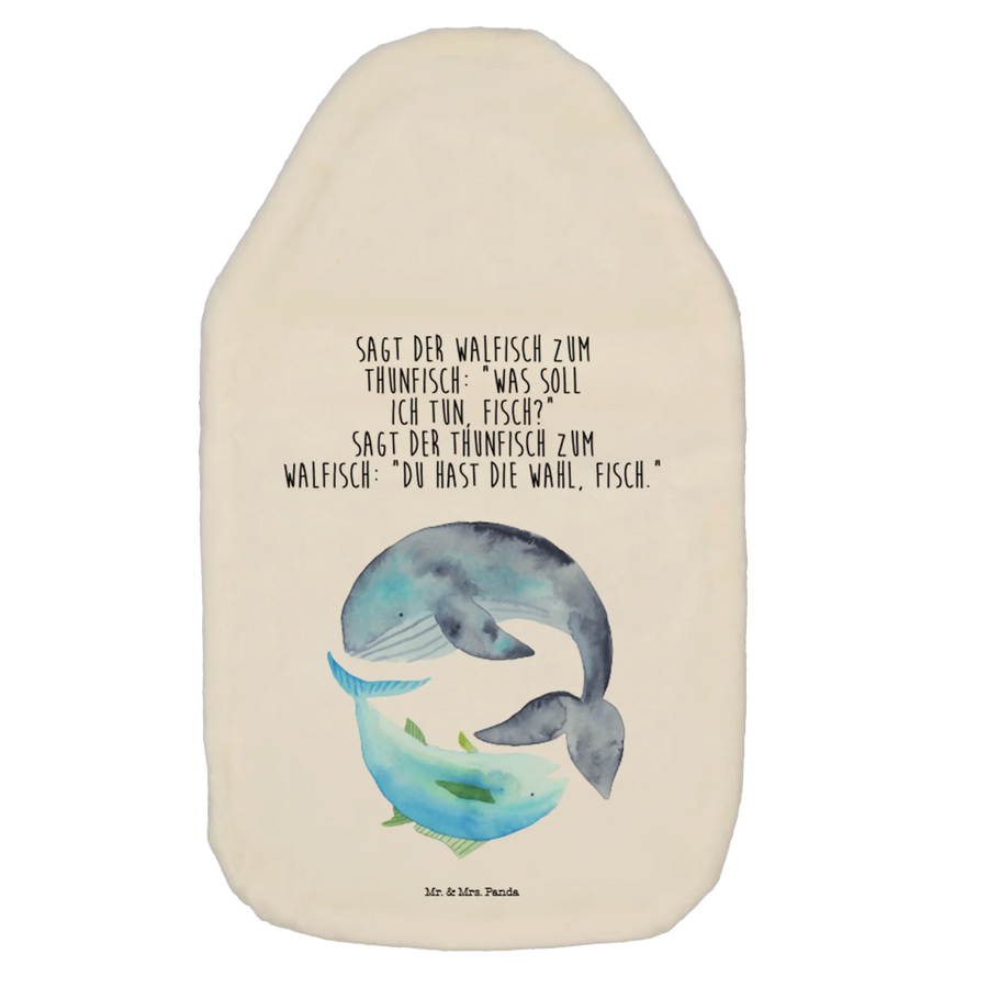 Wohlige Wärme trifft maritimen Charme: Unsere Wärmflasche Walfisch & Thunfisch aus der Small World Kollektion von Mr. & Mrs. Panda ist ein Geschenk voller Herzenswärme. Das liebevoll aquarellierte Motiv eines Walfisches und eines Thunfisches wird von dem frechen Spruch begleitet: „Sagt der Walfisch zum Thunfisch: ‚Was soll ich tun, Fisch?‘ Sagt der Thunfisch zum Walfisch: ‚Du hast die Wahl, Fisch.‘“ – perfekt, um ein Lächeln aufs Gesicht zu zaubern.