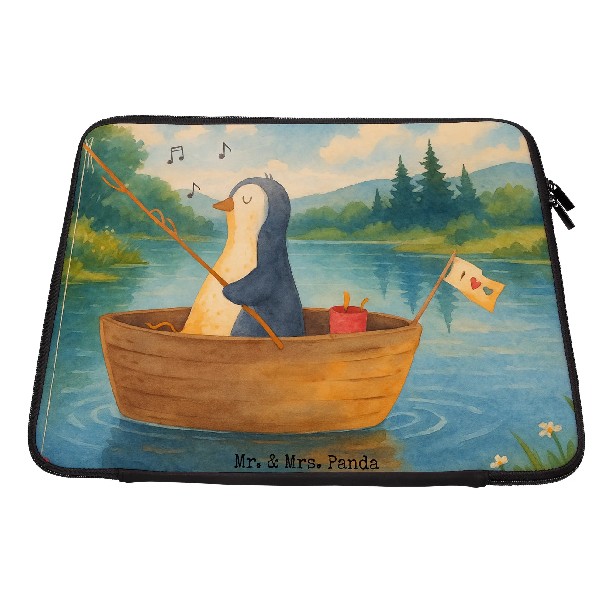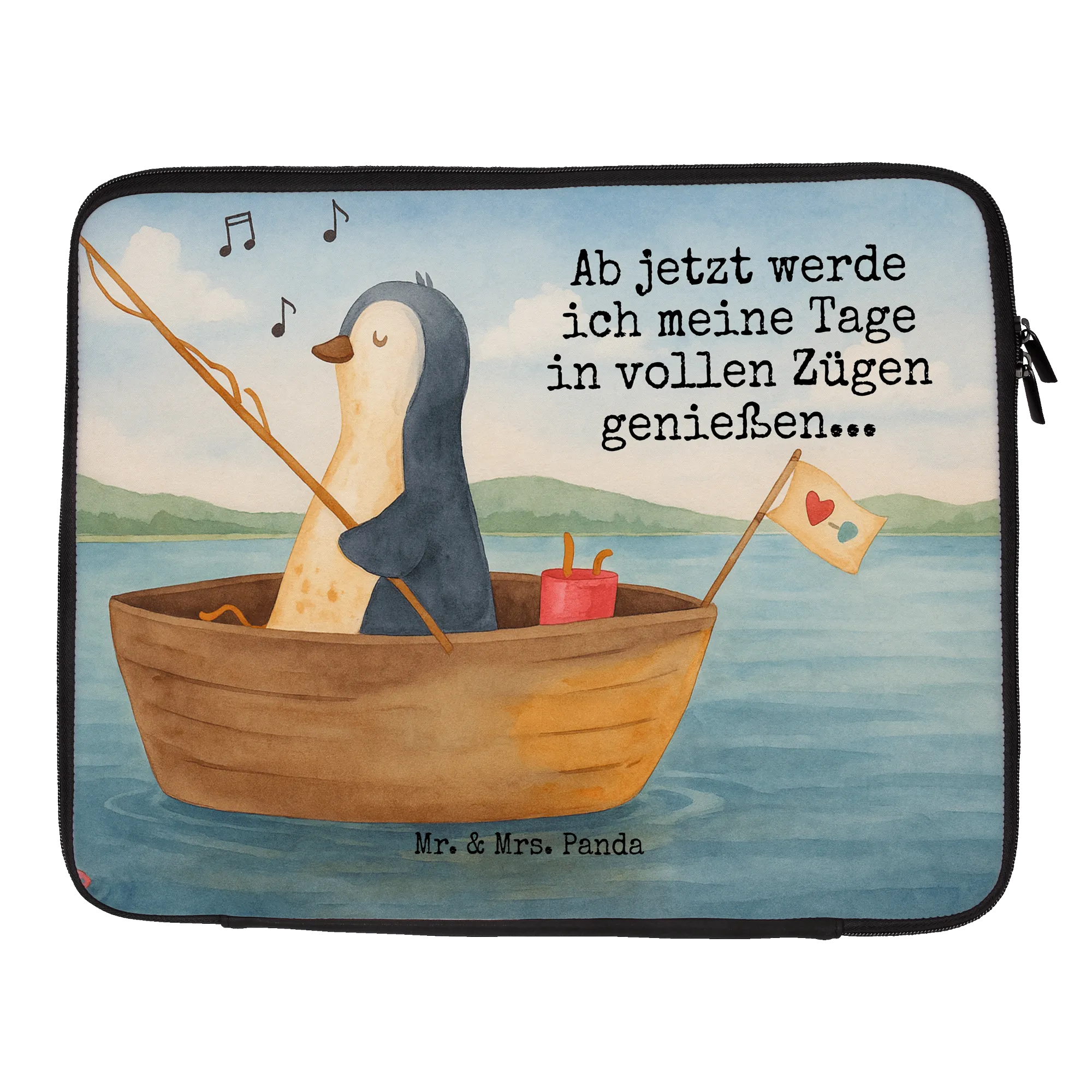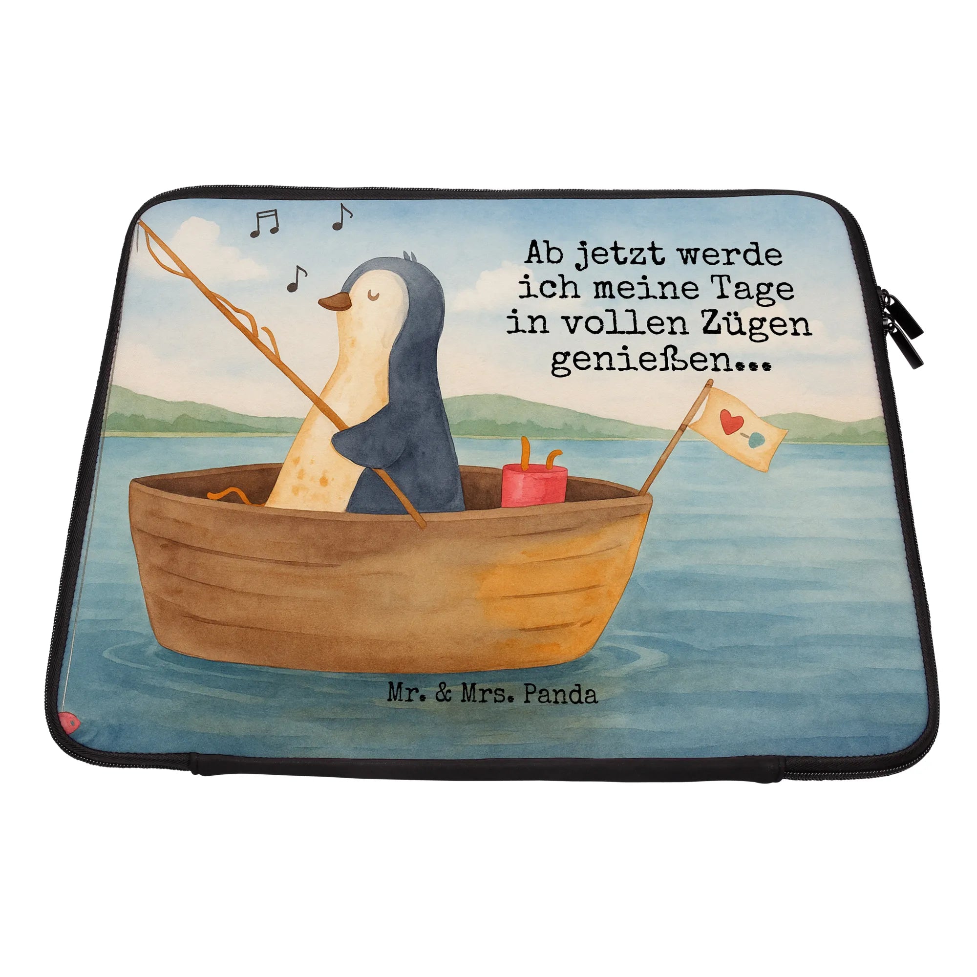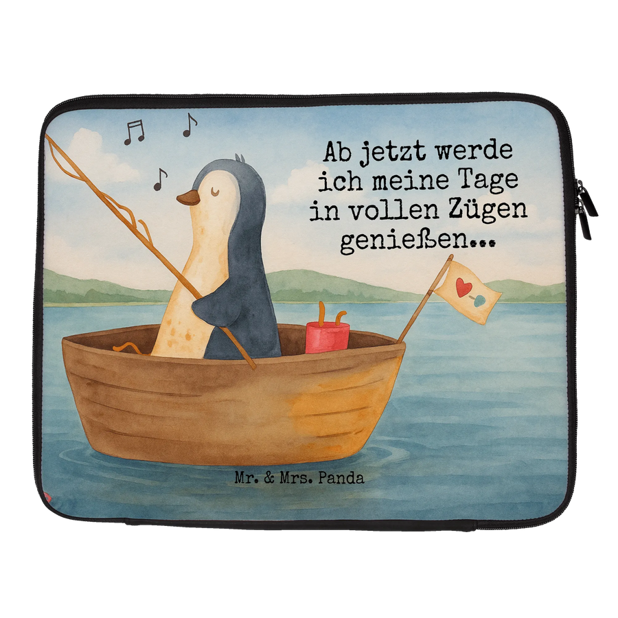Mr. & Mrs. Panda Notebook Tasche „Pinguin Angelboot“ – deine neue, fröhliche Laptop-Hülle mit Herz und Humor. Das handgezeichnete Pinguin-Motiv zeigt unseren kleinen Freund in einem Angelboot, der Bonbons an den Haken holt. Der liebevolle Spruch „Ab jetzt werde ich meine Tage in vollen Zügen genießen...“ macht die Tasche zu einem mutmachenden Begleiter für Neuanfänge, als Geschenk bei Liebeskummer oder einfach als tägliche Gute-Laune-Quelle.