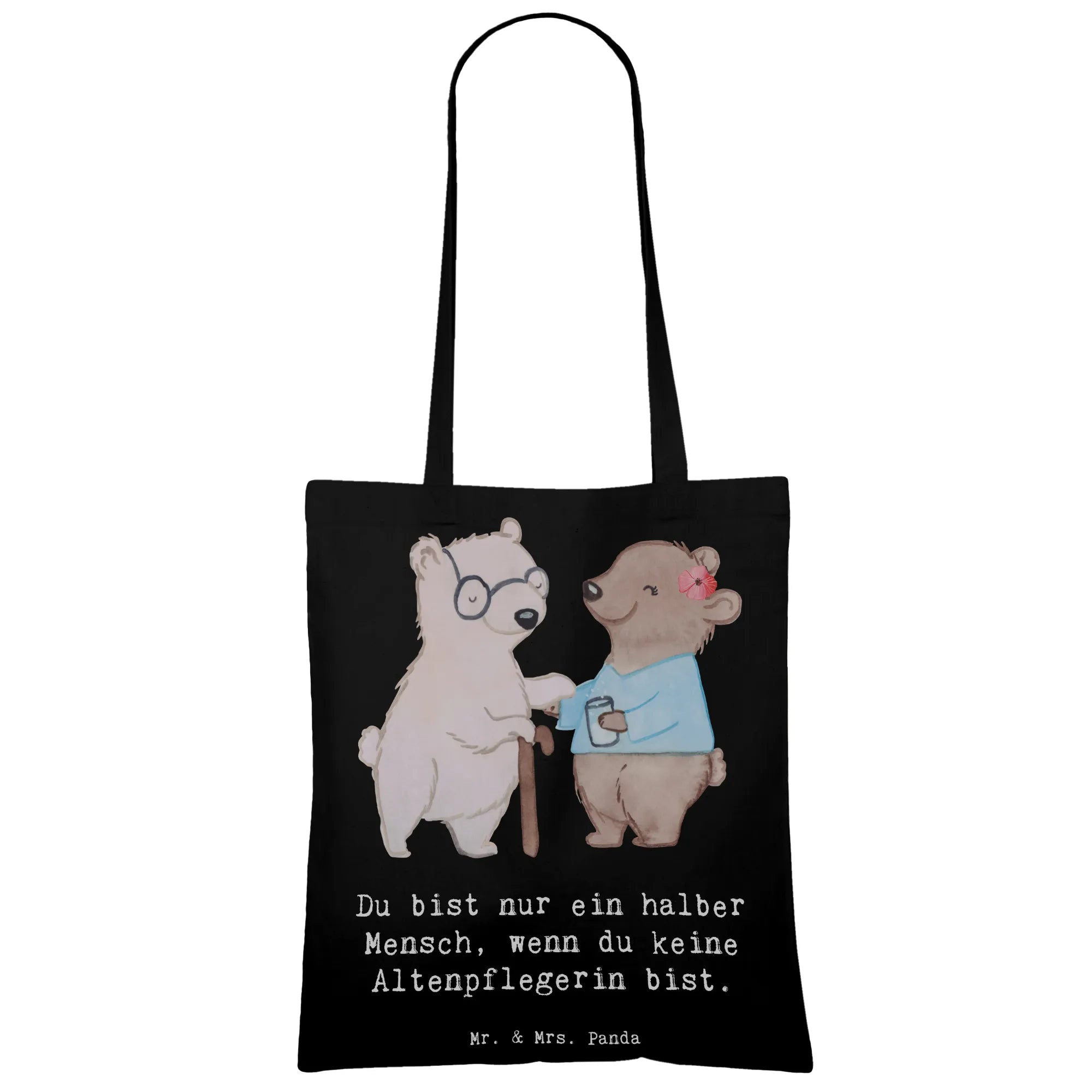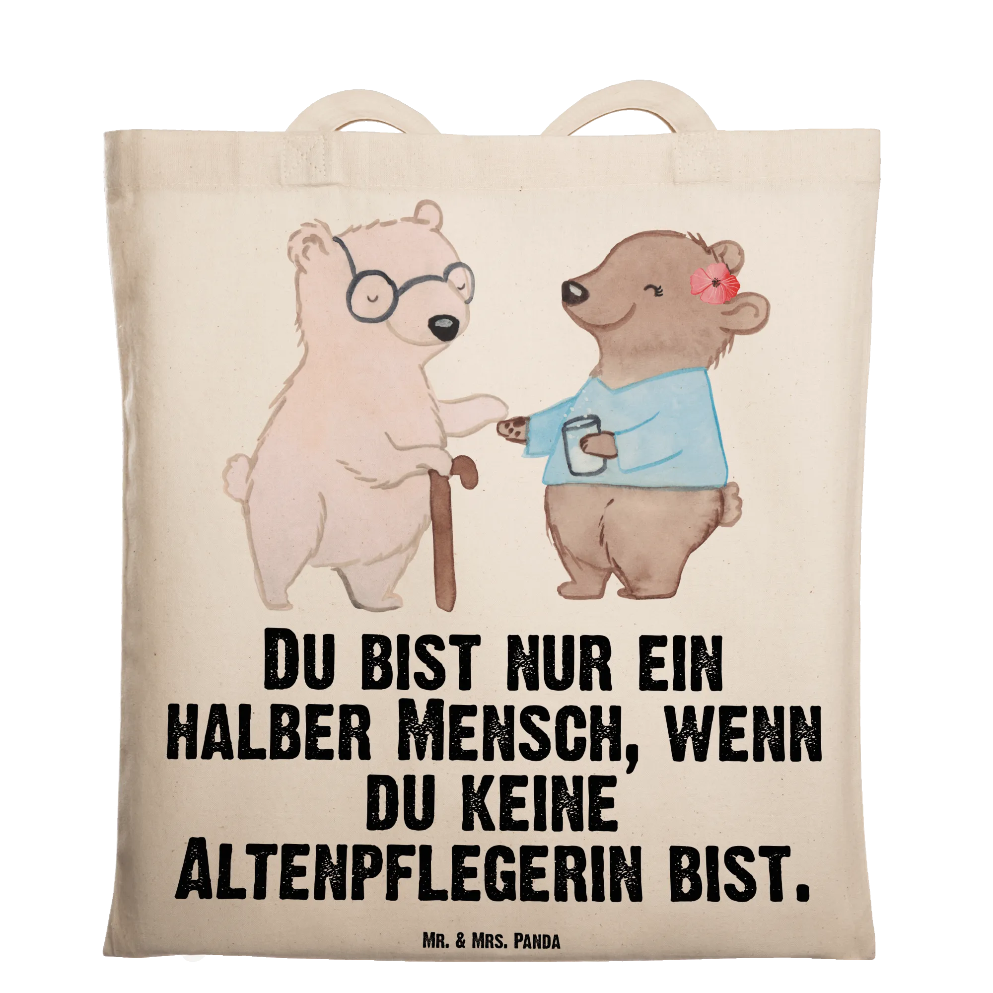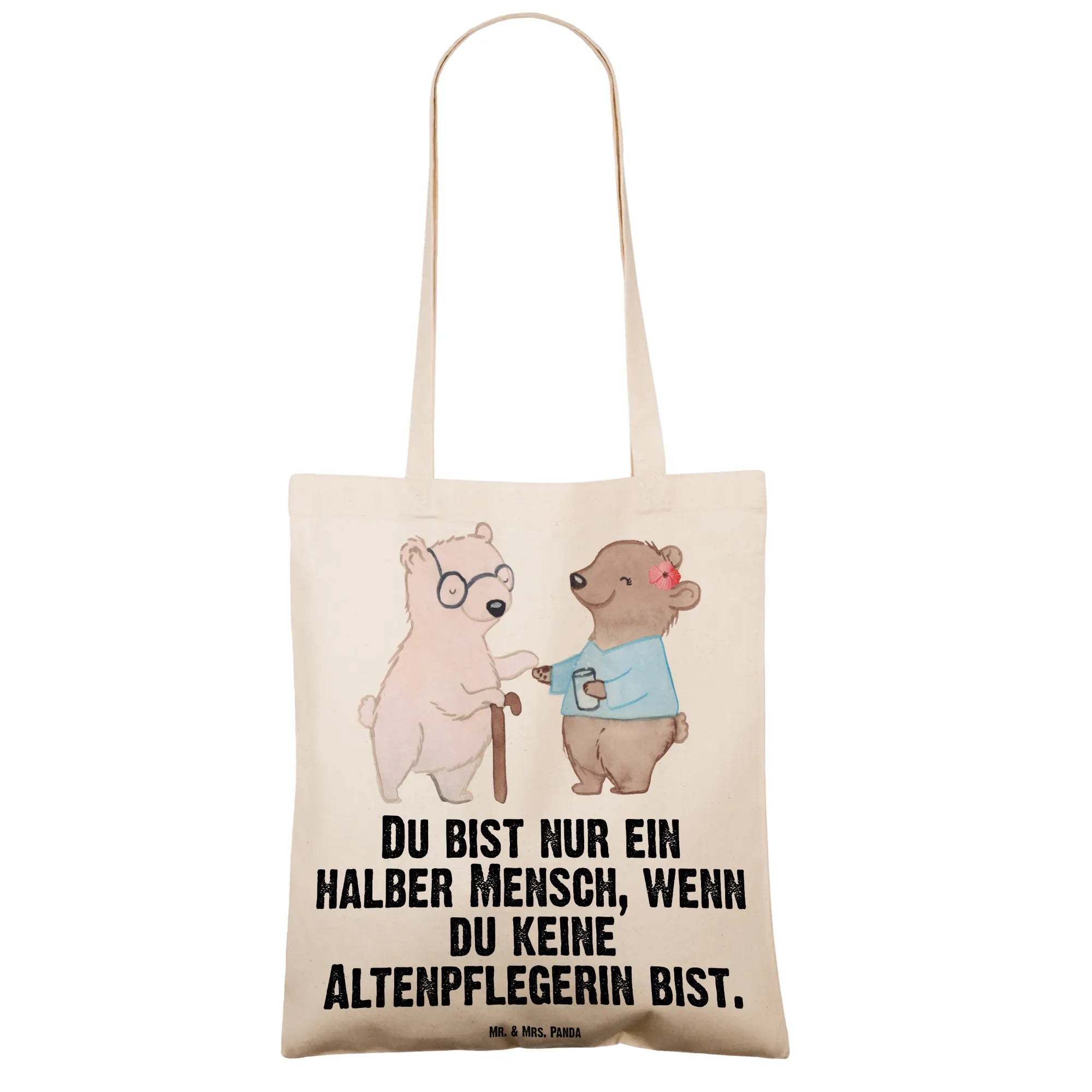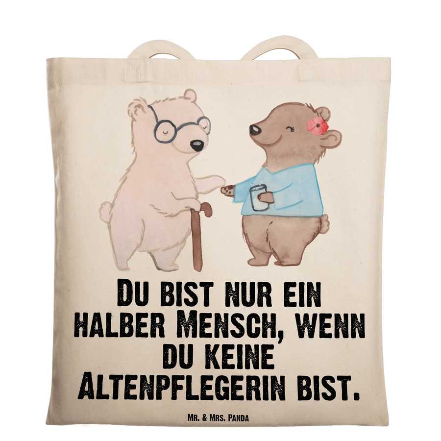Ein Herzensgeschenk für echte Alltagsheldinnen: Unsere Tragetasche "Altenpflegerin mit Herz" von Mr. & Mrs. Panda vereint niedliche Illustration, liebevollen Spruch und praktischen Nutzen. Das Motiv zeigt einen kleinen Bären, der einer älteren Bären-Dame mit Krückstock hilft — ein Bild voller Wärme und Wertschätzung, begleitet vom Spruch: "Du bist nur ein halber Mensch, wenn du keine Altenpflegerin bist."