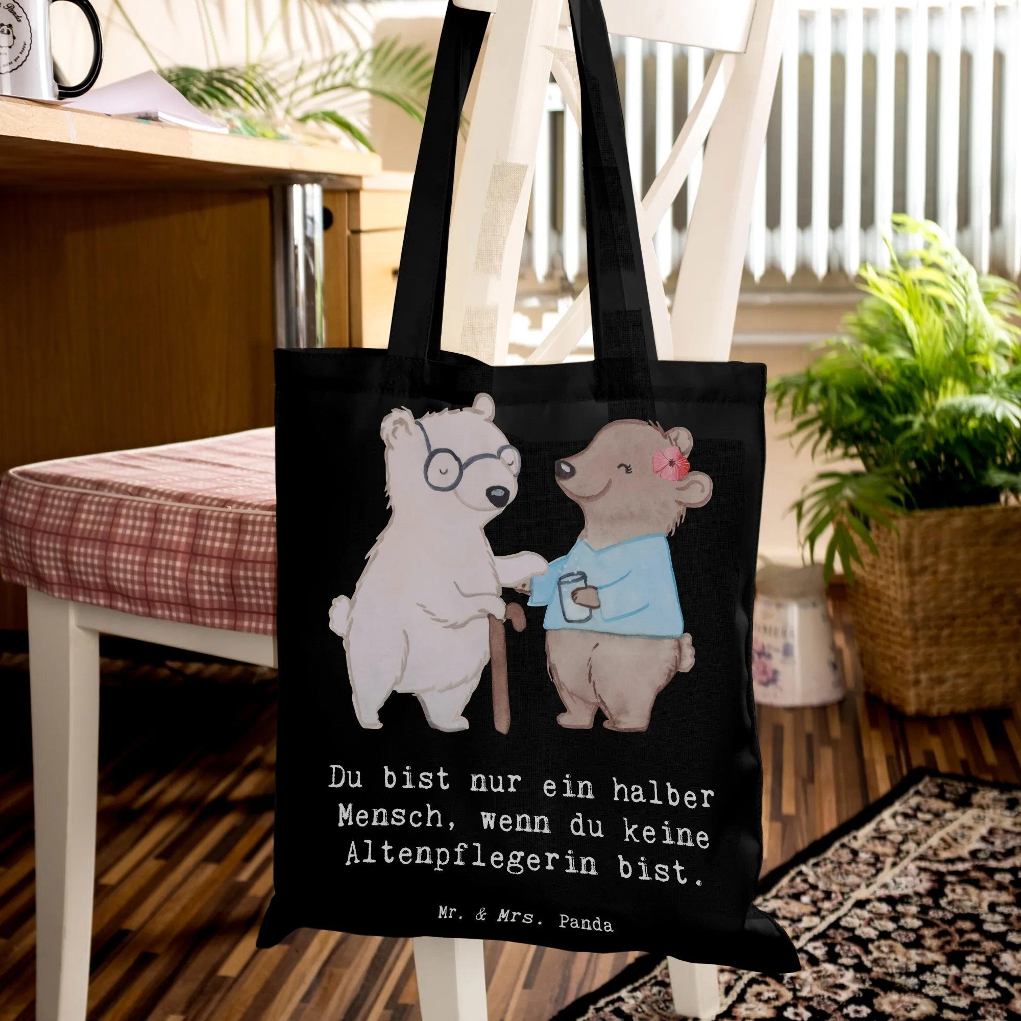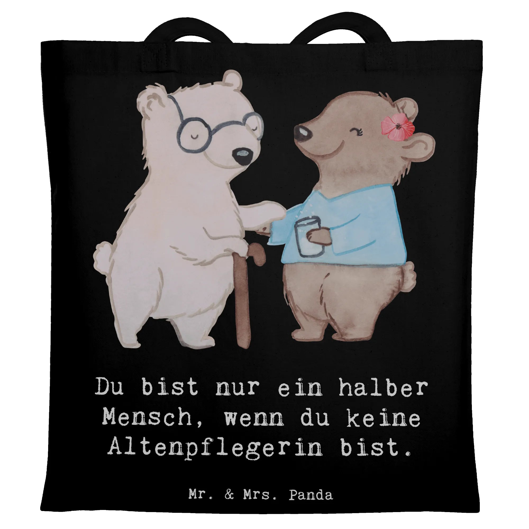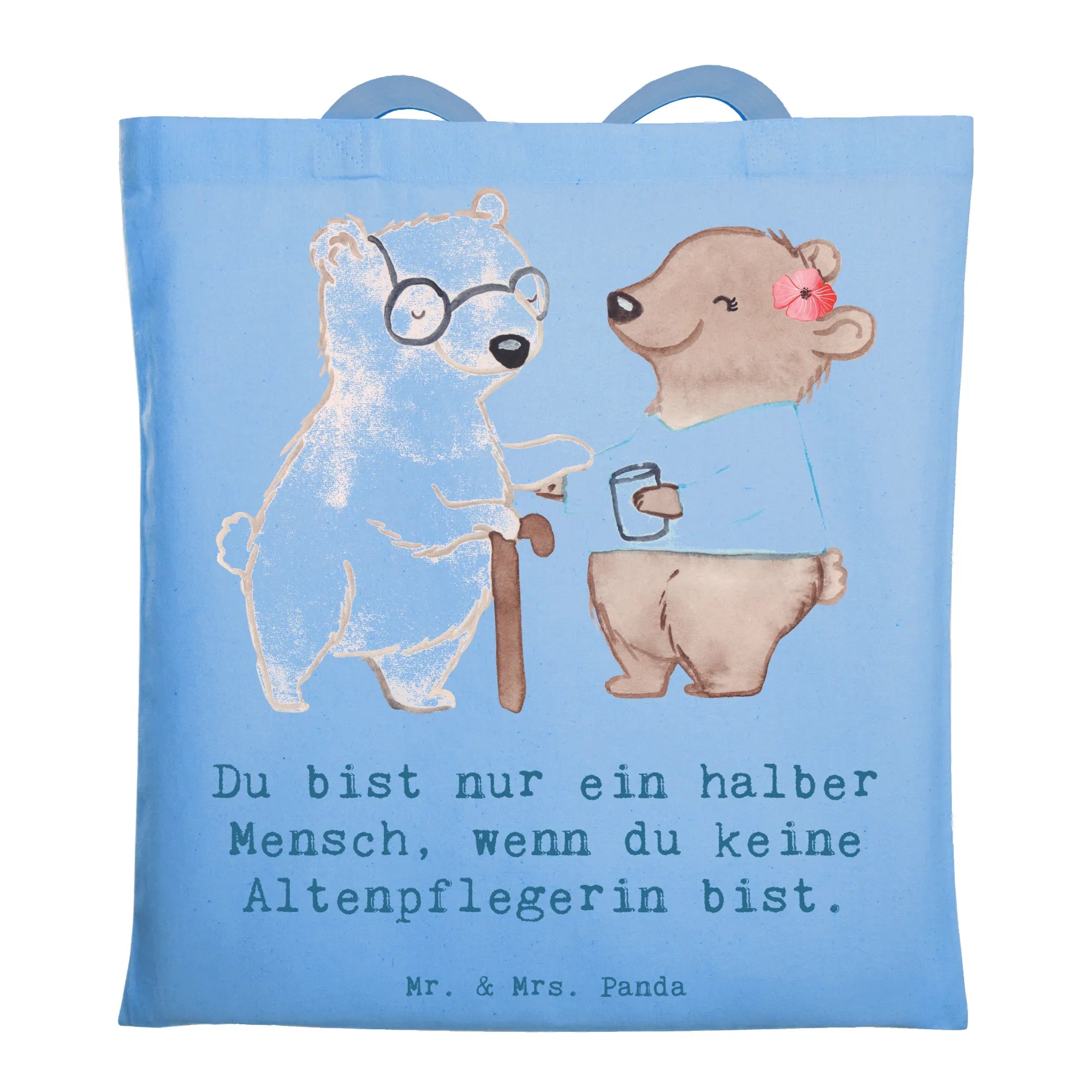 Ein Herzensgeschenk für echte Alltagsheldinnen: Unsere Tragetasche "Altenpflegerin mit Herz" von Mr. & Mrs. Panda vereint niedliche Illustration, liebevollen Spruch und praktischen Nutzen. Das Motiv zeigt einen kleinen Bären, der einer älteren Bären-Dame mit Krückstock hilft — ein Bild voller Wärme und Wertschätzung, begleitet vom Spruch: "Du bist nur ein halber Mensch, wenn du keine Altenpflegerin bist."