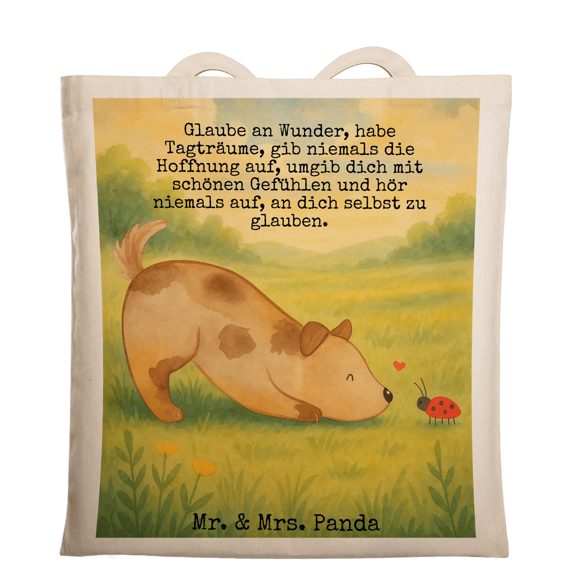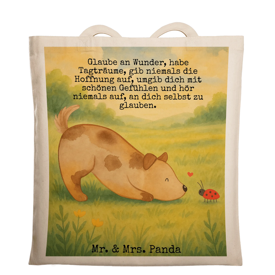 Die schöne Tragetasche aus der Hunde Kollektion von Mr. & Mrs. Panda vereint Charme und Alltagstauglichkeit. Das liebevoll illustrierte Motiv zeigt einen niedlichen Hund, der gespannt einen kleinen Marienkäfer betrachtet. Ergänzt wird das Motiv durch den inspirierenden Spruch: „Glaube an Wunder, habe Tagträume, gib niemals die Hoffnung auf, umgib dich mit schönen Gefühlen und hör niemals auf, an dich selbst zu glauben.“ Ein echter Gute-Laune-Begleiter für den Alltag.