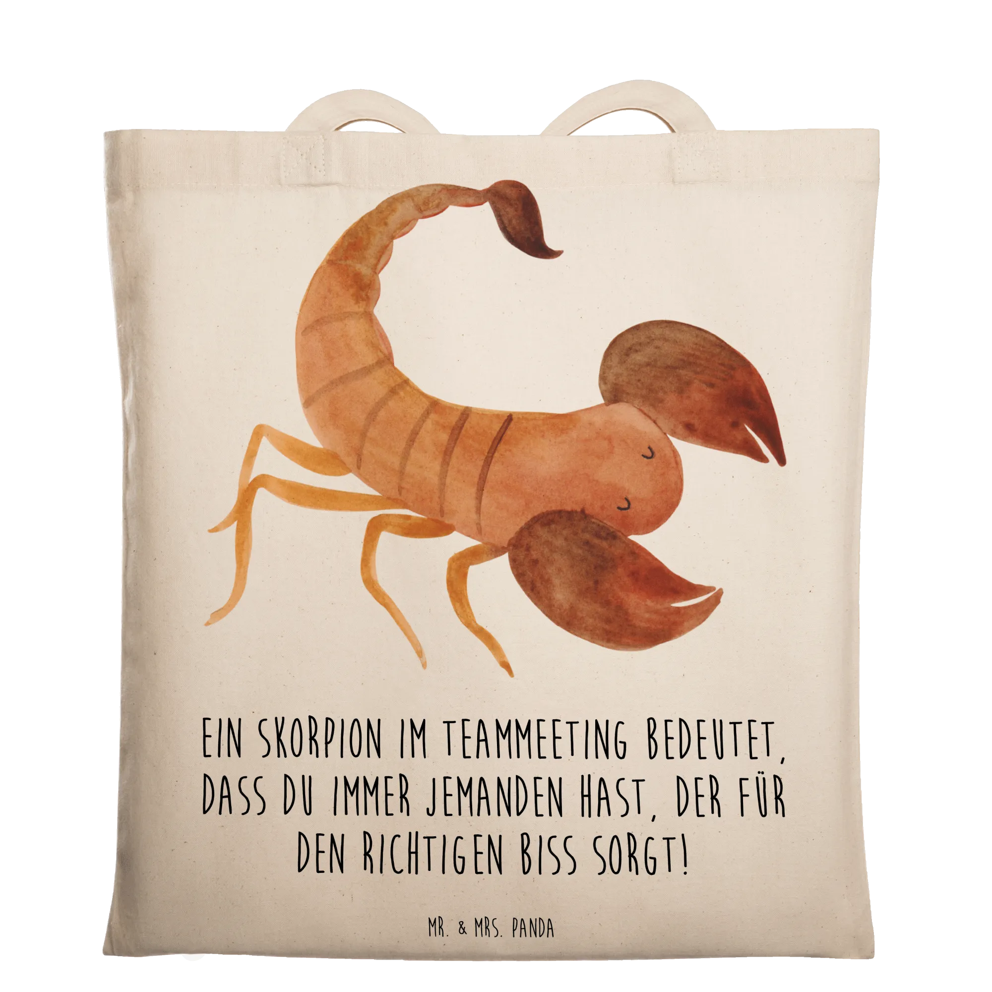 Das Motiv zeigt den Spruch: 'Ein Skorpion im Teammeeting bedeutet, dass du immer jemanden hast, der für den richtigen Biss sorgt!', der garantiert ein Schmunzeln auf die Lippen zaubert. Egal ob du die Tragetasche für dich selbst oder als Geschenk für Freunde, Kollegen oder Familie kaufst, sie ist perfekt geeignet, um den einzigartigen Charakter des Skorpions zu zelebrieren.
