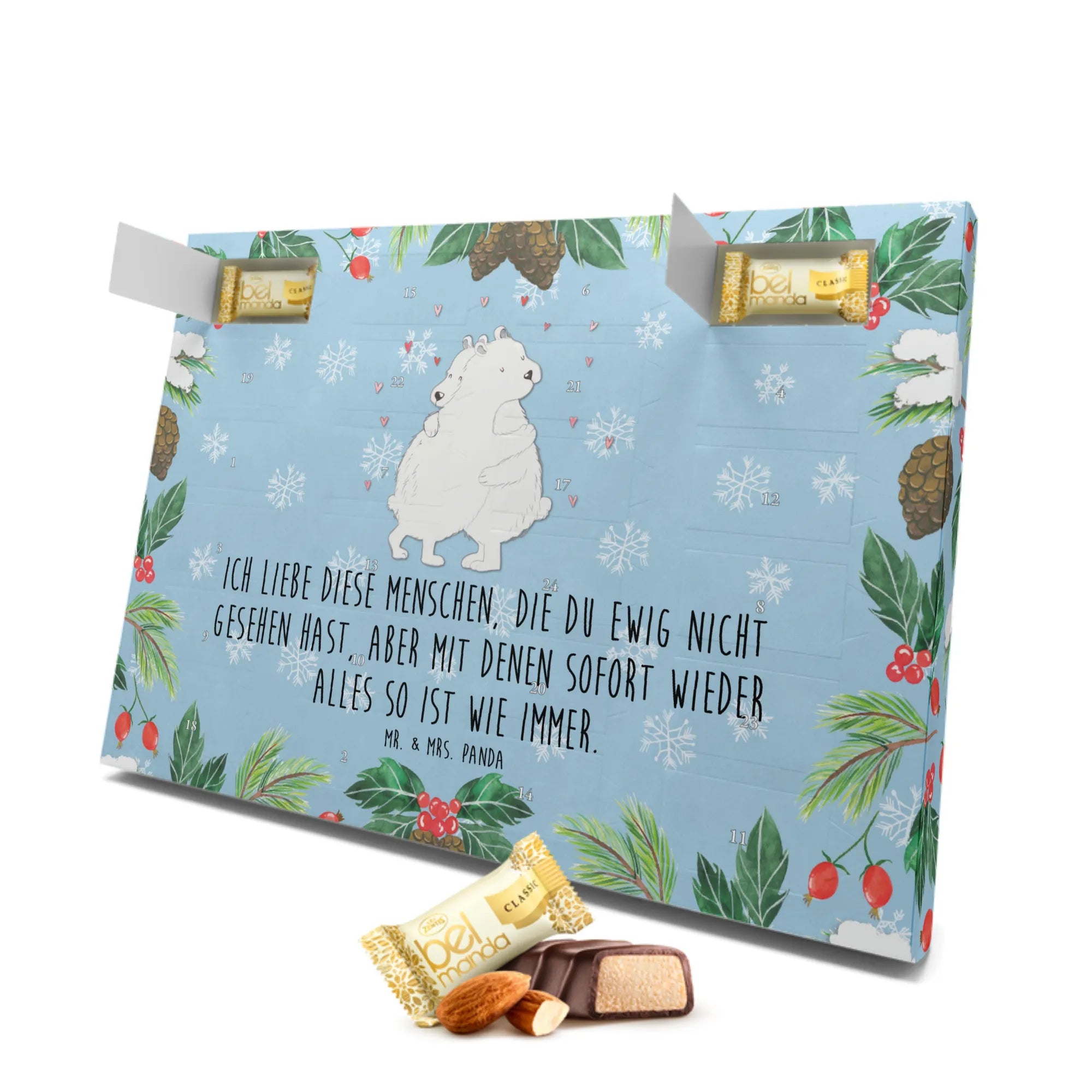 Der wunderschöne Marzipan Adventskalender "Eisbär Umarmen" aus der Small World Kollektion von Mr. & Mrs. Panda ist das perfekte Geschenk für die Adventszeit! Mit seinem liebevoll gestalteten Motiv von zwei umarmenden Eisbären bringt er sofort gute Laune und verbreitet ein warmes Gefühl der Verbundenheit.
