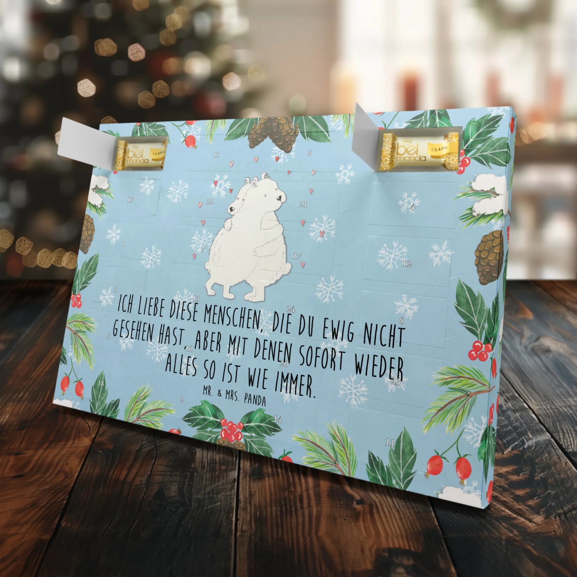 Der Marzipan Adventskalender "Eisbär Umarmen" von Mr. & Mrs. Panda ist mehr als nur ein Adventskalender. Er ist ein wunderbares Geschenk für alle Tierliebhaber, die die Vorweihnachtszeit genießen möchten. Mit bunten Tiermotiven und einem liebevollen Design voller guter Laune, bringt dieser Kalender Freude in jedes Zuhause. Das Motiv zeigt zwei süße Eisbären, die sich innig umarmen, und strahlt dabei Wärme und Zuneigung aus.
