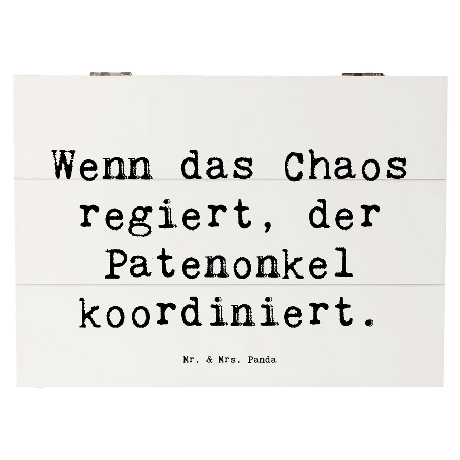 Mit dem liebevollen Spruch "Wenn das Chaos regiert, der Patenonkel koordiniert." zeigt die Kiste auf charmante Weise, wie wichtig der Patenonkel in der Rolle als geistiger Führer und Unterstützer des Patenkindes ist. Diese Kiste ist somit nicht nur eine Aufbewahrungsbox, sondern auch ein täglicher Reminder an die wunderschöne Bindung zwischen Patenonkel und Patenkind.