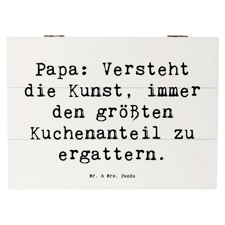 Die wunderschöne Holzkiste von Mr. & Mrs. Panda ist das perfekte Geschenk für jeden Papa! Mit dem liebevollen Motiv und dem charmanten Spruch "Papa: Versteht die Kunst, immer den größten Kuchenanteil zu ergattern." wird diese Kiste zum idealen Aufbewahrungsort für all die wertvollen Erinnerungen, die wir im Laufe der Jahre sammeln.