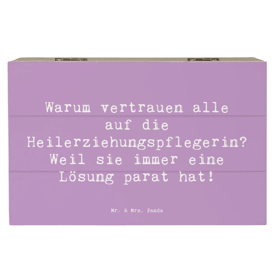 Die wunderschöne Holzkiste von Mr. & Mrs. Panda, bedruckt mit dem Spruch 'Warum vertrauen alle auf die Heilerziehungspflegerin? Weil sie immer eine Lösung parat hat!', ist das perfekte Geschenk für alle Heilerziehungspflegerinnen in Deinem Leben.