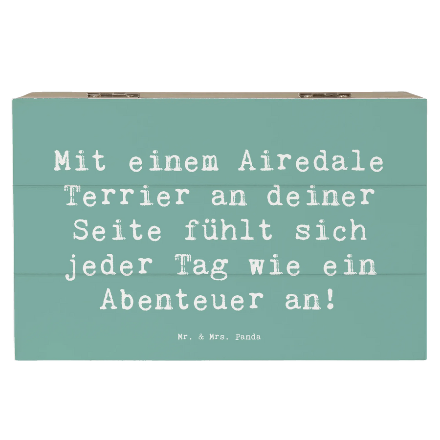 Die wunderschöne Holzkiste mit dem niedlichen Airedale Terrier Motiv von Mr. & Mrs. Panda ist das perfekte Geschenk für alle Hundefans! Mit dem Spruch "Mit einem Airedale Terrier an deiner Seite fühlt sich jeder Tag wie ein Abenteuer an!" zaubert diese Kiste ein Lächeln auf die Gesichter Deiner Liebsten und ist gleichzeitig ein praktisches Utensil zum Aufbewahren wichtiger Erinnerungen.