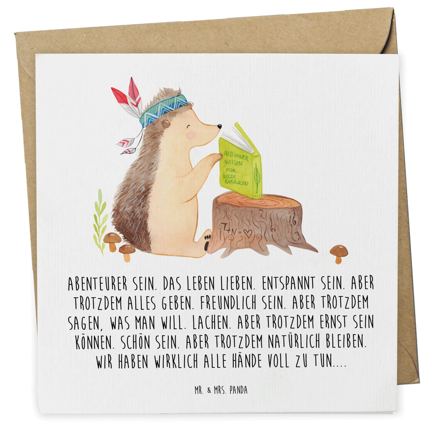 \nOb als Zusendung zum Geburtstag, als Einladung zu einem Abenteuer oder einfach nur als kreative Geste - diese Karte ist immer eine gute Wahl. Lass dich von der Magie der Waldtiere Kollektion inspirieren und bring etwas Freude in das Leben der Menschen, die dir am Herzen liegen! Am Ende des Tages reflektiert die "Igel Indianer" Karte die wichtige Botschaft: Sei ein Abenteurer, liebe das Leben, entspanne dich und sei freundlich – aber vergiss nicht, auch ehrlich deine Meinung zu sagen. Diese Kombination aus ihrer warmen Botschaft und dem niedlichen Design macht die Deluxe Karte von Mr. & Mrs. Panda zu einem unvergesslichen Geschenk für jeden Anlass!