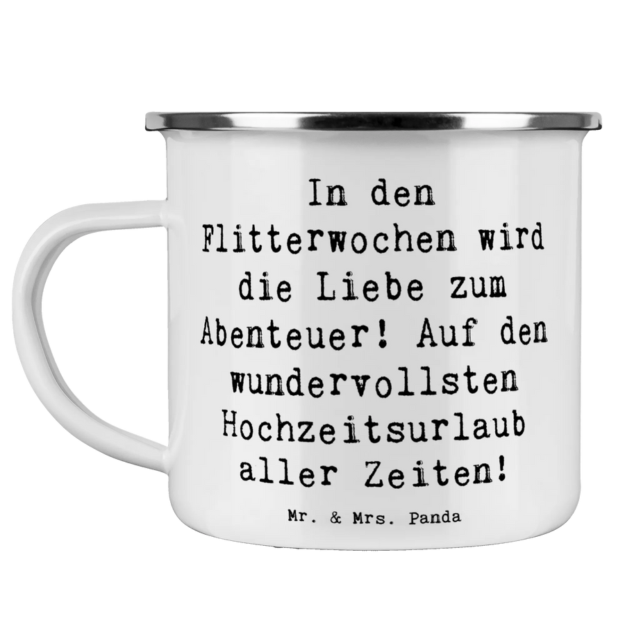 Entdecke die zauberhafte Camping Emaille Tasse "Flitterwochen" von Mr. & Mrs. Panda! Diese wunderschöne und beständige Metalltasse ist das perfekte Geschenk für frisch verheiratete Paare, die ihre Flitterwochen in der Natur verbringen möchten. Ob beim Camping, beim Wandern oder auf dem Roadtrip, mit dieser Tasse aus hochwertiger Emaille wird jeder Schluck aus ihr zu einem süßen Erlebnis. Der liebevoll gestaltete Slogan "In den Flitterwochen wird die Liebe zum Abenteuer! Auf den wundervollsten Hochzeitsurlaub aller Zeiten!" macht die Tasse zu einem ganz besonderen Erinnerungsstück, das die gemeinsame Zeit in der Natur feiert.
