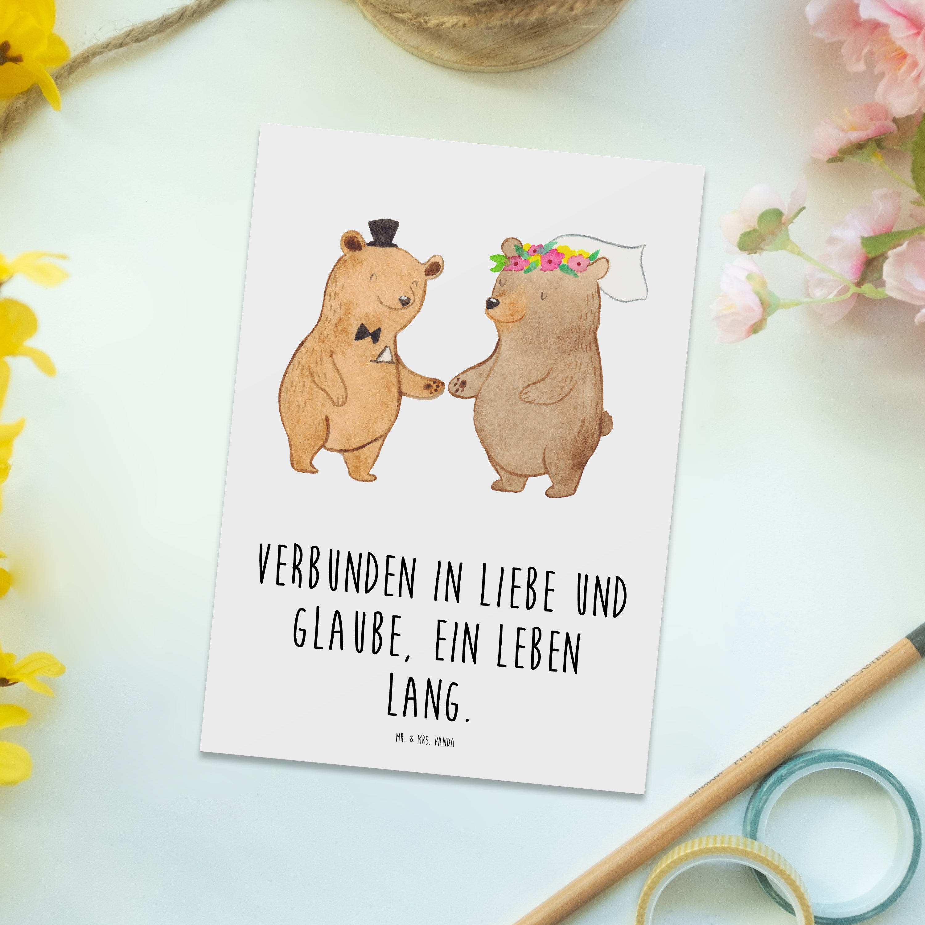 Die perfekte Postkarte zur Kirchlichen Trauung! Diese einzigartige Postkarte von Mr. & Mrs. Panda ist nicht nur ein wunderschönes Accessoire für einen der schönsten Tage im Leben, sondern auch eine liebevolle Erinnerung an einen besonderen Moment. Mit dem zauberhaften Motiv "Verbunden in Liebe und Glaube, ein Leben lang" bringt diese Karte sowohl Romantik als auch Freude in jede Hochzeitsfeier.