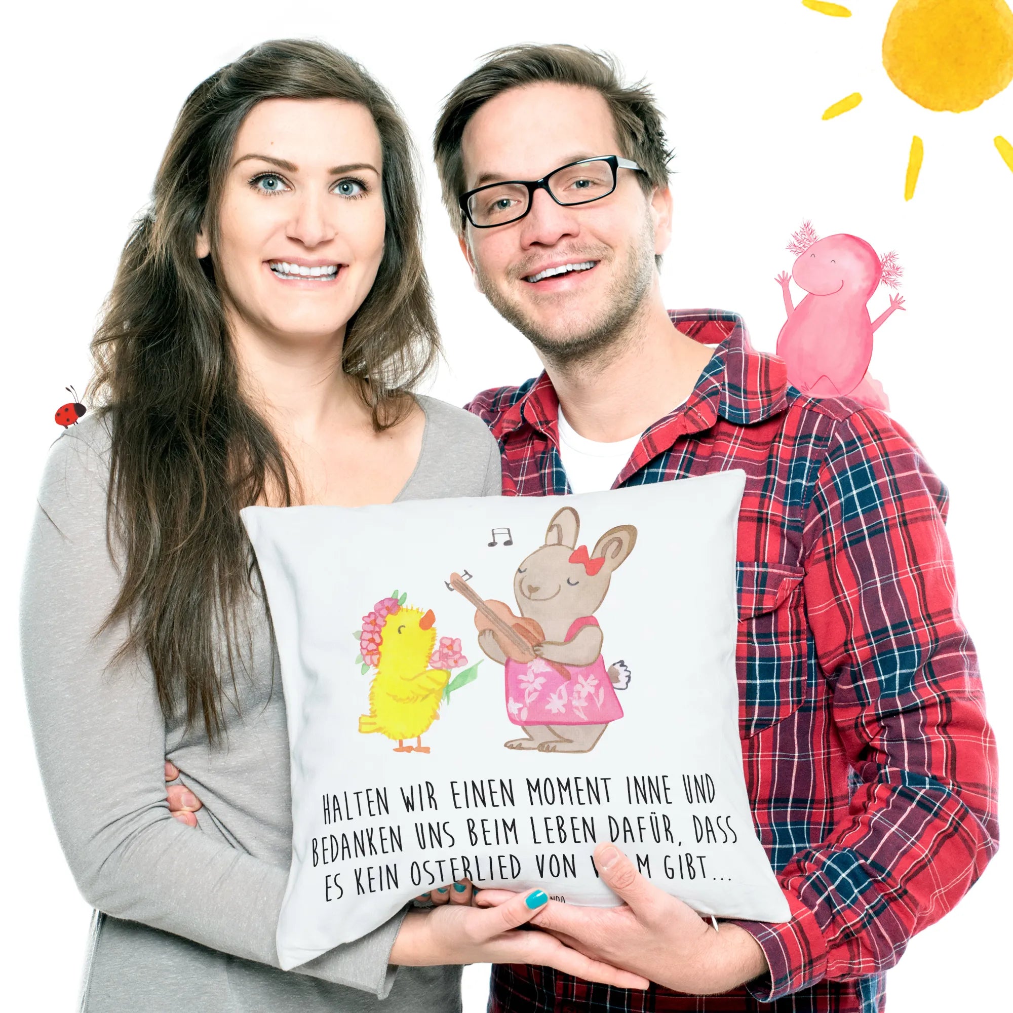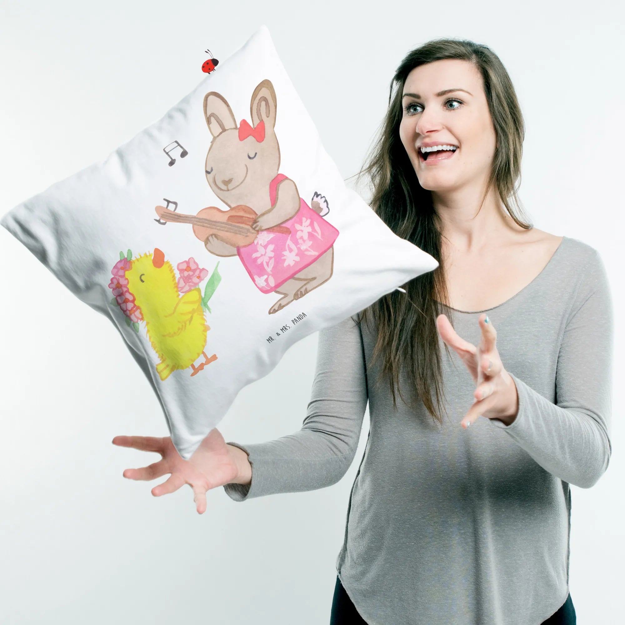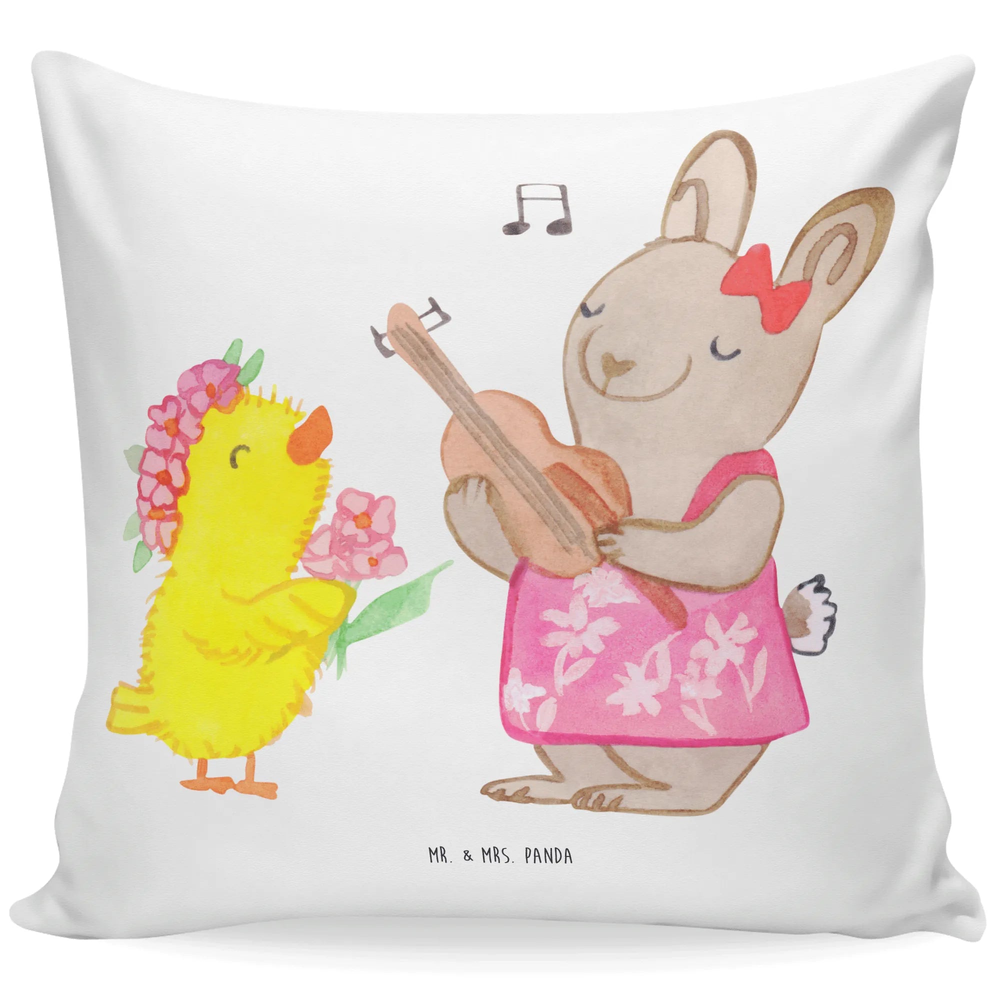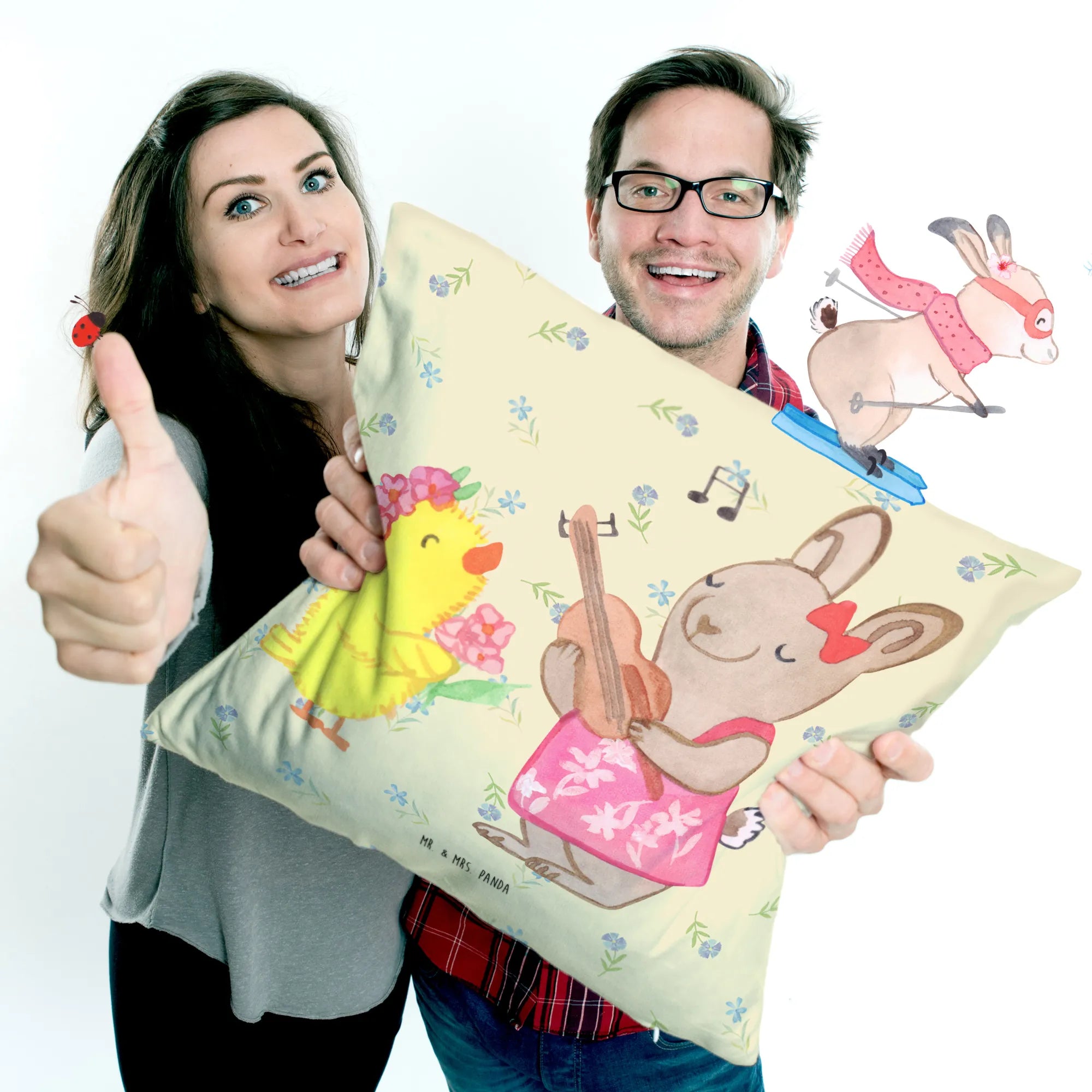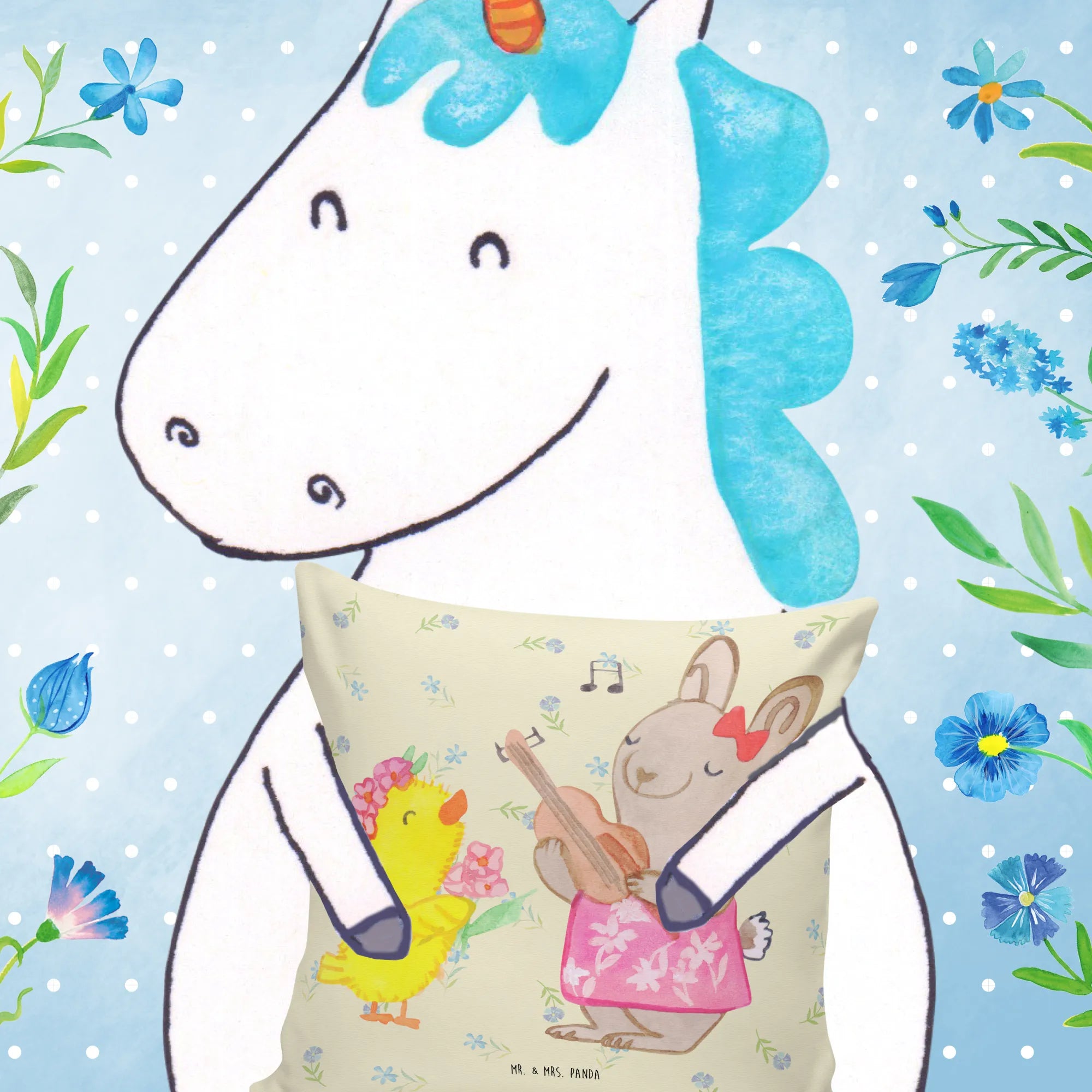 Das 40x40 Kissen "Ostern Frühlingsgefühle" aus der Ostern - Kollektion von Mr. & Mrs. Panda ist das perfekte Geschenk für alle, die die Freude und die Farben des Frühlings und Ostens in ihr Zuhause bringen möchten. Mit einem zauberhaften Design zeigt das Kissen einen süßen Hase im Sommerkleid, der einem kleinen, niedlichen Küken auf seiner Gitarre ein Lied vorspielt. Dieses liebevoll gestaltete Motiv bringt ein fröhliches Gefühl in jedes Wohn- oder Kinderzimmer und versüßt die Osterzeit.