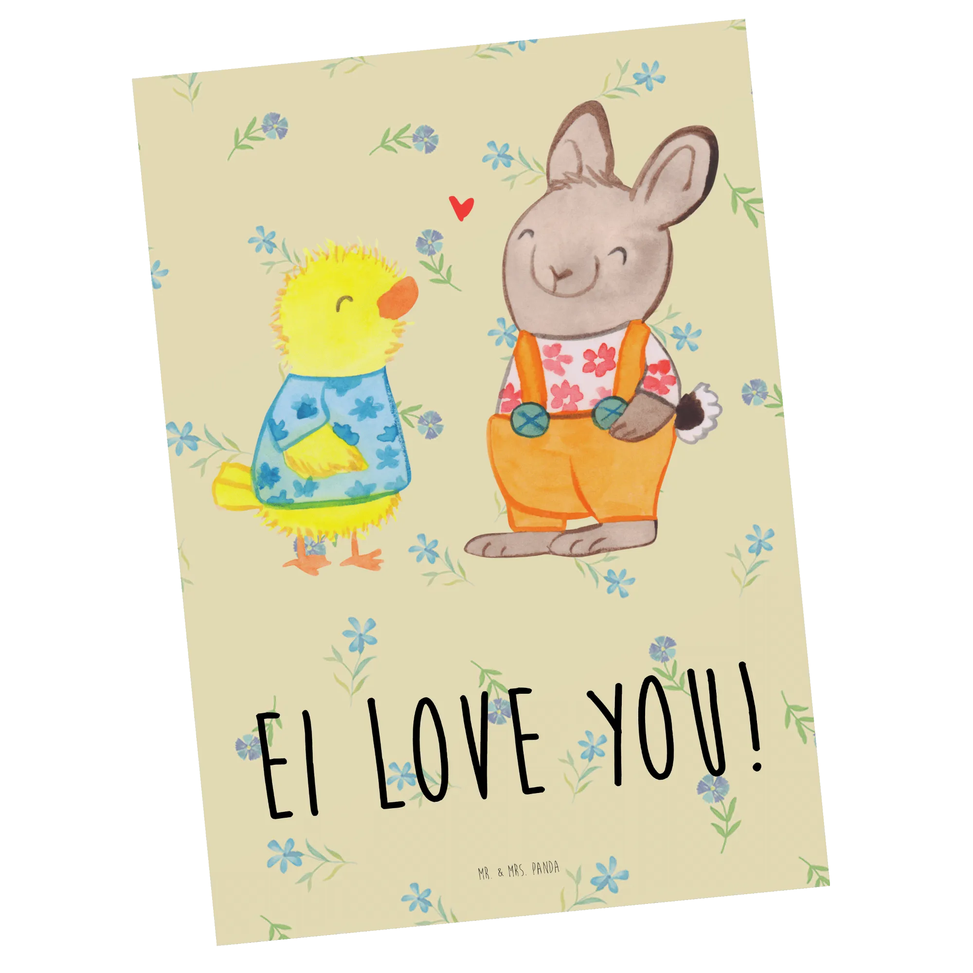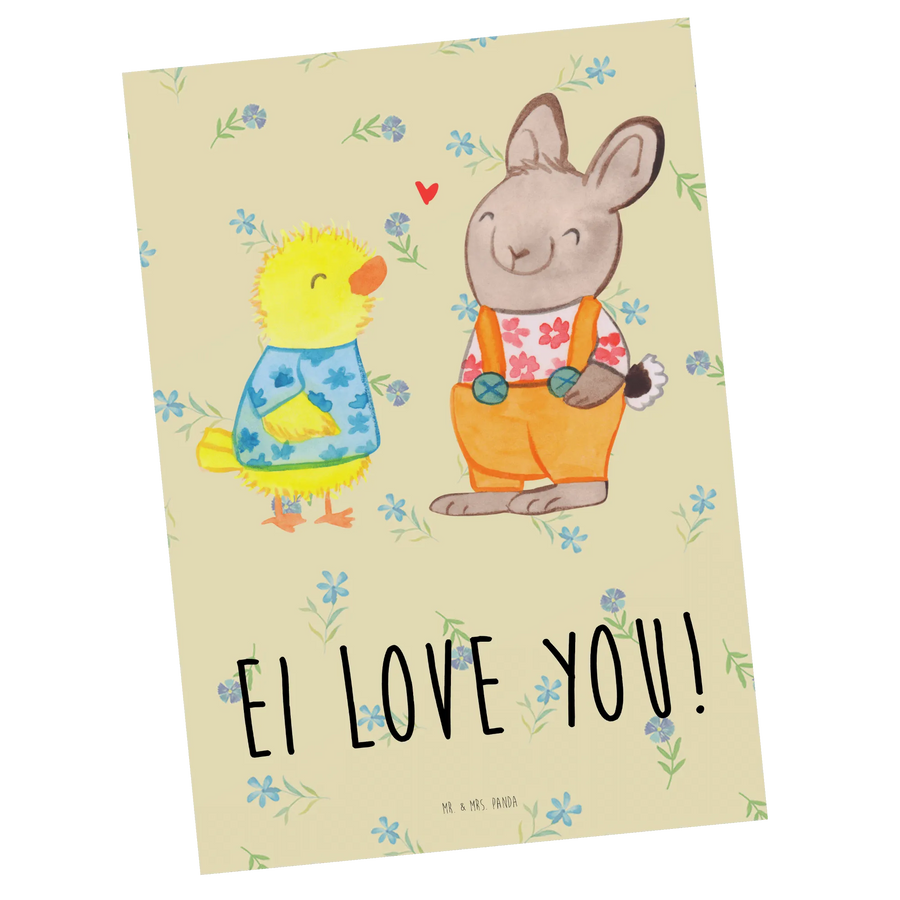 Diese Postkarte, die liebevoll mit einem süßen Hasen in Latzhose und einem kleinen Küken gestaltet ist, erzählt eine bezaubernde Geschichte von Freundschaft und Verbundenheit. Die fröhlichen Farben und die liebevollen Details werden jedes Herz erwärmen und bringen Frühlingsgefühle in dein Zuhause. Diese Karte ist nicht nur ein wunderbares Dekorationselement, sondern sie könnte auch eine perfekte Grußkarte sein, um einer besonderen Person zu sagen: "Ei love you!".