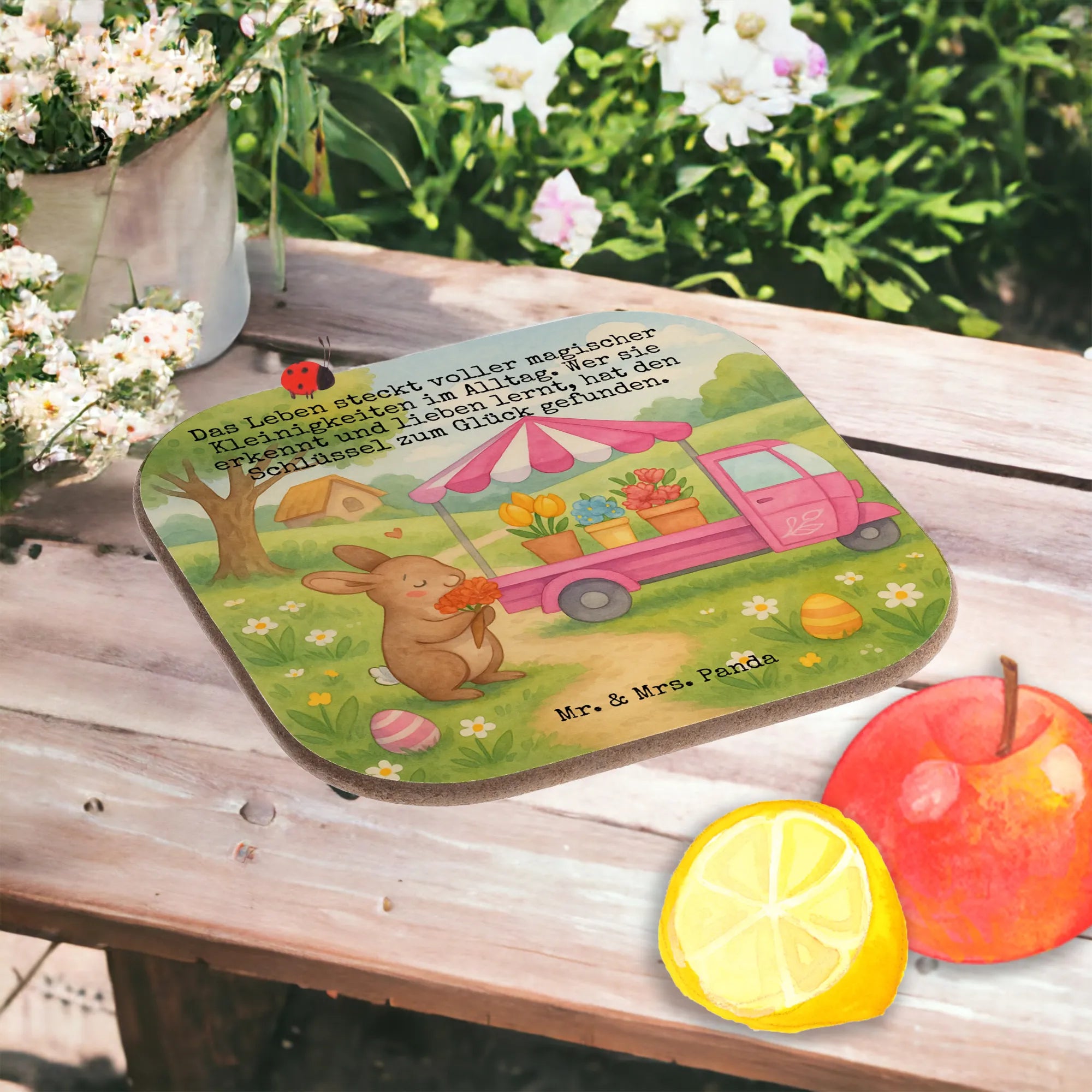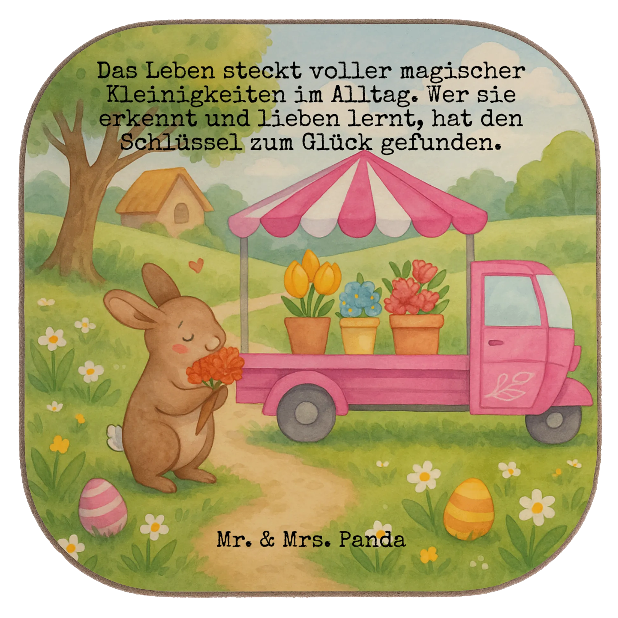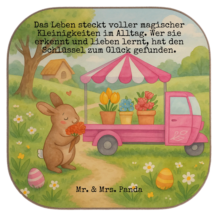 Ein fröhlicher Frühlingsgruß für deinen Tisch! 🌷 Unser quadratischer Untersetzer "Osterhase Blumenwagen" aus der Ostern - Kollektion von Mr. & Mrs. Panda zaubert sofort Osterstimmung in dein Zuhause. Das liebevoll illustrierte Motiv zeigt einen glücklichen Osterhasen an einem bunten Blumenverkaufsstand auf einem pinken Wagen mit der Aufschrift "GARDEN". Der Hase hält einen orange-roten Strauß, umgeben von gelben Tulpen, blauen Blüten mit Punkten und roten Akzenten. Dazu trägt der Untersetzer den zarten Spruch: „Das Leben steckt voller magischer Kleinigkeiten im Alltag. Wer sie erkennt und lieben lernt, hat den Schlüssel zum Glück gefunden.”