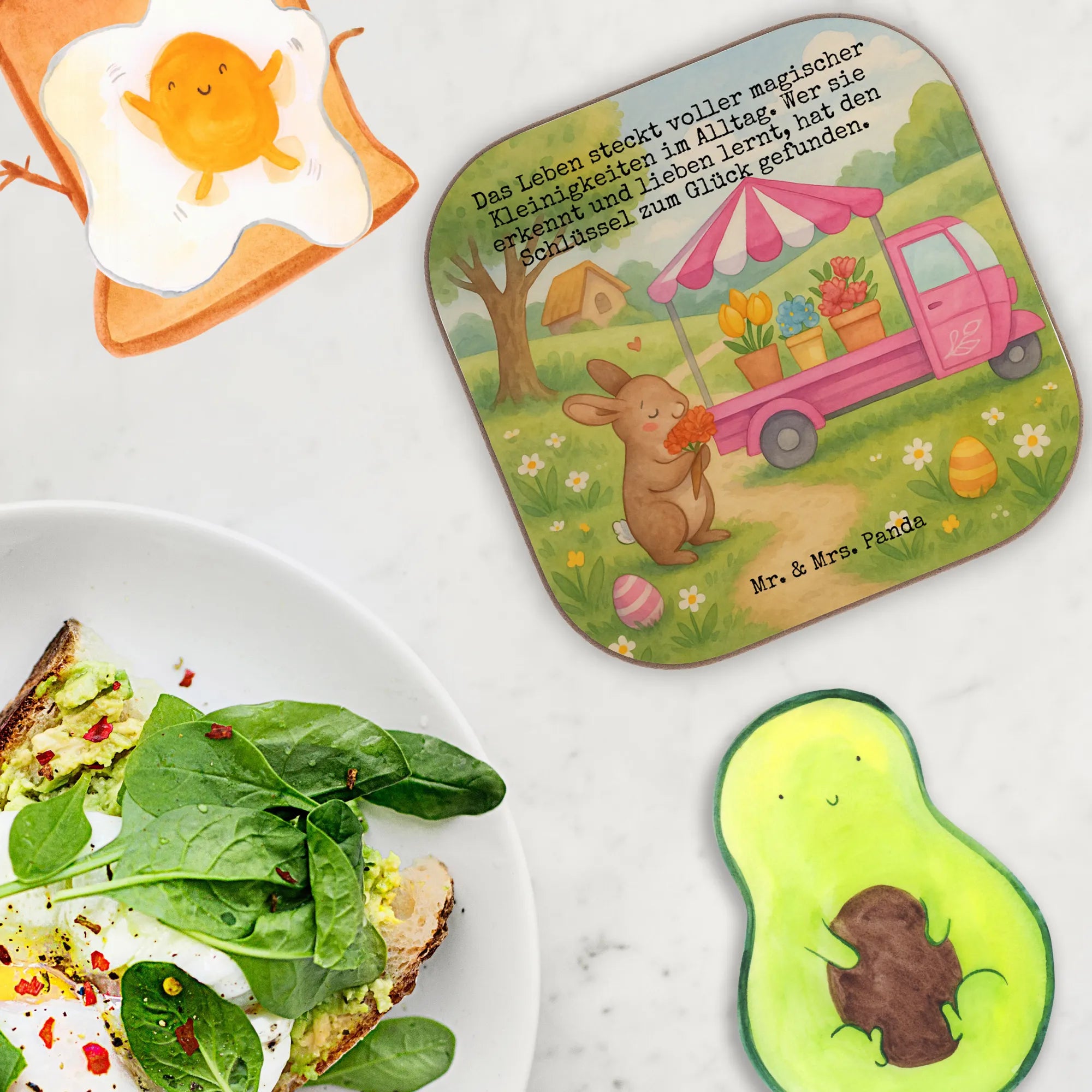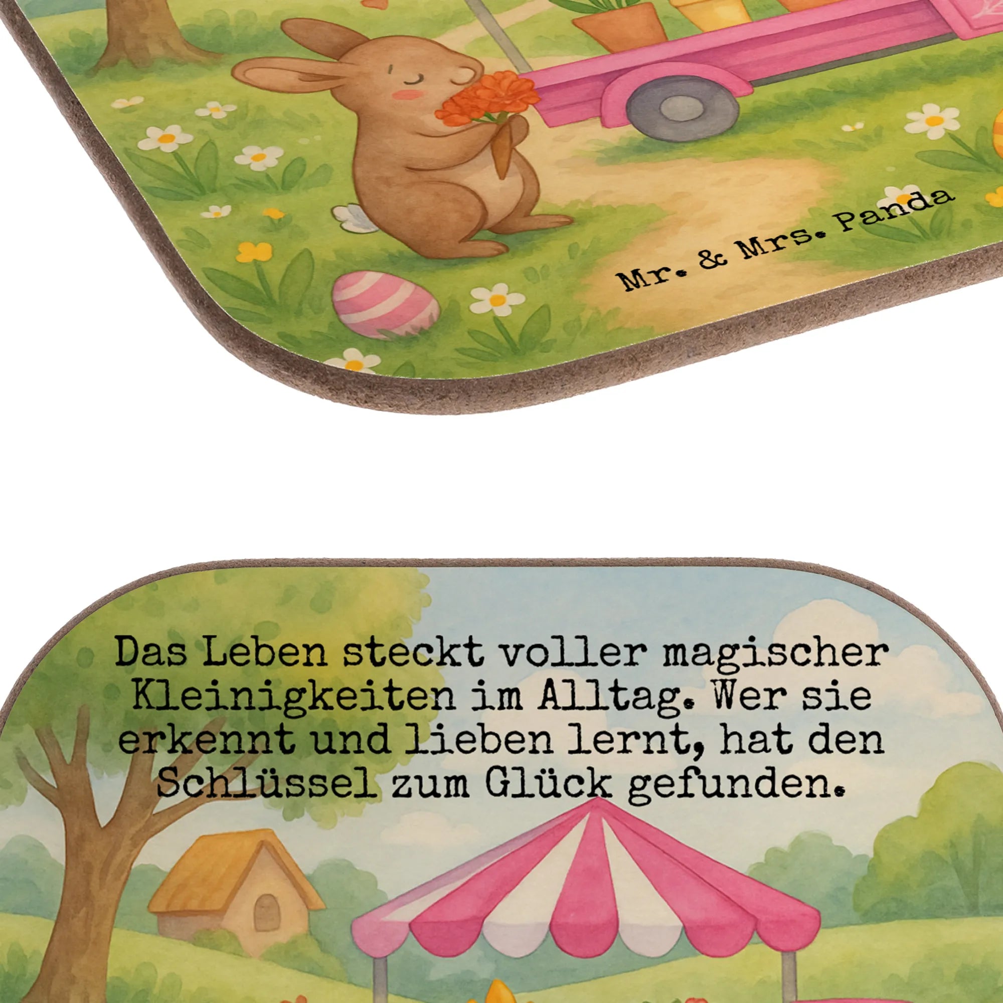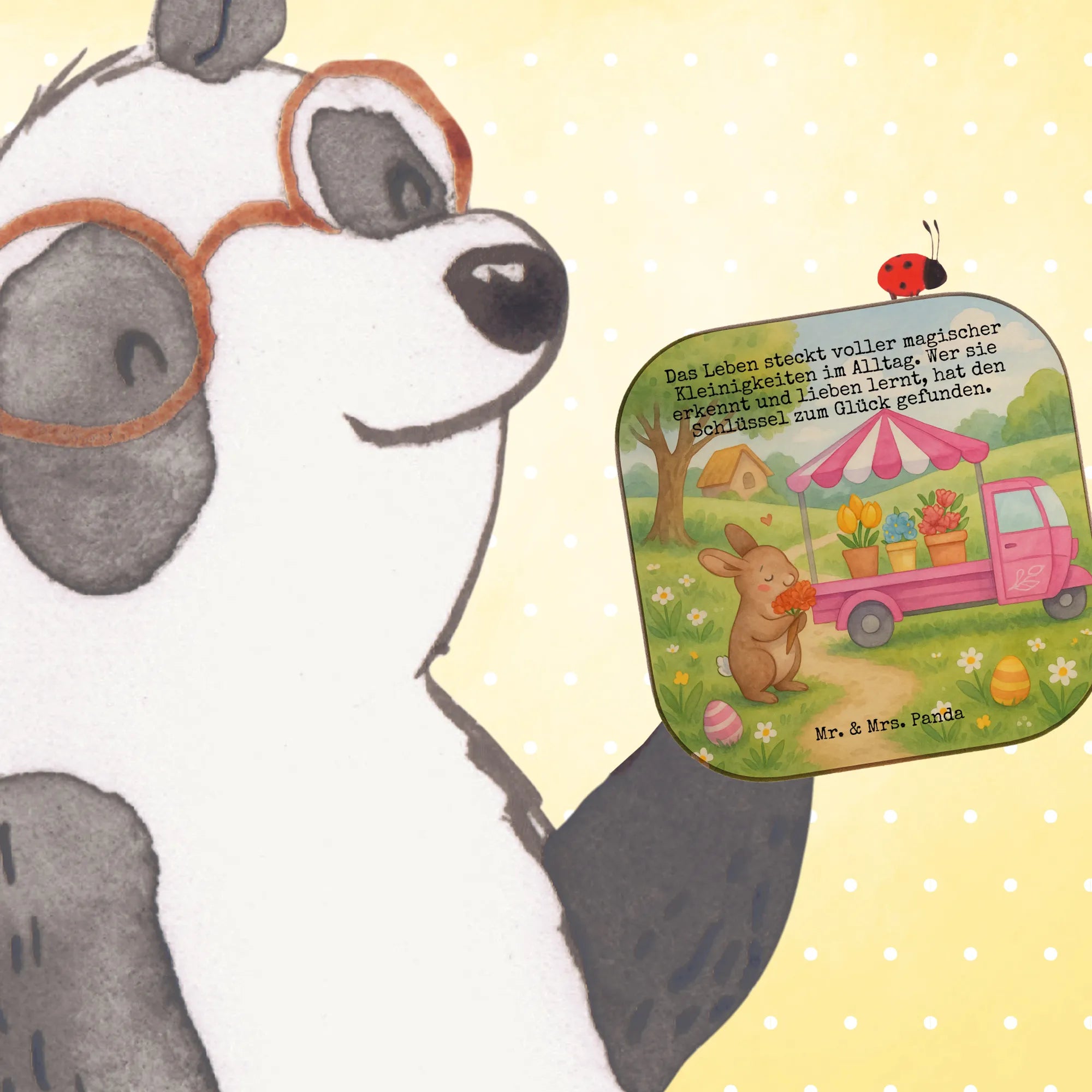 Ein fröhlicher Frühlingsgruß für deinen Tisch! 🌷 Unser quadratischer Untersetzer "Osterhase Blumenwagen" aus der Ostern - Kollektion von Mr. & Mrs. Panda zaubert sofort Osterstimmung in dein Zuhause. Das liebevoll illustrierte Motiv zeigt einen glücklichen Osterhasen an einem bunten Blumenverkaufsstand auf einem pinken Wagen mit der Aufschrift "GARDEN". Der Hase hält einen orange-roten Strauß, umgeben von gelben Tulpen, blauen Blüten mit Punkten und roten Akzenten. Dazu trägt der Untersetzer den zarten Spruch: „Das Leben steckt voller magischer Kleinigkeiten im Alltag. Wer sie erkennt und lieben lernt, hat den Schlüssel zum Glück gefunden.”
