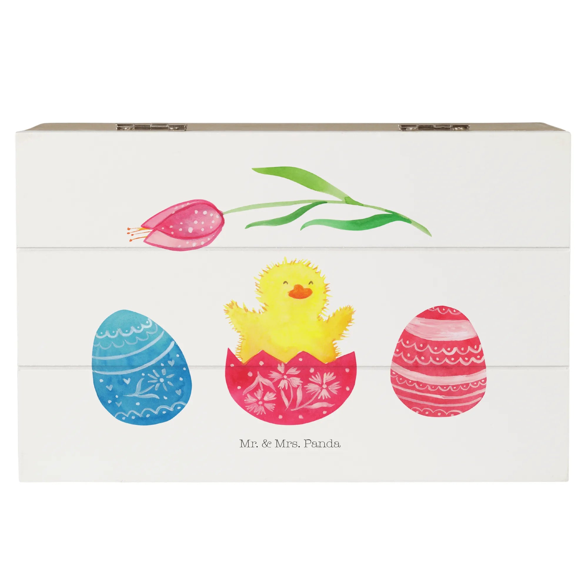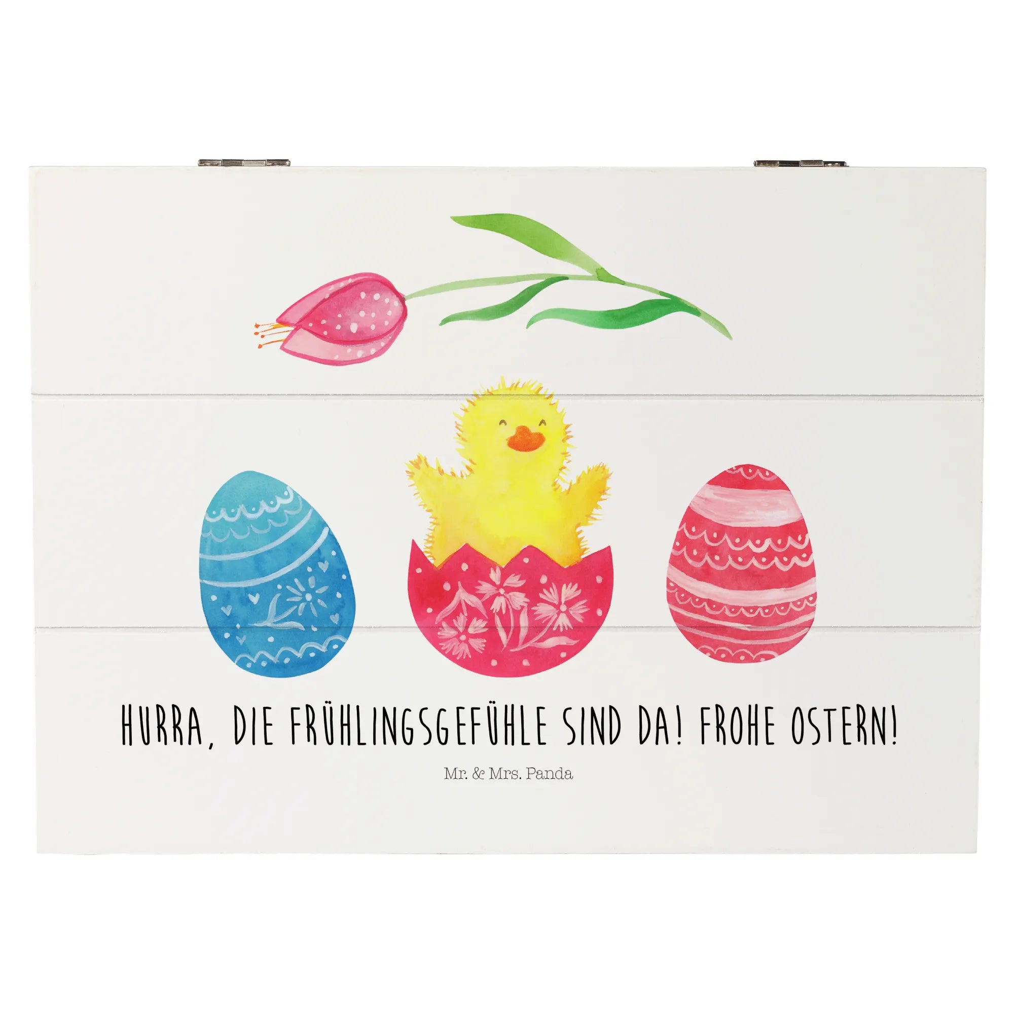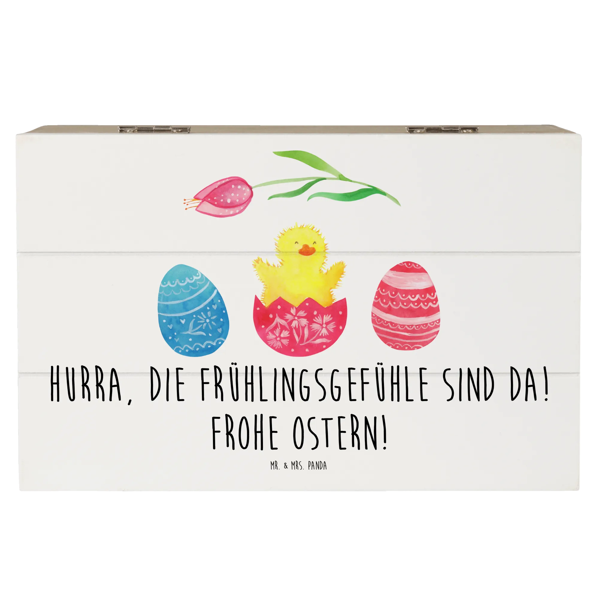Die Kiste stammt aus der liebevollen Ostern - Kollektion von Mr. & Mrs. Panda, in der Häschen, Küken und bunt bemalte Eier zu zauberhaften Motiven kombiniert werden. „Küken geschlüpft“ bringt Frühlingsgefühle direkt zu dir nach Hause und eignet sich als Geschenk für Kinder, Eltern, Großeltern sowie als besondere Verpackung für Osterpräsente.
