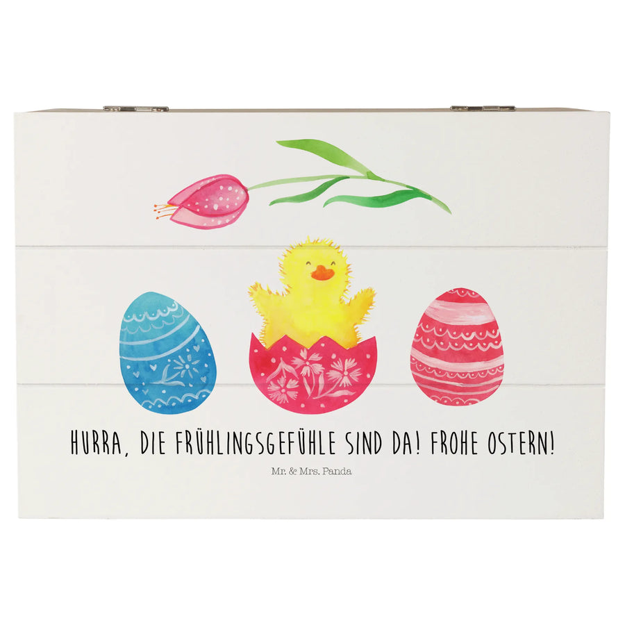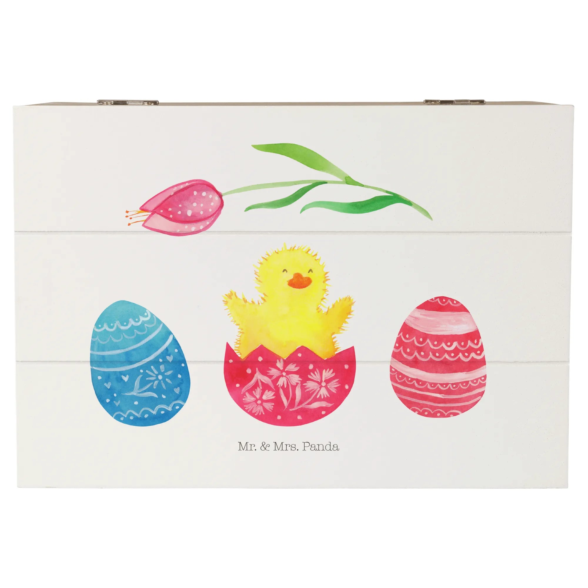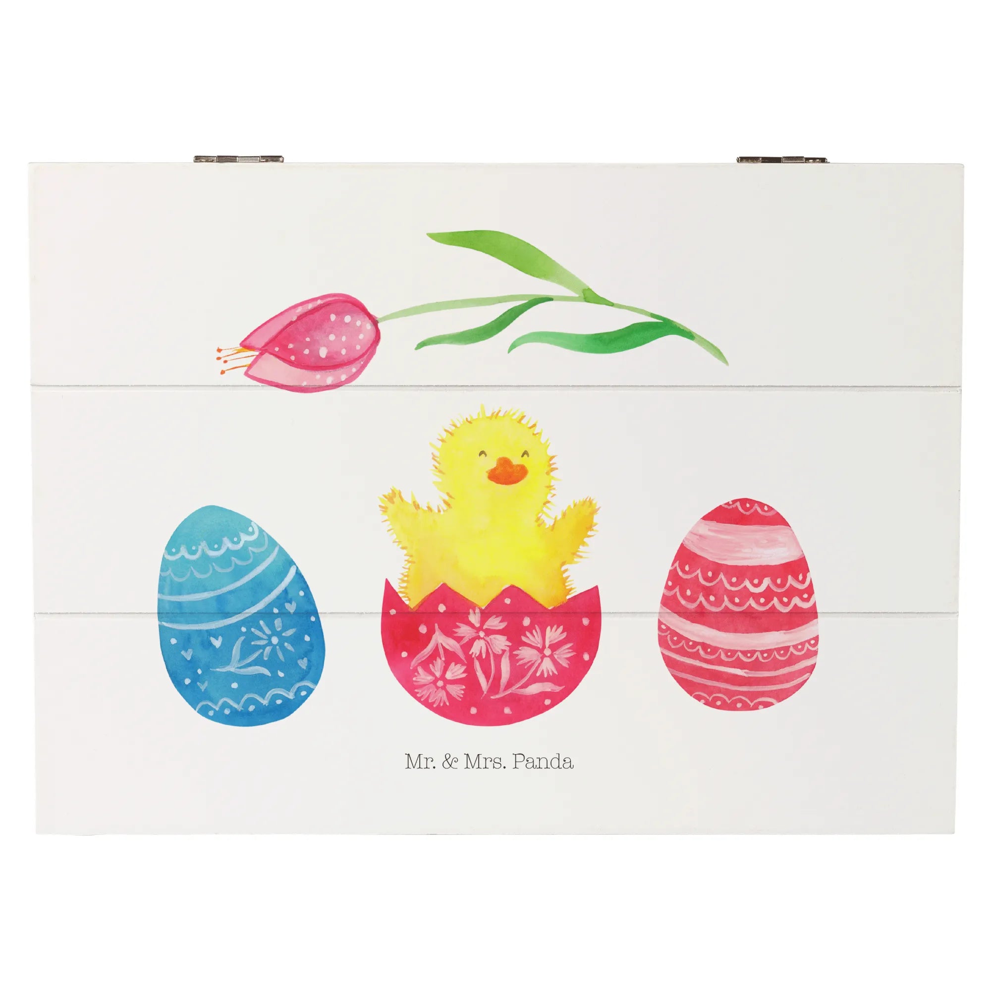 Die Kiste stammt aus der liebevollen Ostern - Kollektion von Mr. & Mrs. Panda, in der Häschen, Küken und bunt bemalte Eier zu zauberhaften Motiven kombiniert werden. „Küken geschlüpft“ bringt Frühlingsgefühle direkt zu dir nach Hause und eignet sich als Geschenk für Kinder, Eltern, Großeltern sowie als besondere Verpackung für Osterpräsente.