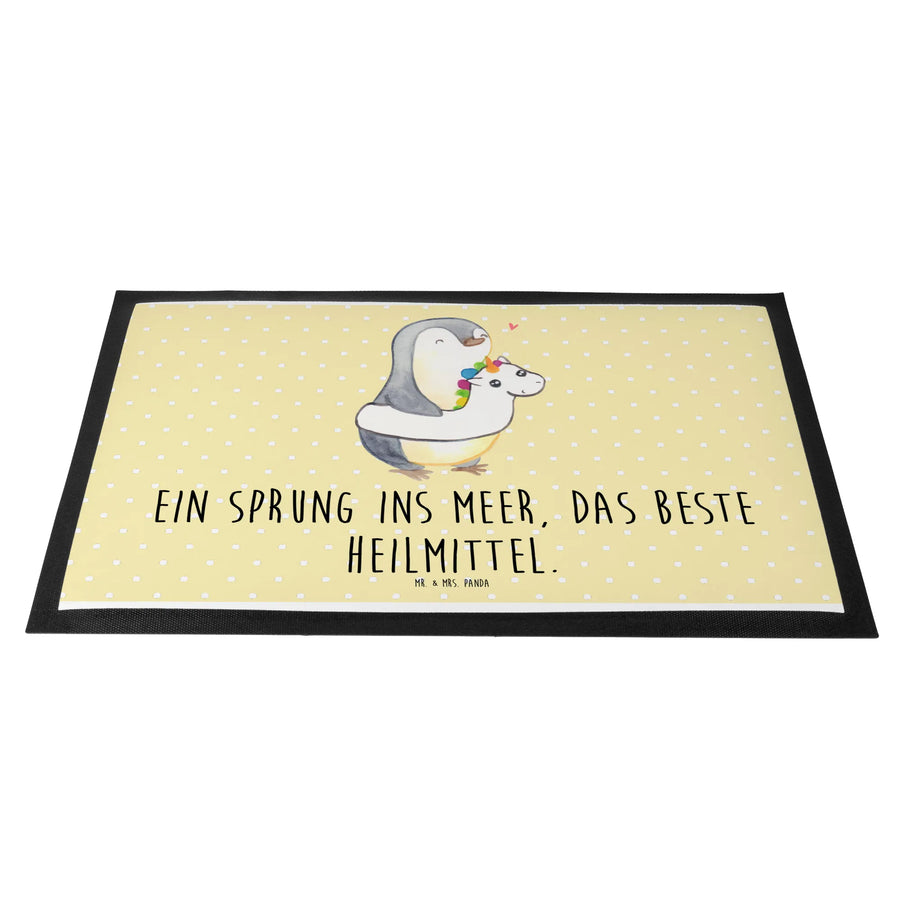 Die Fußmatte Sommer, Meer & Strand von Mr. & Mrs. Panda ist das perfekte Accessoire für jeden Eingangsbereich. Sie verbindet Funktionalität mit einem Hauch von Sommergefühl und ist nicht nur ein praktischer Schmutzfänger, sondern auch ein echter Blickfang. Mit ihrem spritzigen Design und dem liebevollen Spruch 'Ein Sprung ins Meer, das beste Heilmittel.' bringt sie das Urlaubsfeeling direkt zu dir nach Hause.