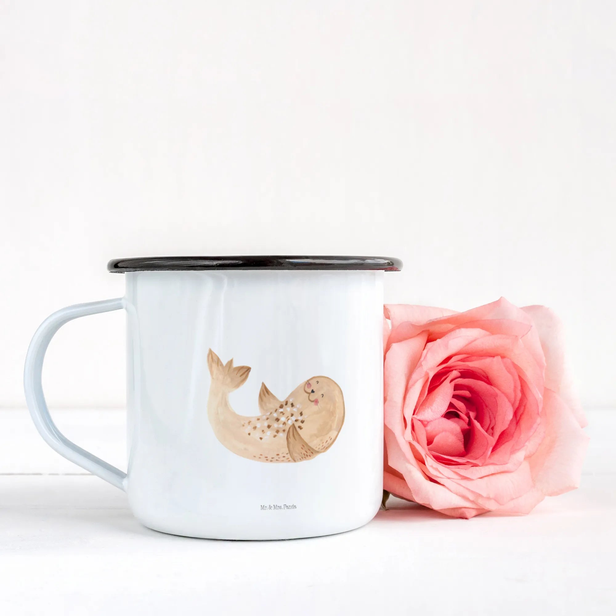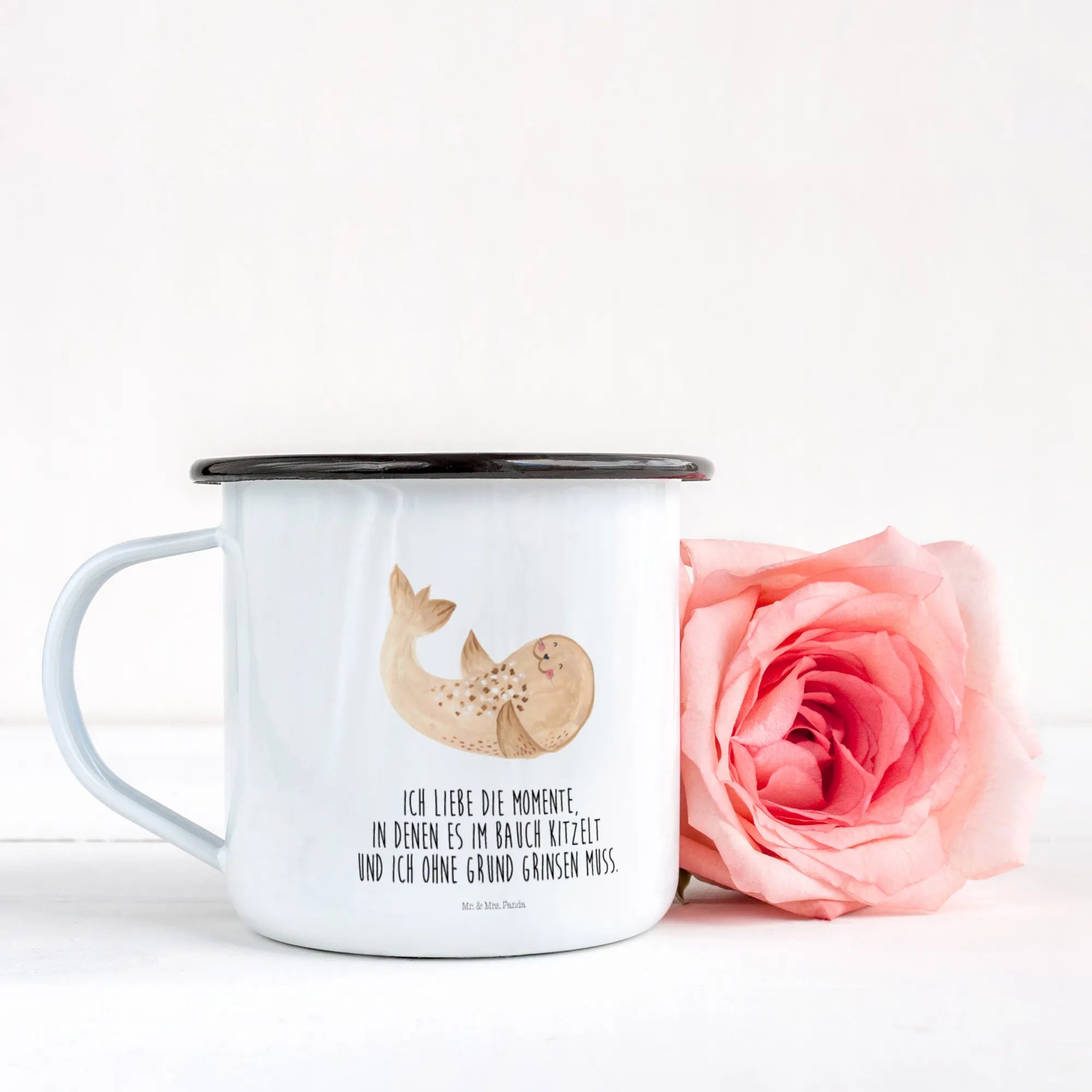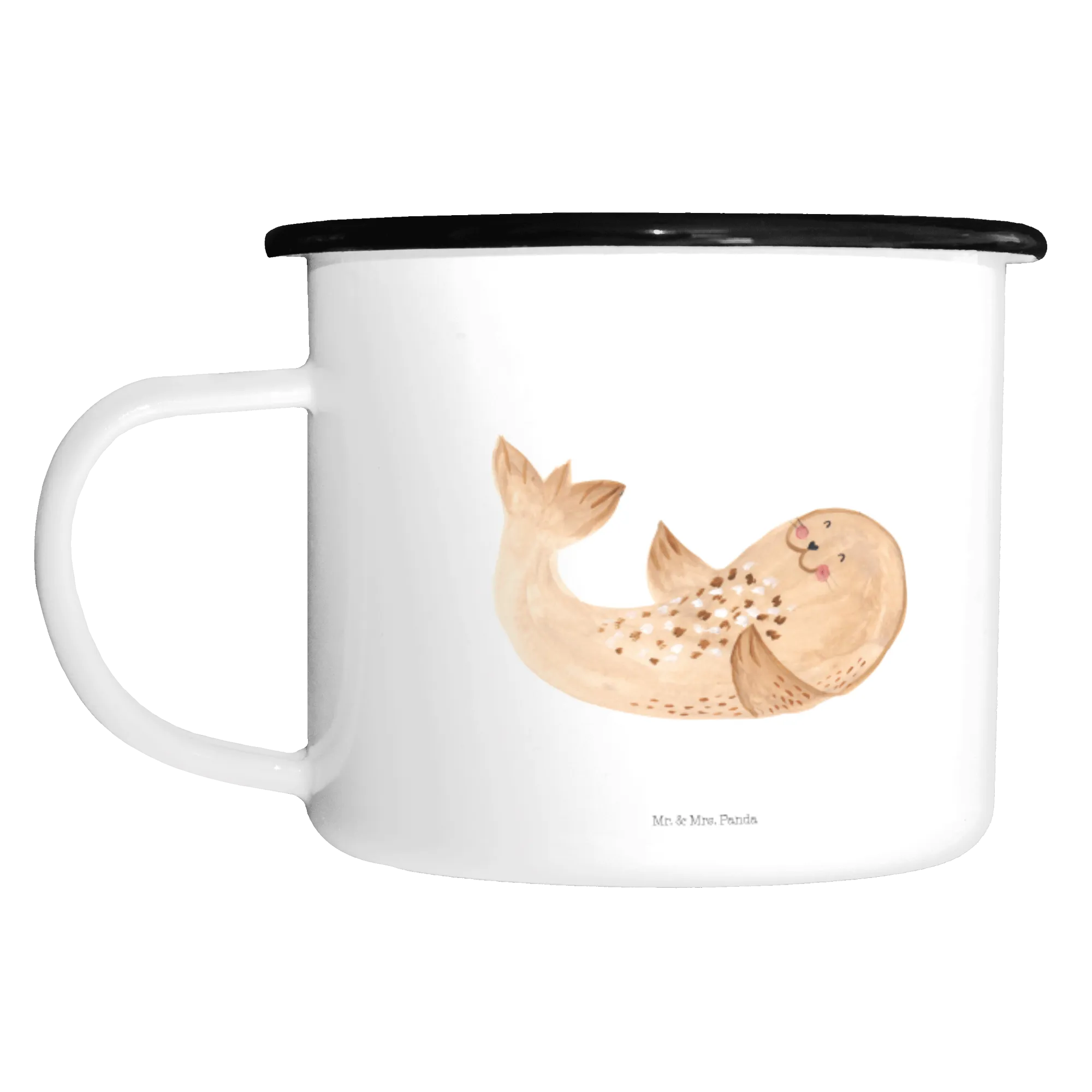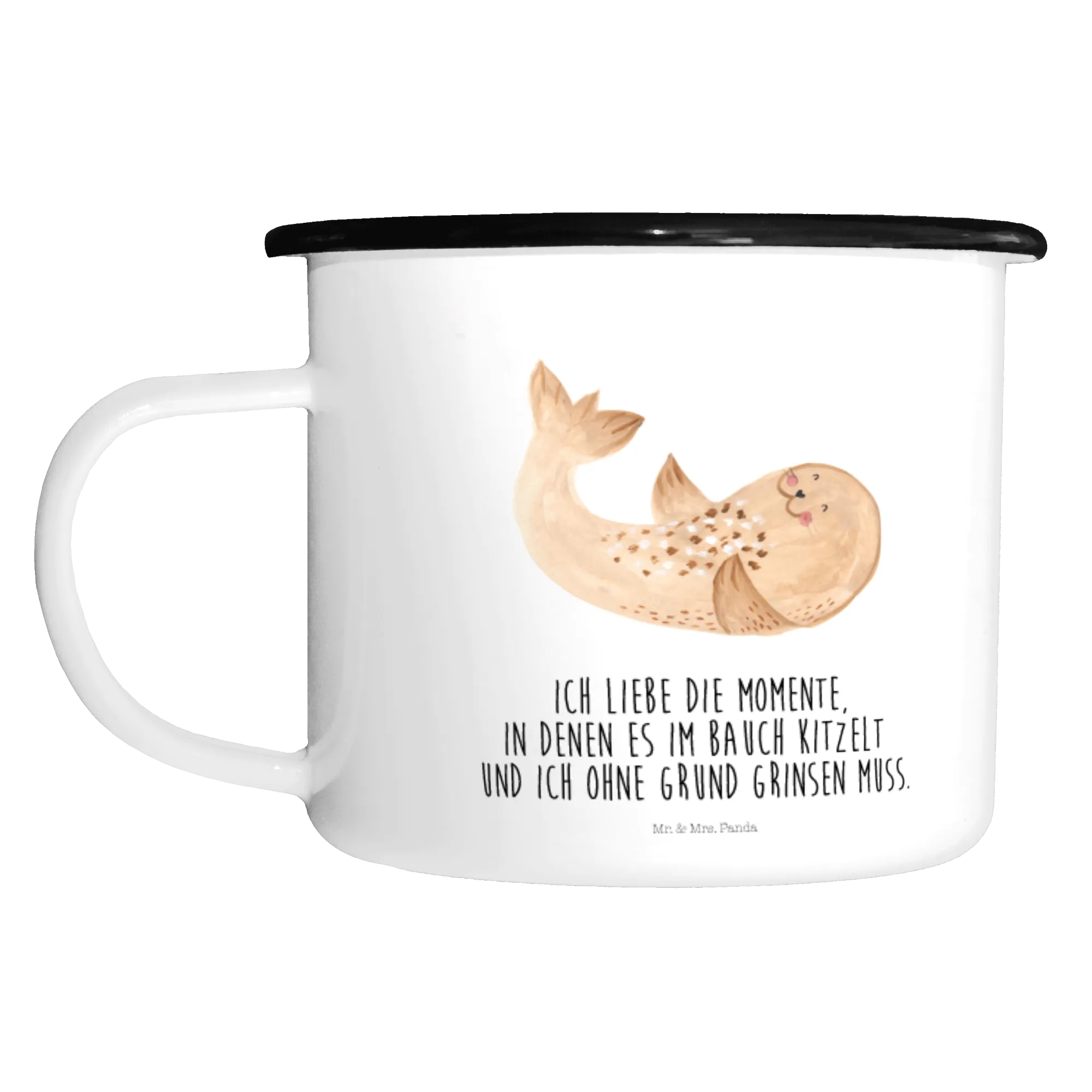 XL emaliowany kubek foka Leżeć - z napisem - biały