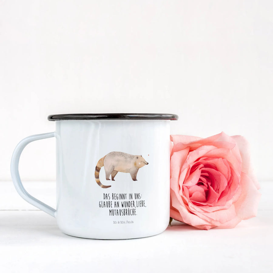 XL emaliowany kubek Koati - z napisem - biały