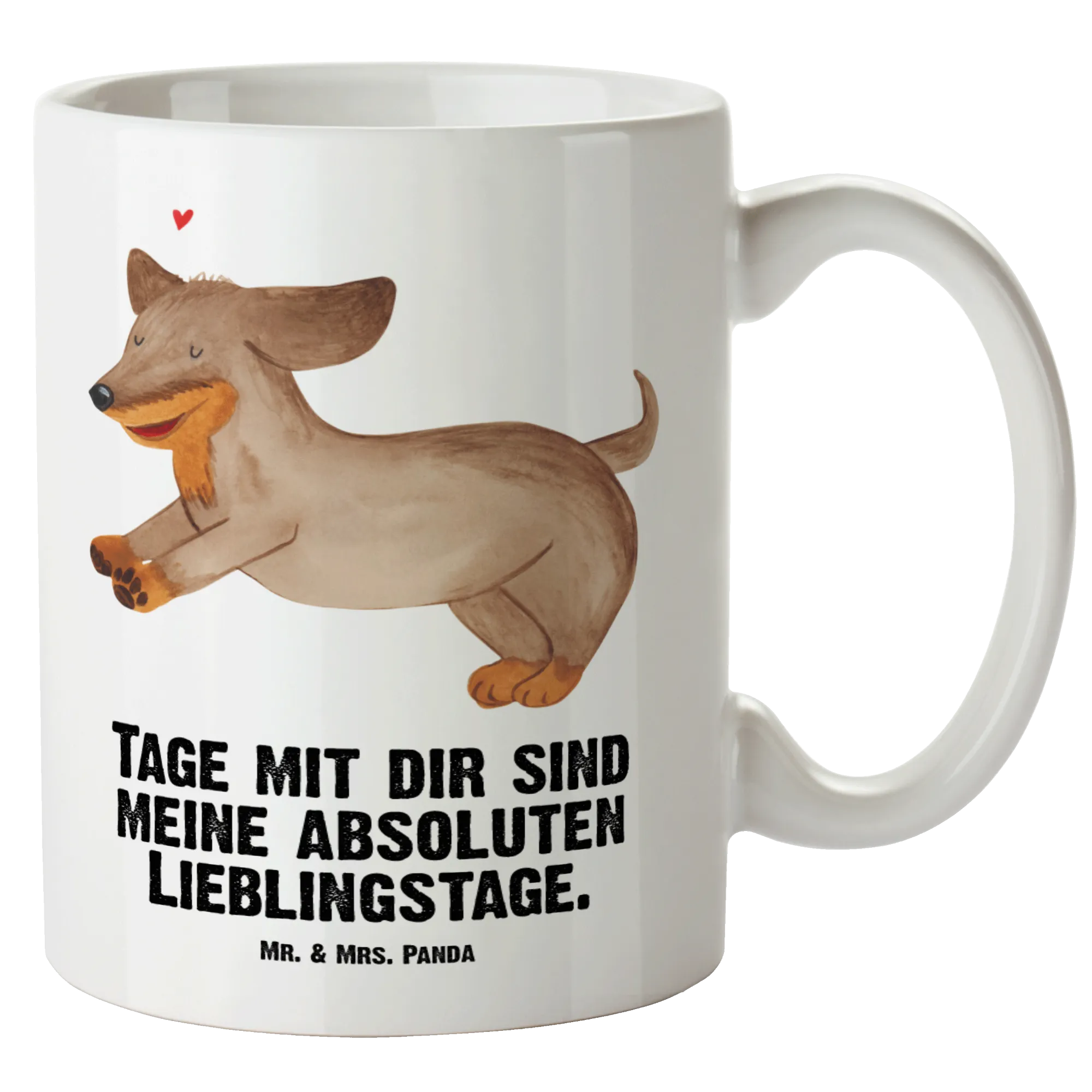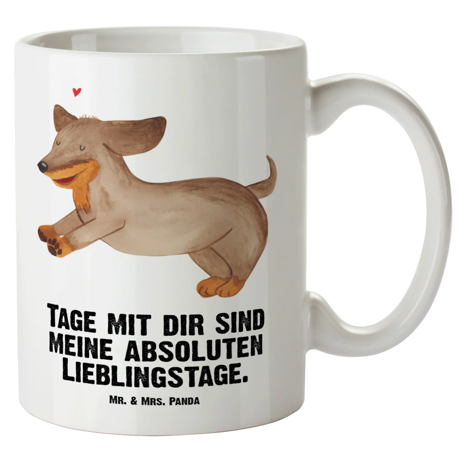 Entdecke die liebevolle XL Tasse von Mr. & Mrs. Panda mit dem fröhlichen Dackel-Motiv! Diese große Tasse ist perfekt für alle, die ihre Kaffeepause mit einem Lächeln genießen möchten. Das niedliche Design zeigt einen glücklichen Dackel, der fröhlich durch die Gegend springt – genau das richtige für Hundeliebhaber und Dackelbesitzer.