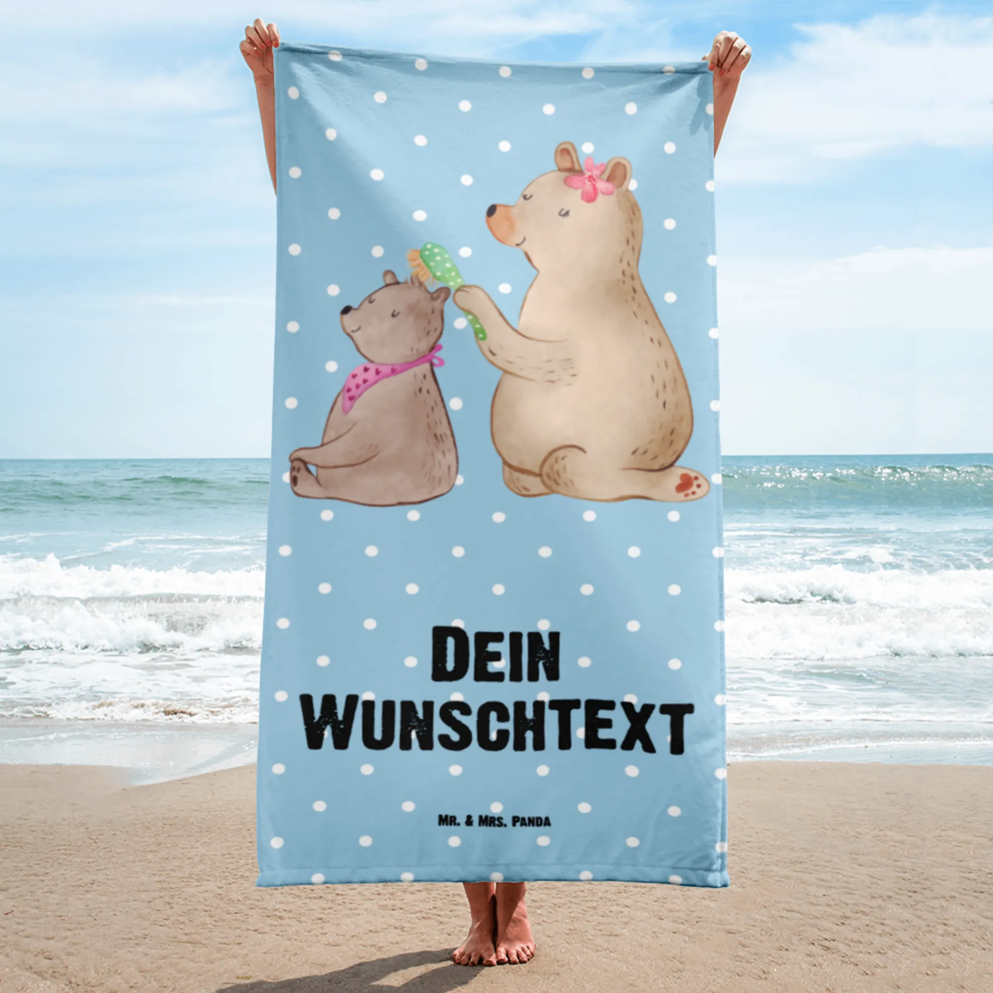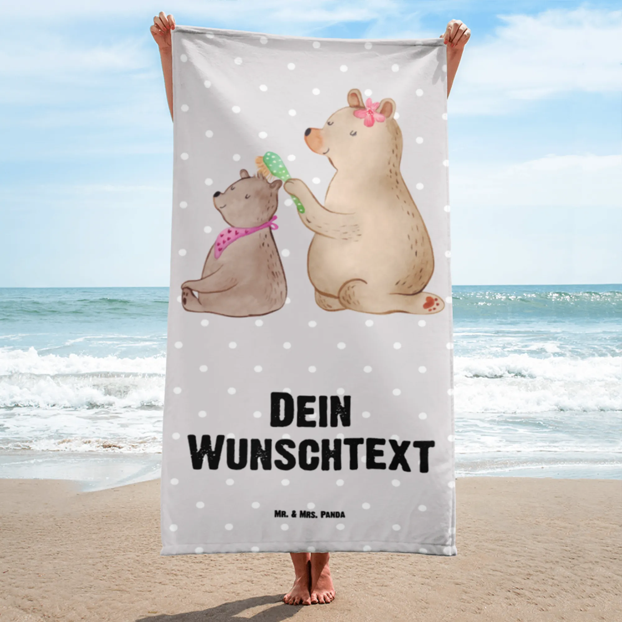 Das Handtuch ist nicht nur ein wunderschönes Accessoire für den Strand oder das Schwimmbad, sondern auch ein echtes Unikat, da es mit dem Namen deiner Wahl personalisiert werden kann. Das knuffige Motiv zeigt einen großen Bären, der liebevoll das Fell eines kleinen Bären kämmt. Diese bildhafte Darstellung von Fürsorge und Zuneigung ist nicht nur niedlich, sondern spiegelt auch die innige Bindung zwischen Mutter und Kind wider.