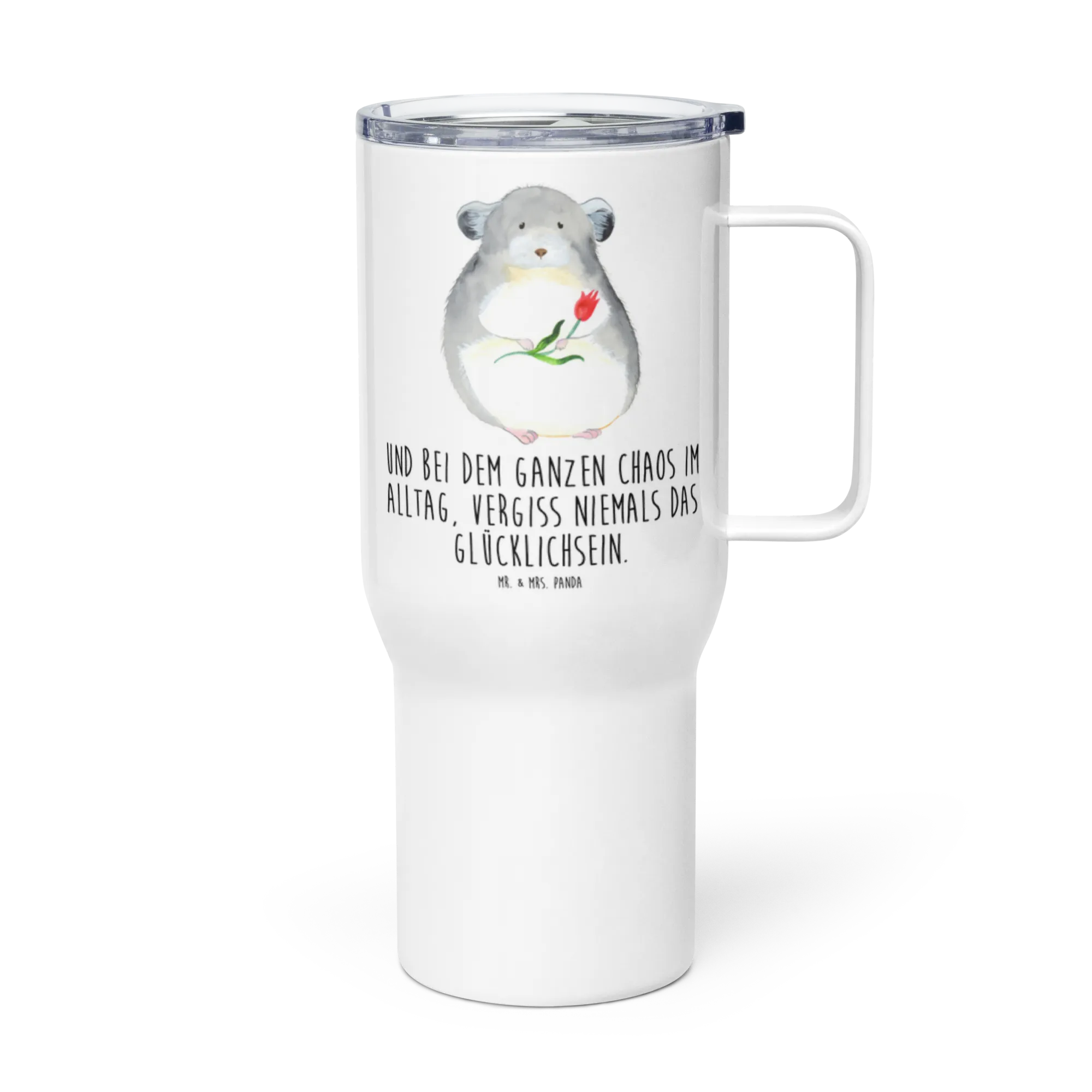 Dieser große Reisebecher ist mehr als nur ein Autobecher – er ist ein täglicher Glücksbringer. Das niedliche Chinchilla mit Blumenstrauß und der liebevolle Spruch „Und bei dem ganzen Chaos im Alltag, vergiss niemals das Glücklichsein.“ zaubern dir bei jedem Schluck ein Lächeln ins Gesicht. Ideal für den Büroalltag, die Fahrt zur Arbeit oder gemütliche Spaziergänge.