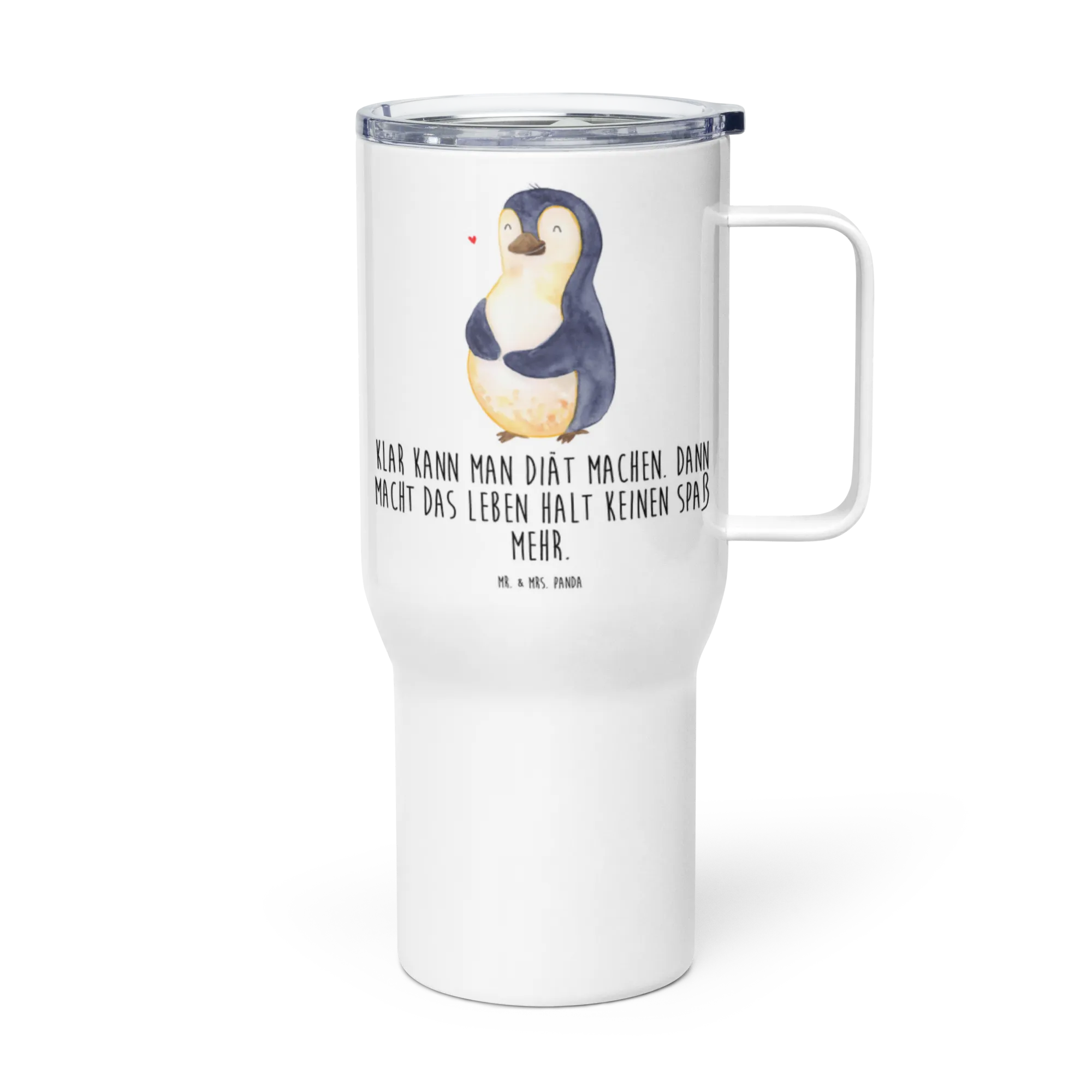 Dieser bezaubernde Reisebecher ist nicht nur ein praktischer Begleiter im Alltag, sondern auch ein motivierendes Accessoire, das bei jeder Diät zur guten Laune beiträgt. Bedruckt mit einem super süßen Pinguin, der genießerisch über seinen dicken Bauch streicht und dem Spruch "Klar kann man Diät machen. Dann macht das Leben halt keinen Spaß mehr." bringt er sicher ein Lächeln in die Gesichter deiner Liebsten. Er erinnert daran, dass man auch ohne strenge Regeln und Vorschriften das Leben genießen kann.